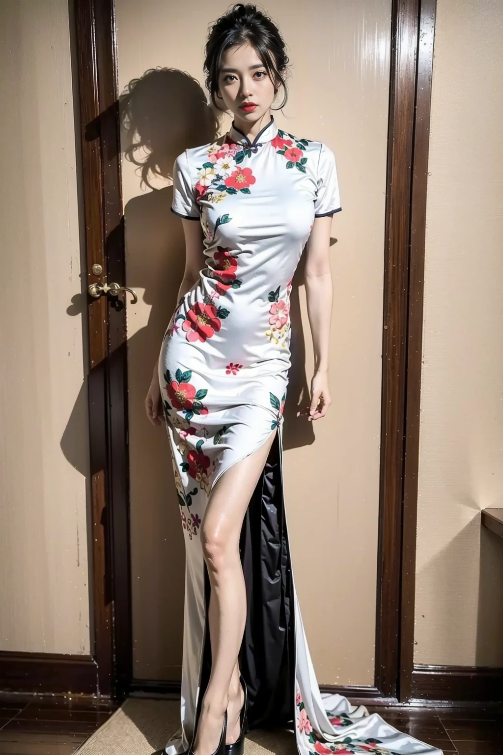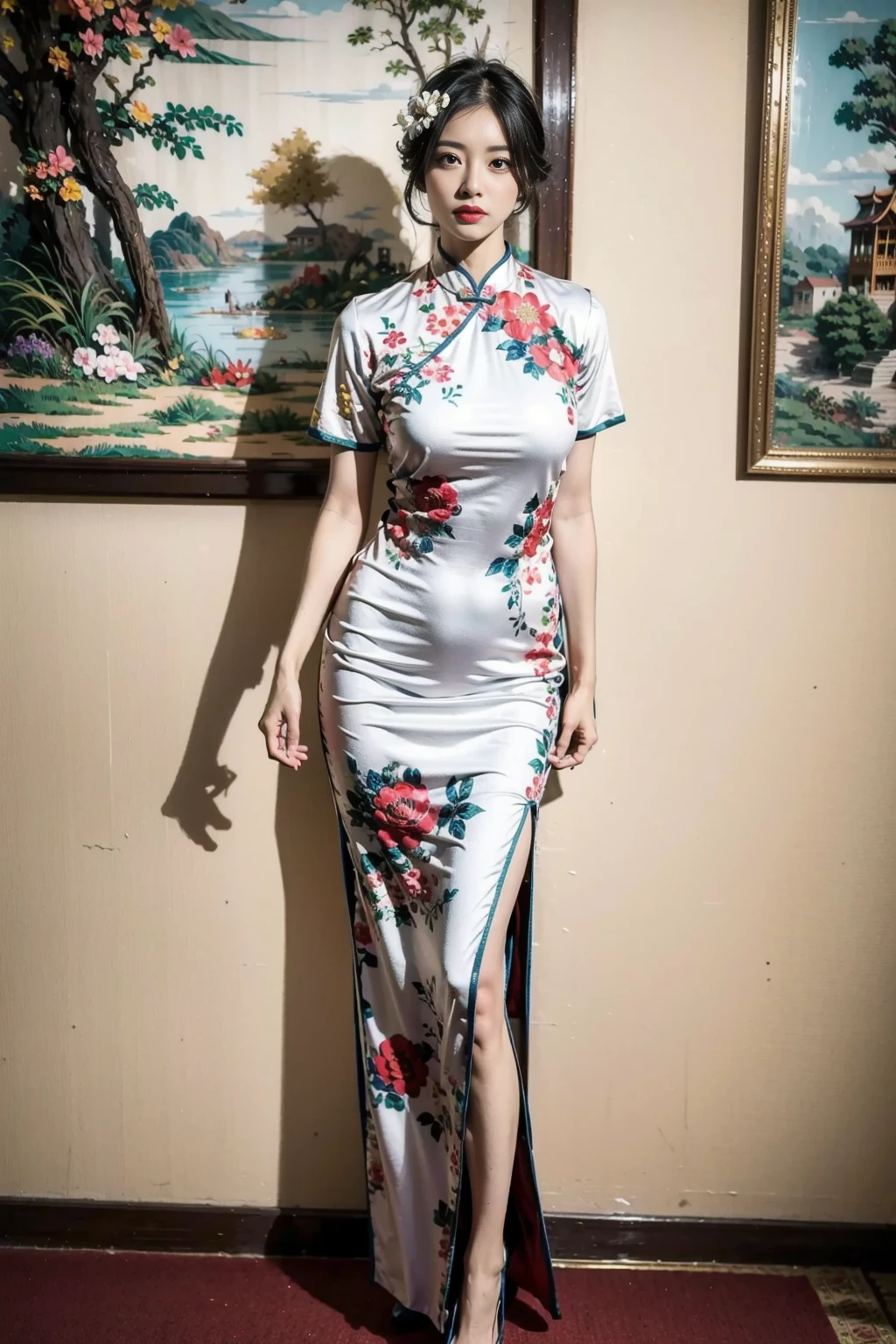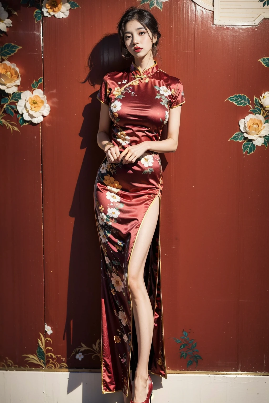 Example image prompt words: zgqp, 1girl,red chinese clothes, black hair, red china dress, high heels, side slit, black footwear, full body, short sleeves, solo, floral print, looking at viewer, ((red dress)), standing, breasts, flower, red lips,Flower background.
