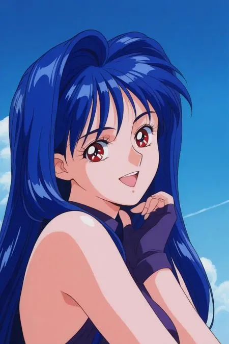 fancy_lala,1girl,blue hair,long hair,dress,bare shoulders,fingerless gloves
