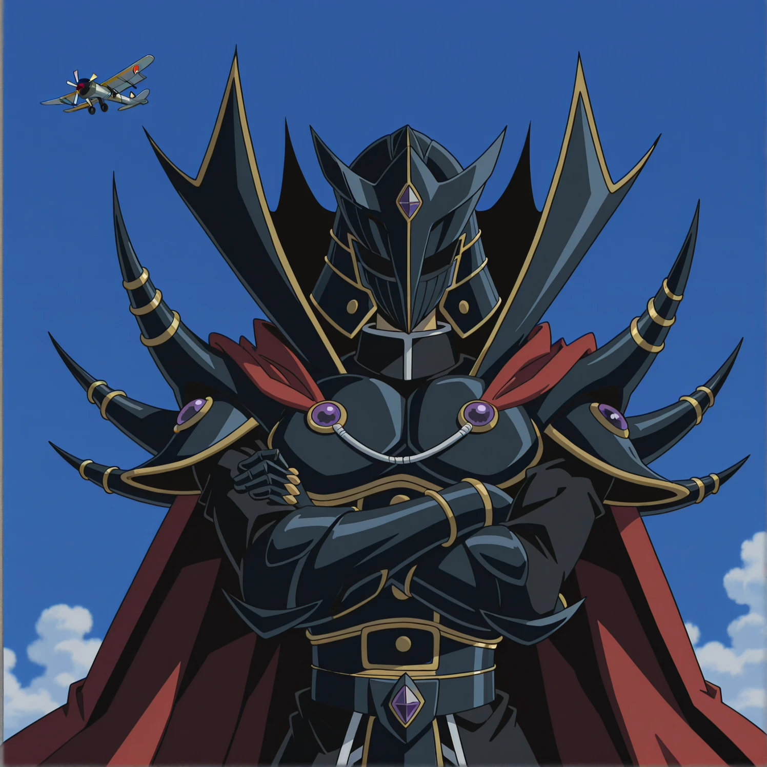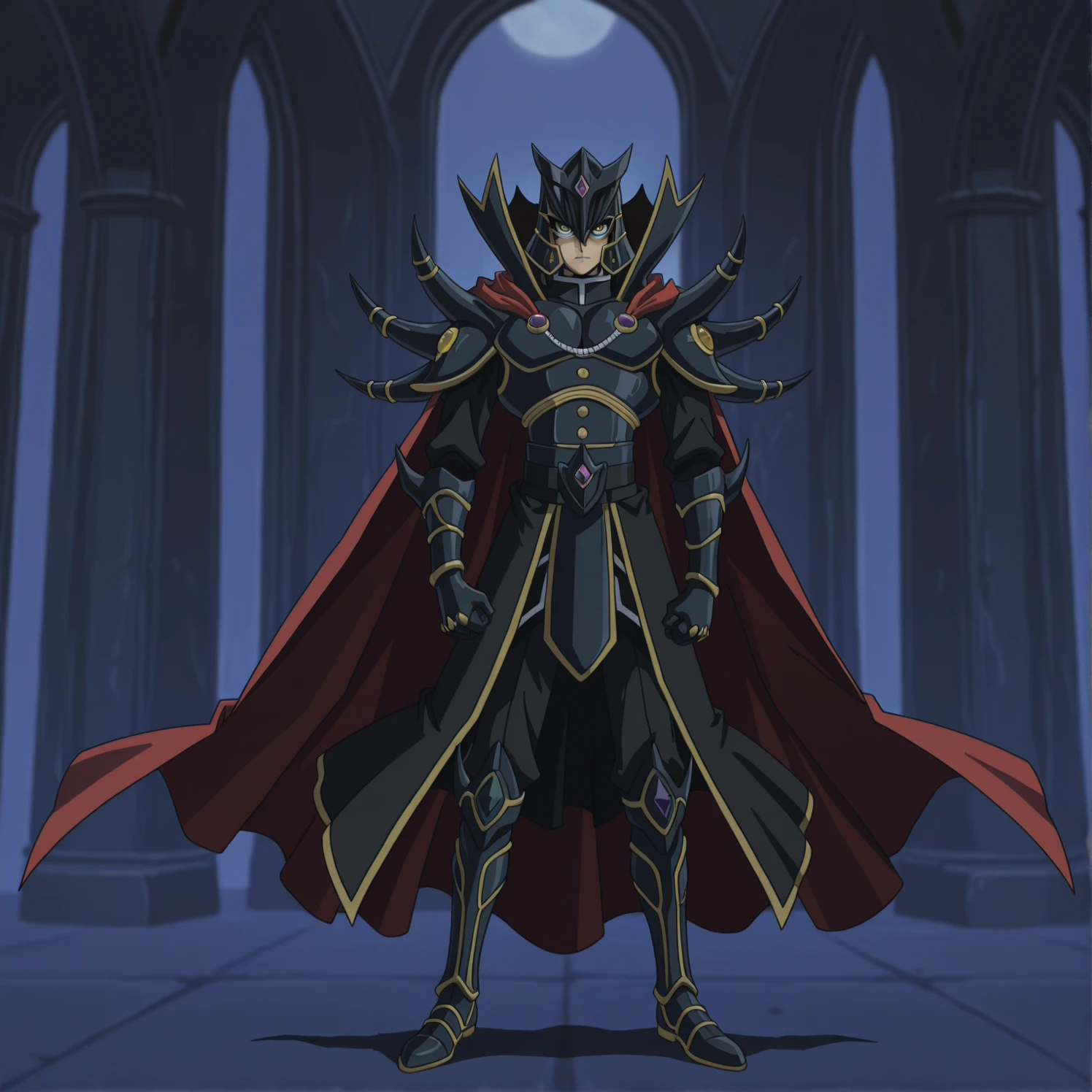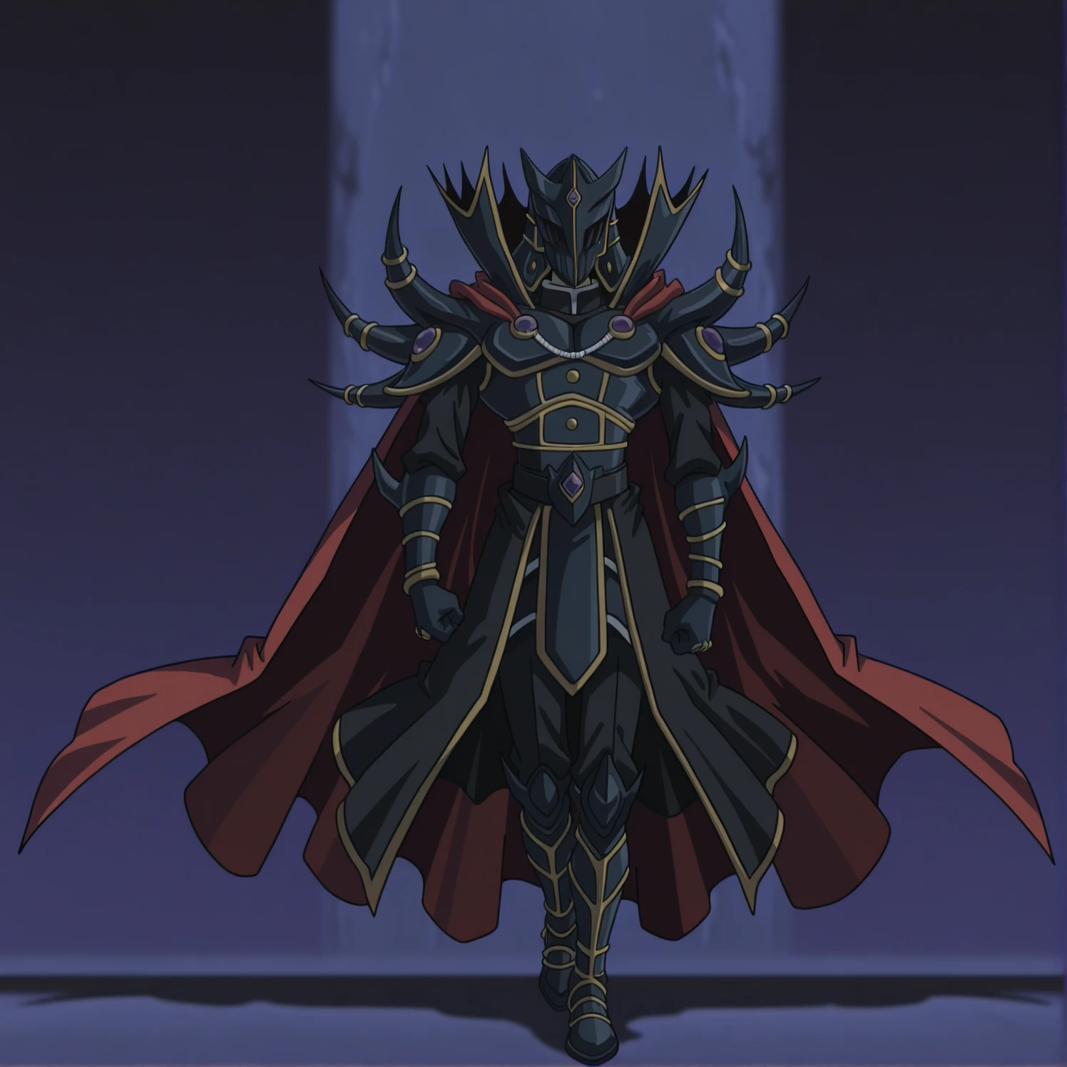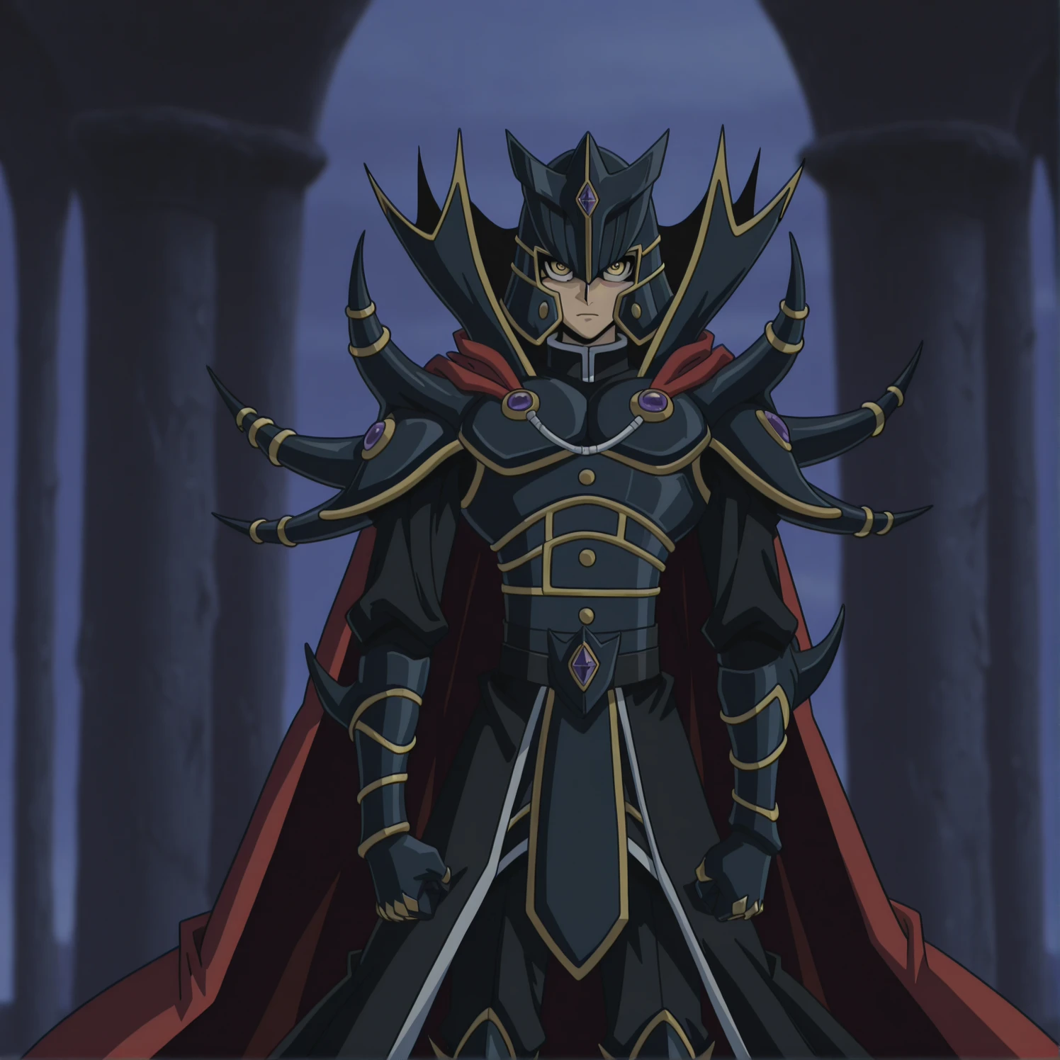 yellow eyes, black helmet, black armor, red cape,