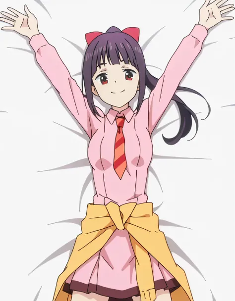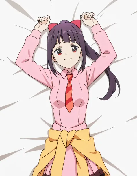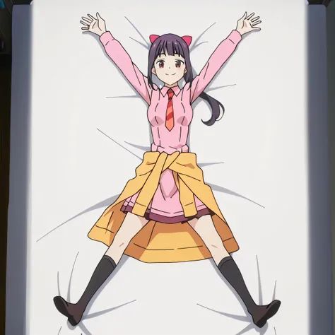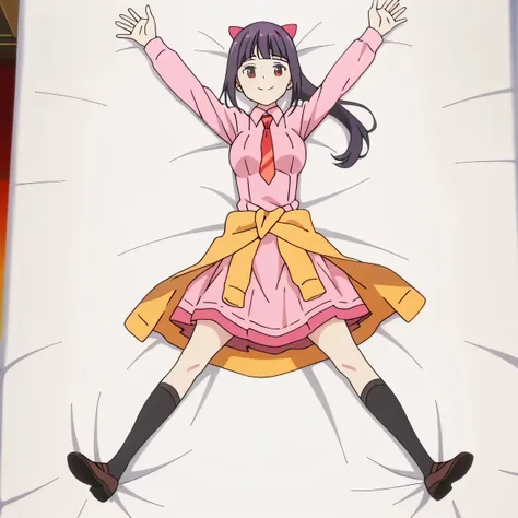 black socks, clothes around waist, hair bow, long hair red necktie, school uniform, pink dress