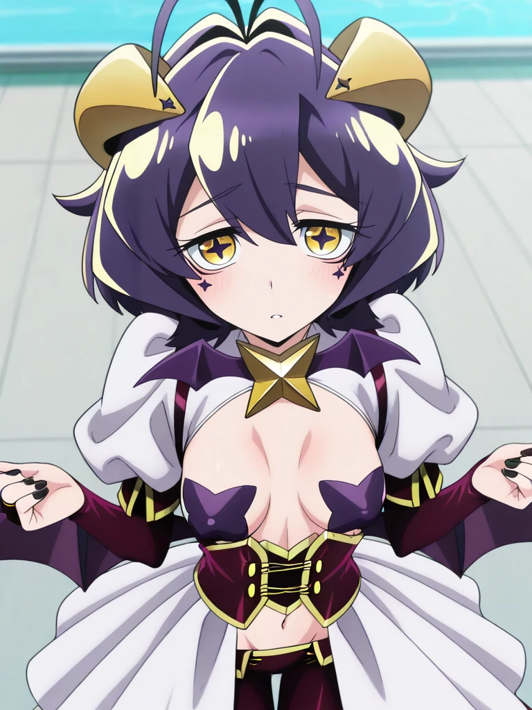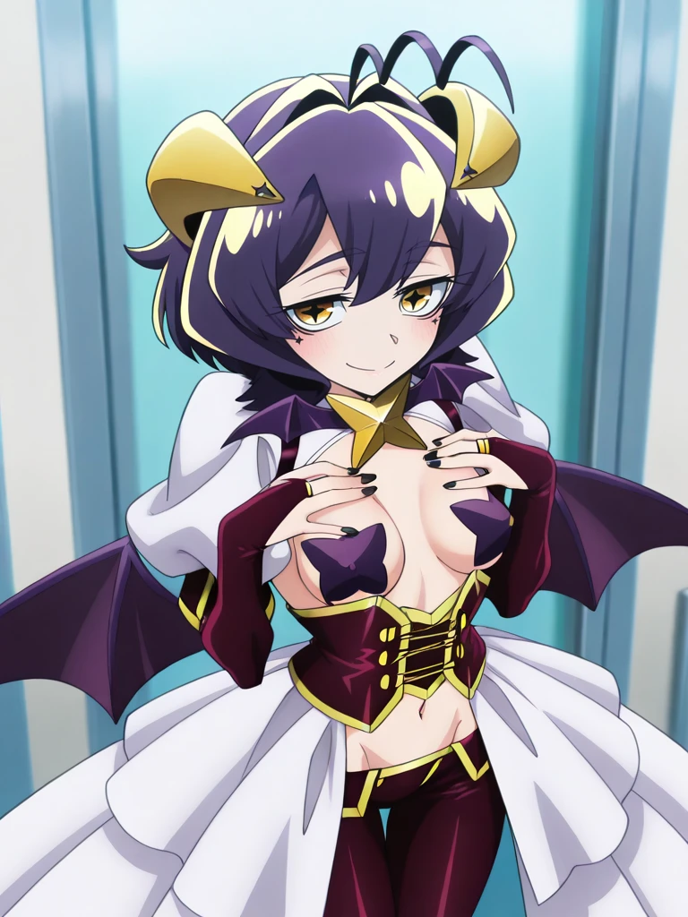 magiaBaiserdress,yellow demon horns,star \(symbol\), symbol-shaped pupils, puffy sleeves,shrug \(clothing\), star pasties, breasts, cleavage,corset,bat wings,purple elbow gloves, purple bridal gauntlets, midriff,navel,corset, white showgirl skirt,purple lowleg pants,black nails,