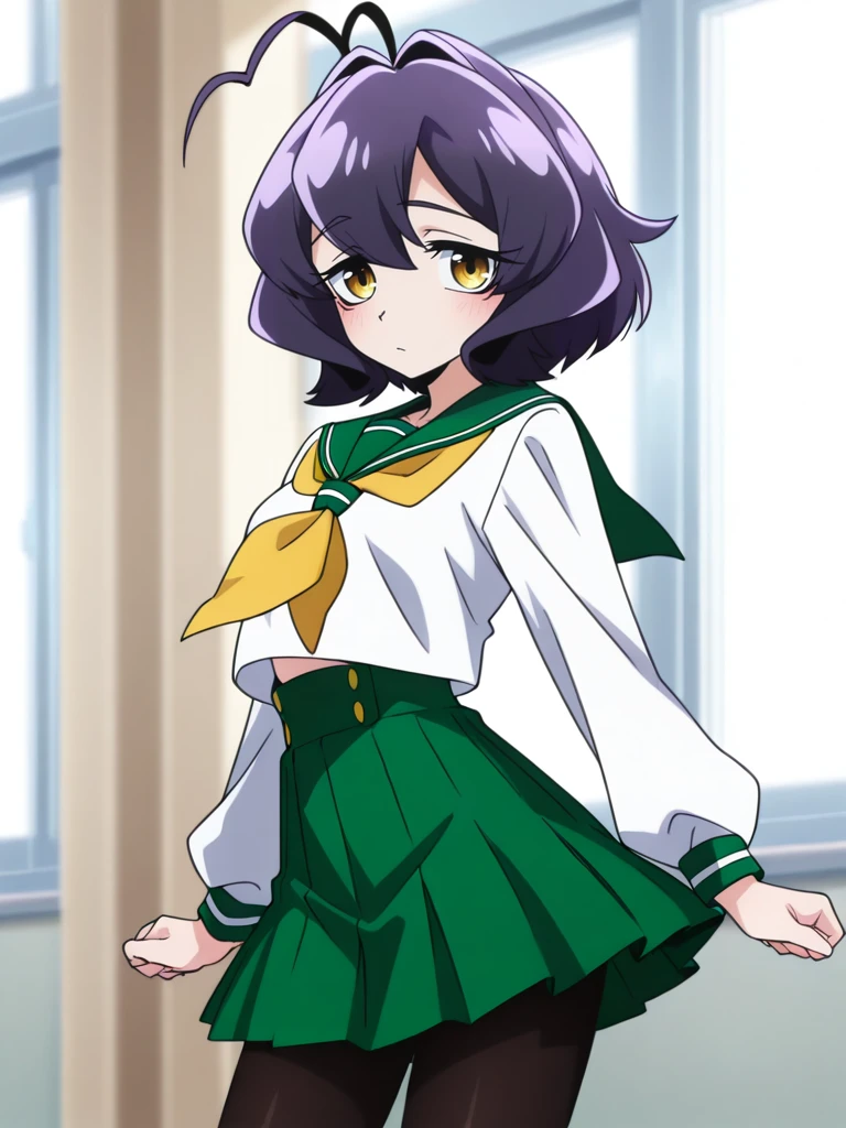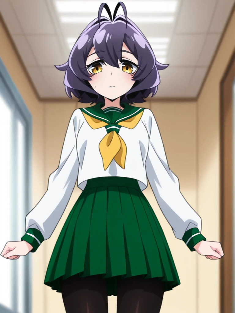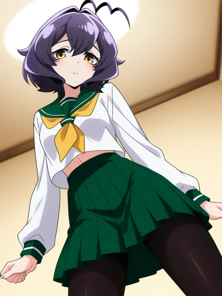utenaschool,school uniform,serafuku,green sailor collar, yellow neckerchief, white long sleeves,green pleated skirt, black pantyhose,