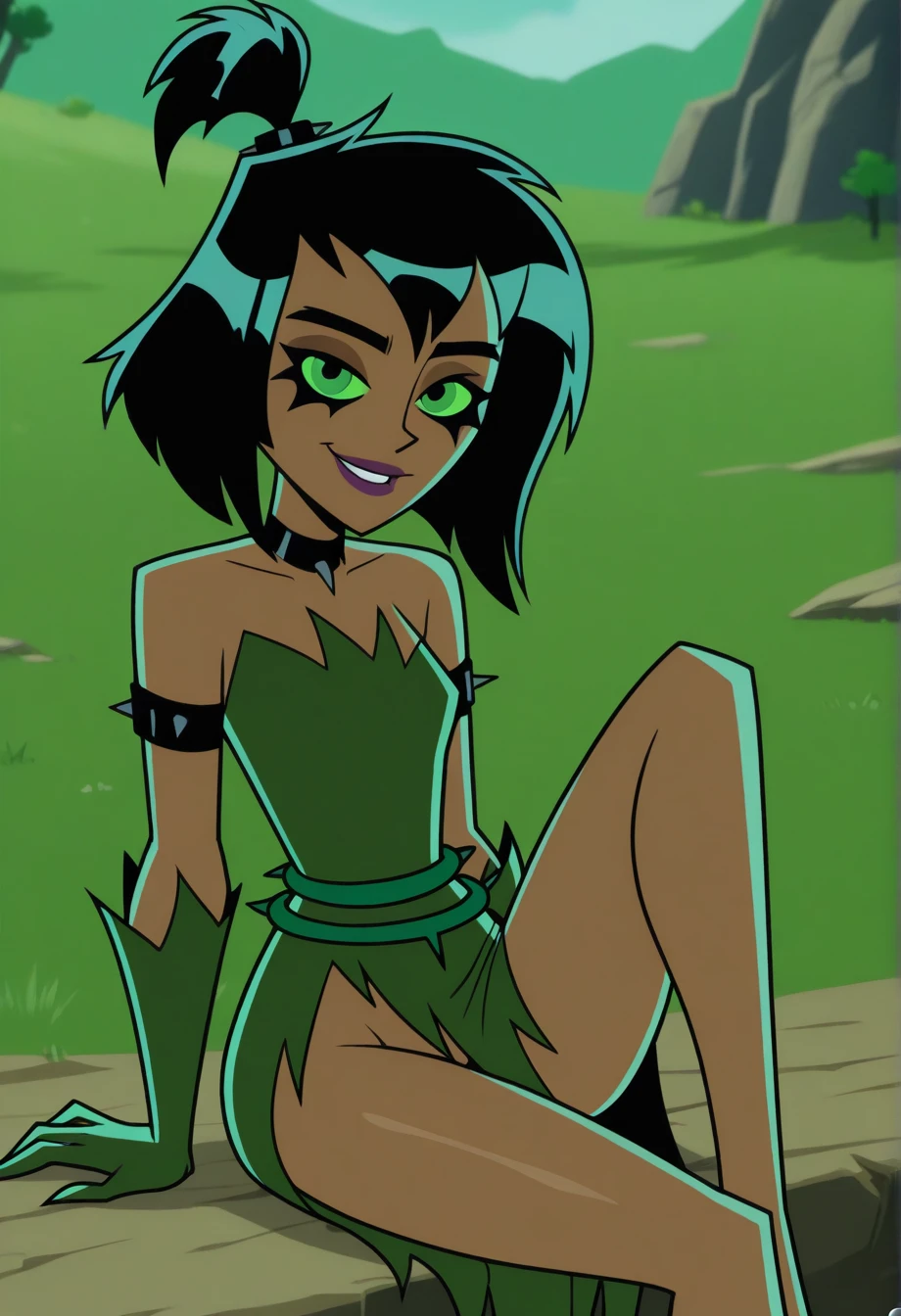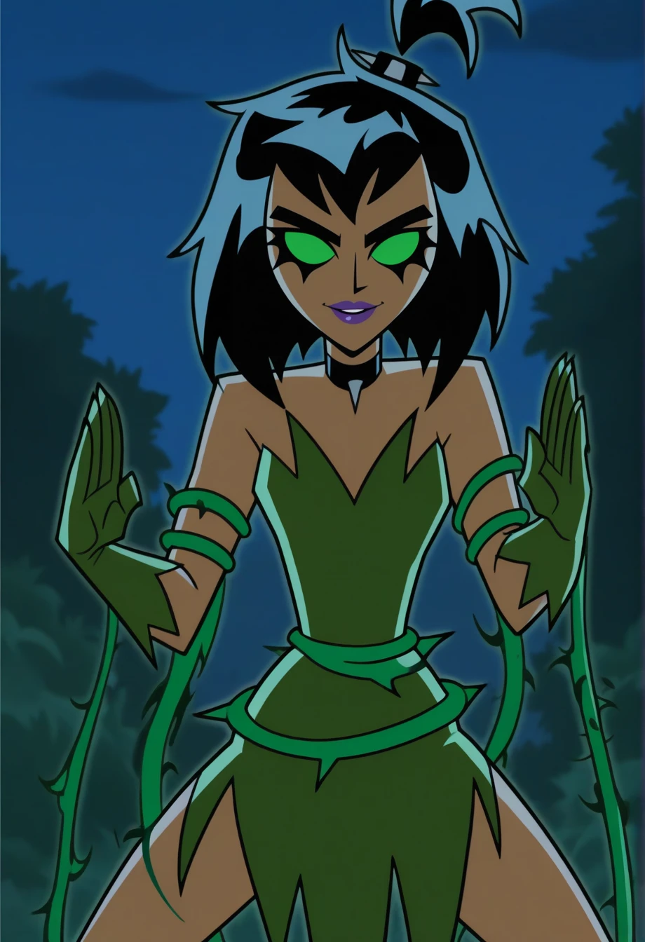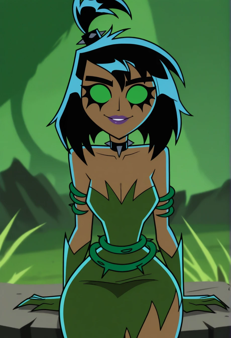 samuj, black hair, blank eyes, green sclera, green dress, purple lips, cartoon screencap
