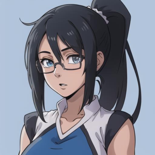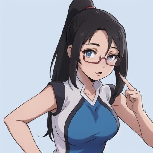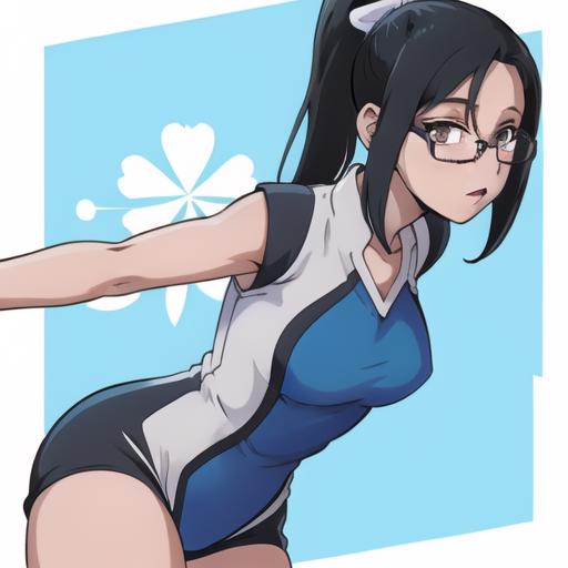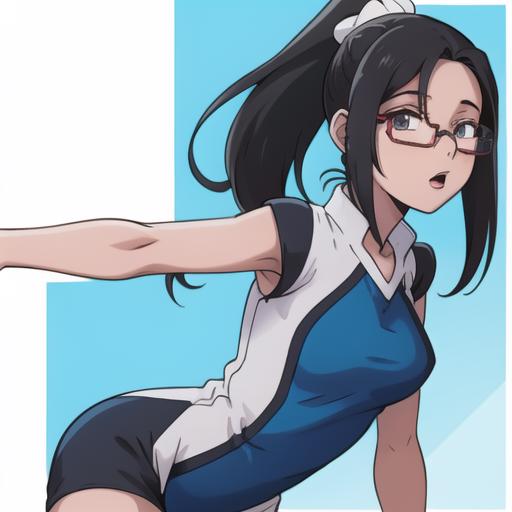 Izumi Riko: dark long hair, ponytail, glasses