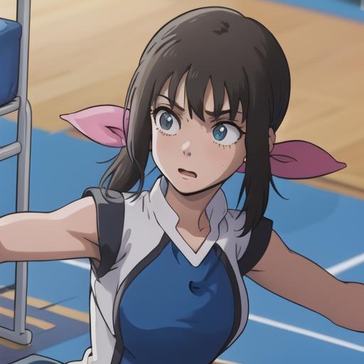 Hanesaki Ayano: dark tied hair, ribbon, bangs
