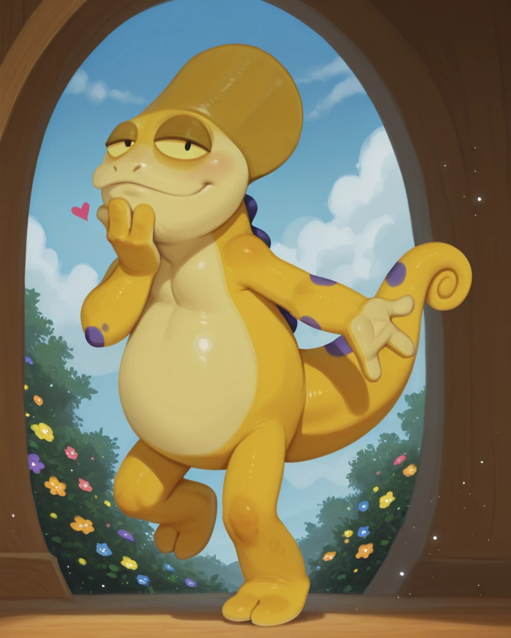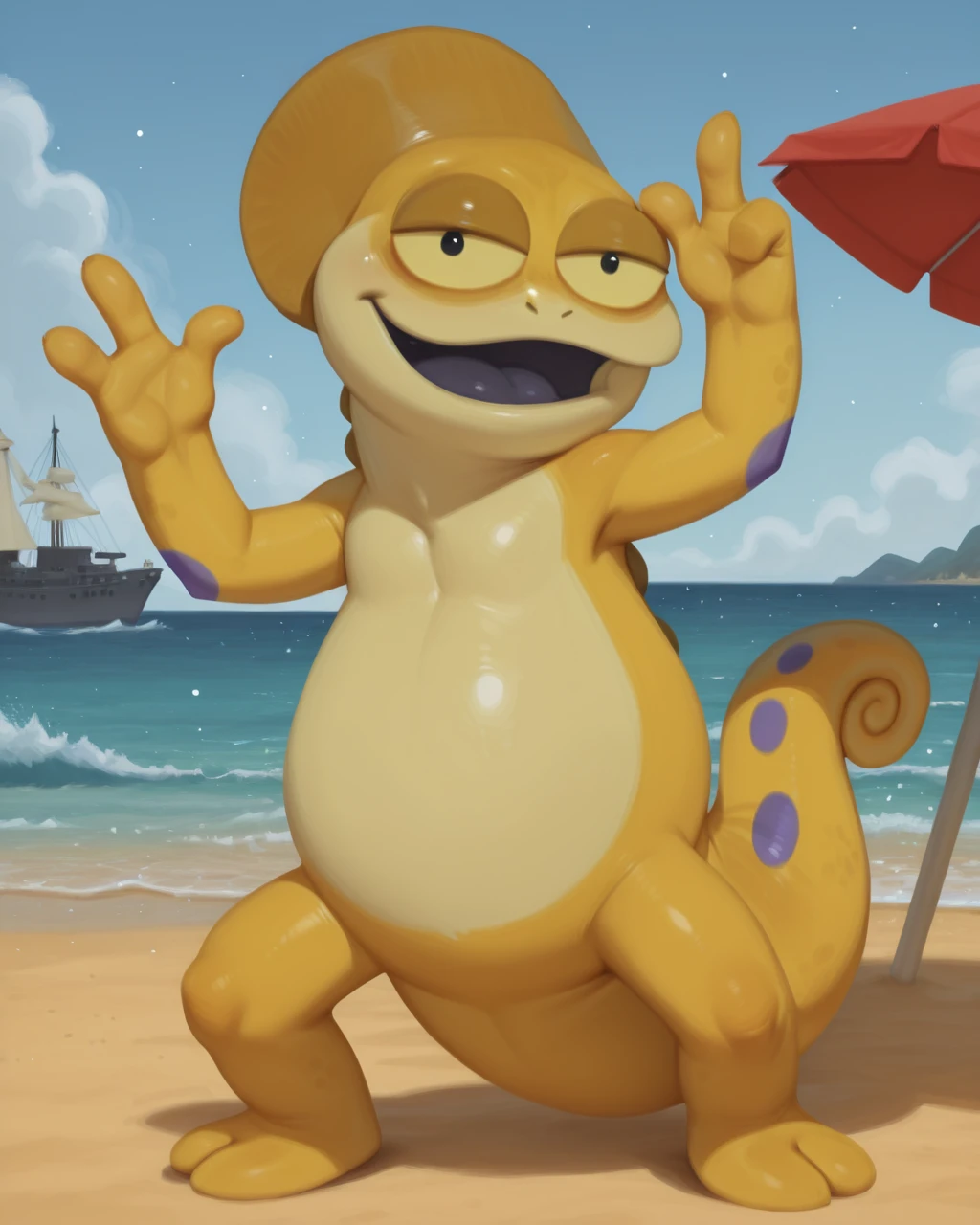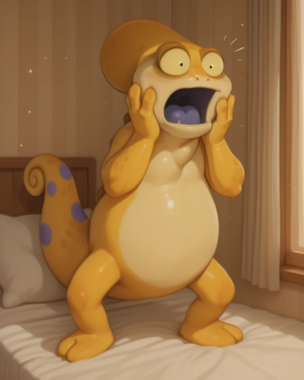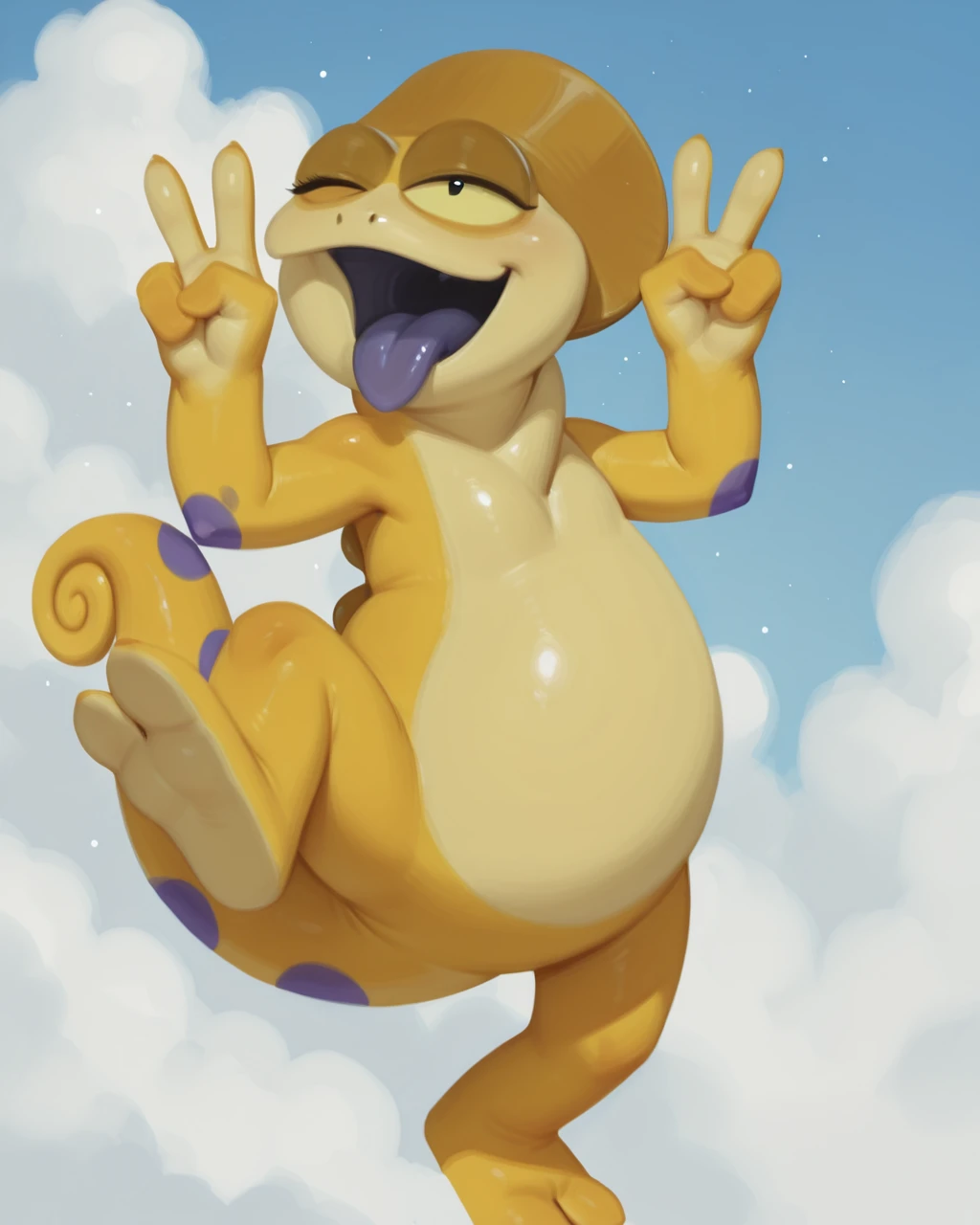 KayoChamel TabalCartIL, chameleon, yellow scales, yellow sclera, black eyes, tail, purple spots, short, two fingers legs , no human, solo,