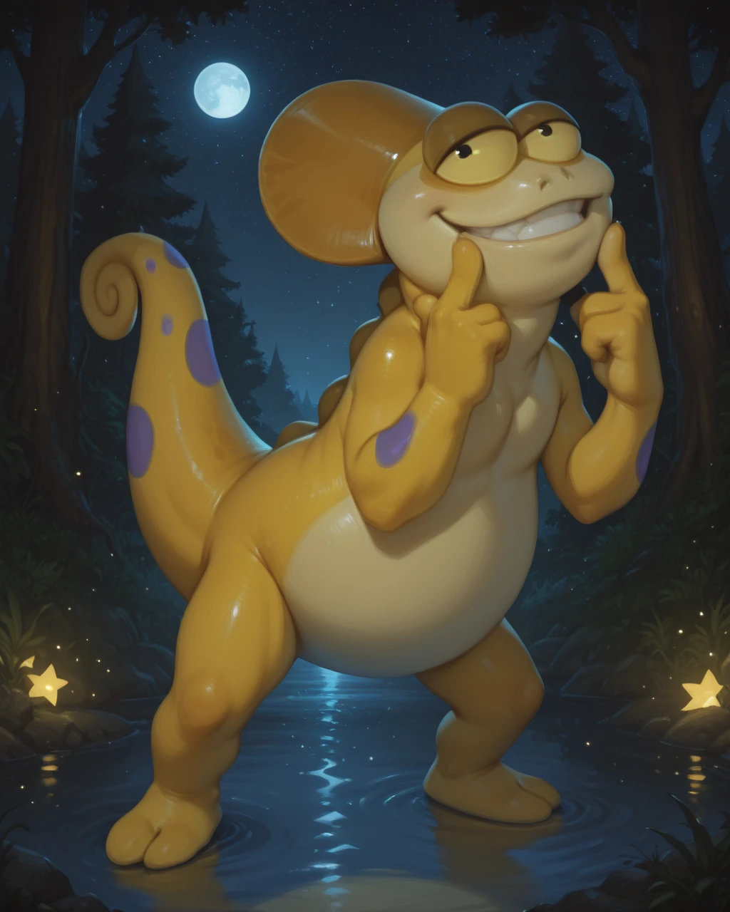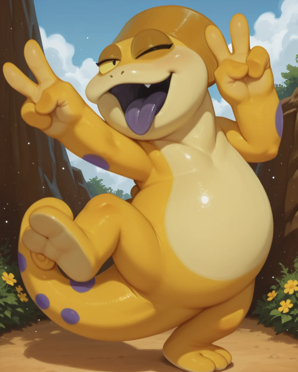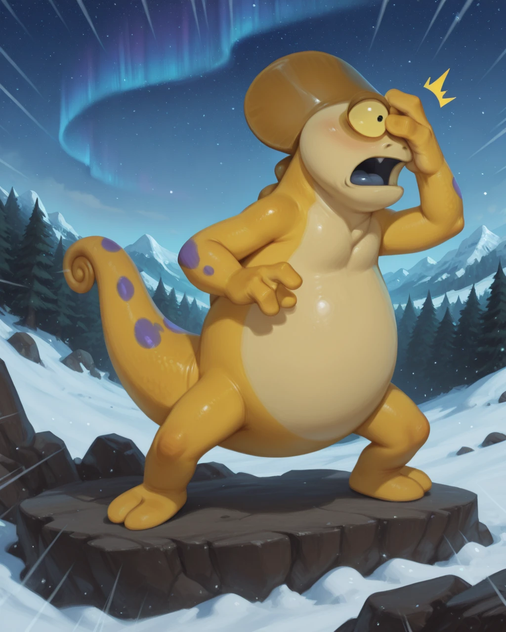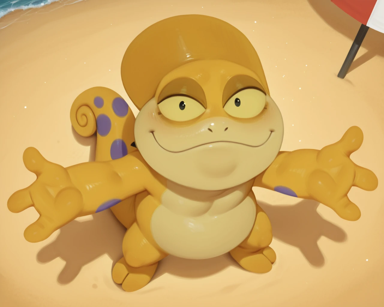 KayoChamel TabalCartIL, chameleon, yellow scales, yellow sclera, black eyes, tail, purple spots, short, two fingers legs , no human, solo,