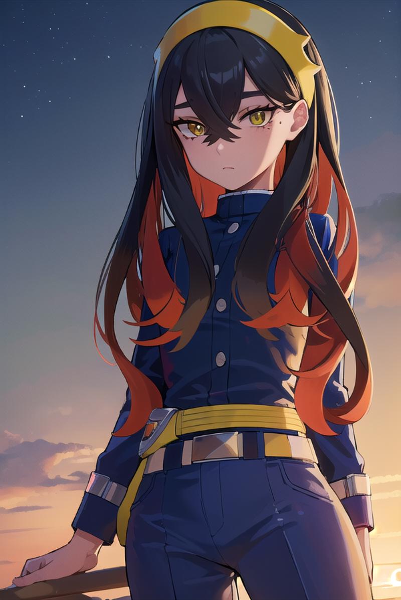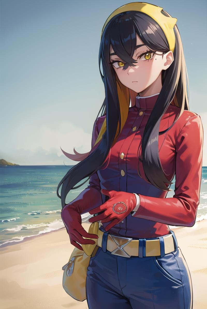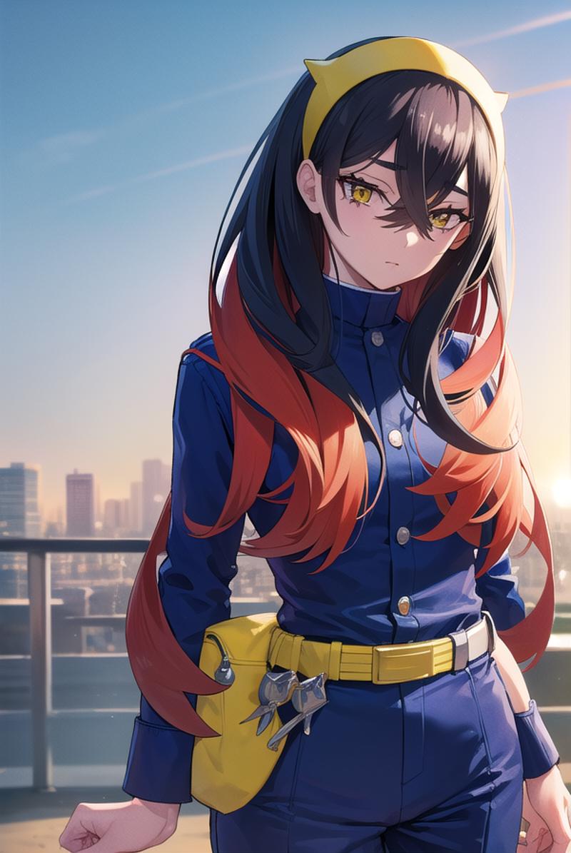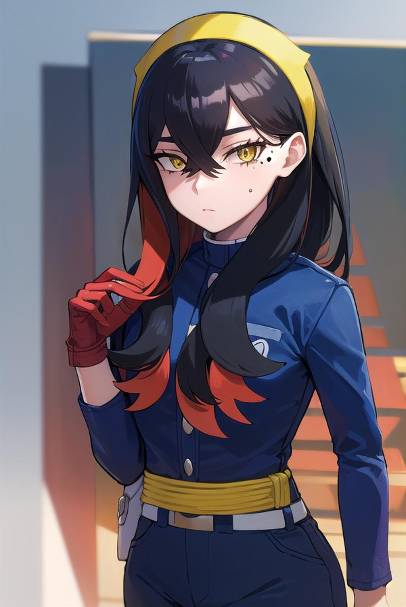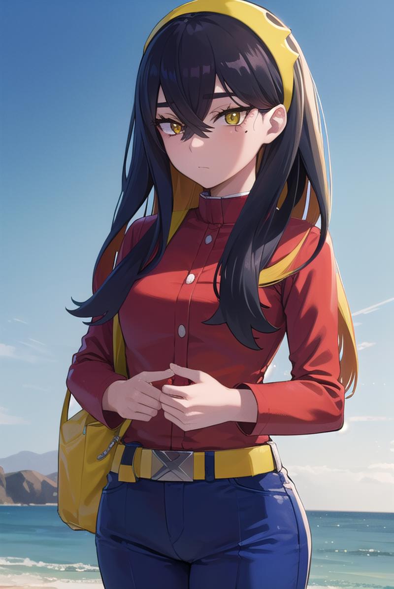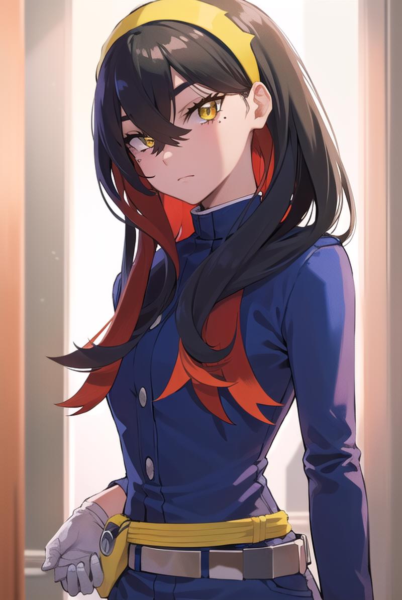 pokemoncarmine, black hair, colored inner hair, crossed bangs, hair between eyes, hairband, long hair, mole, mole under eye, multicolored hair, red hair, sidelocks, two-tone hair, (yellow eyes:1.5), yellow hairband,