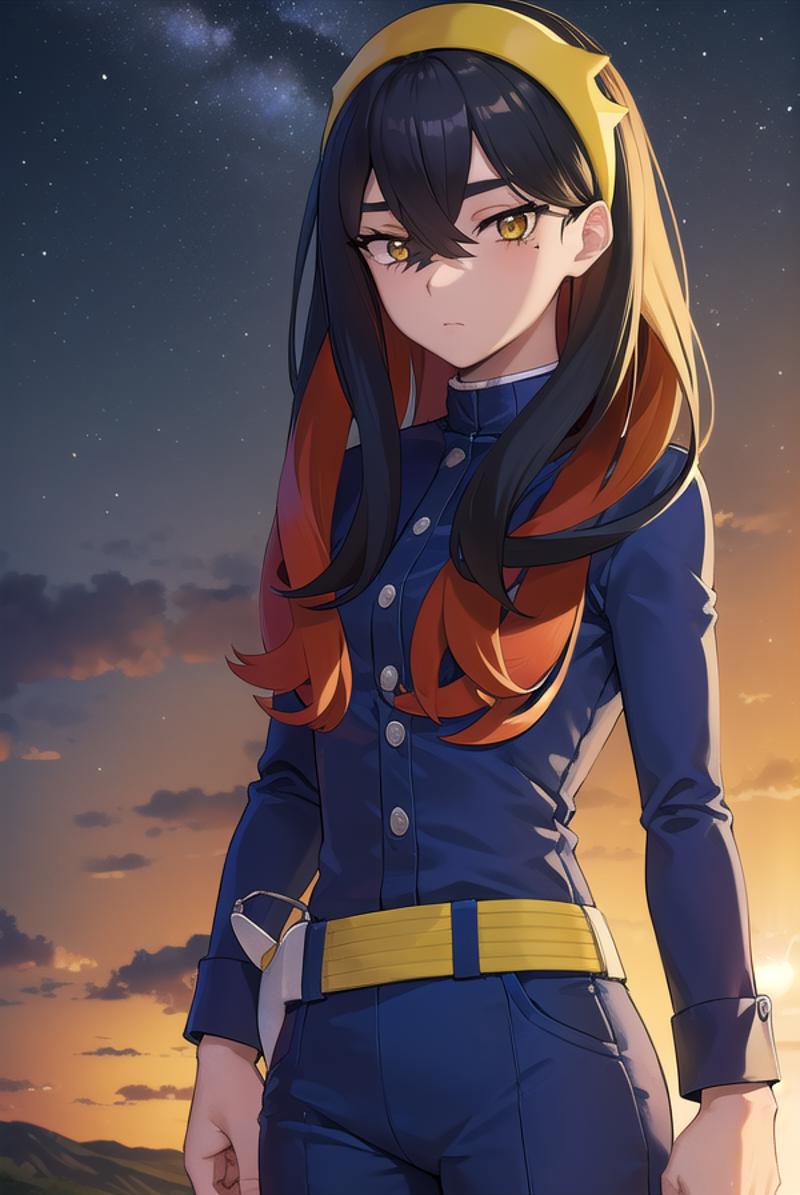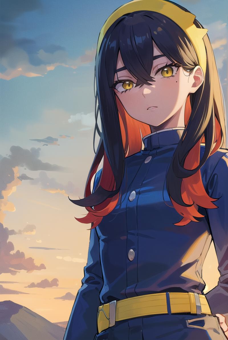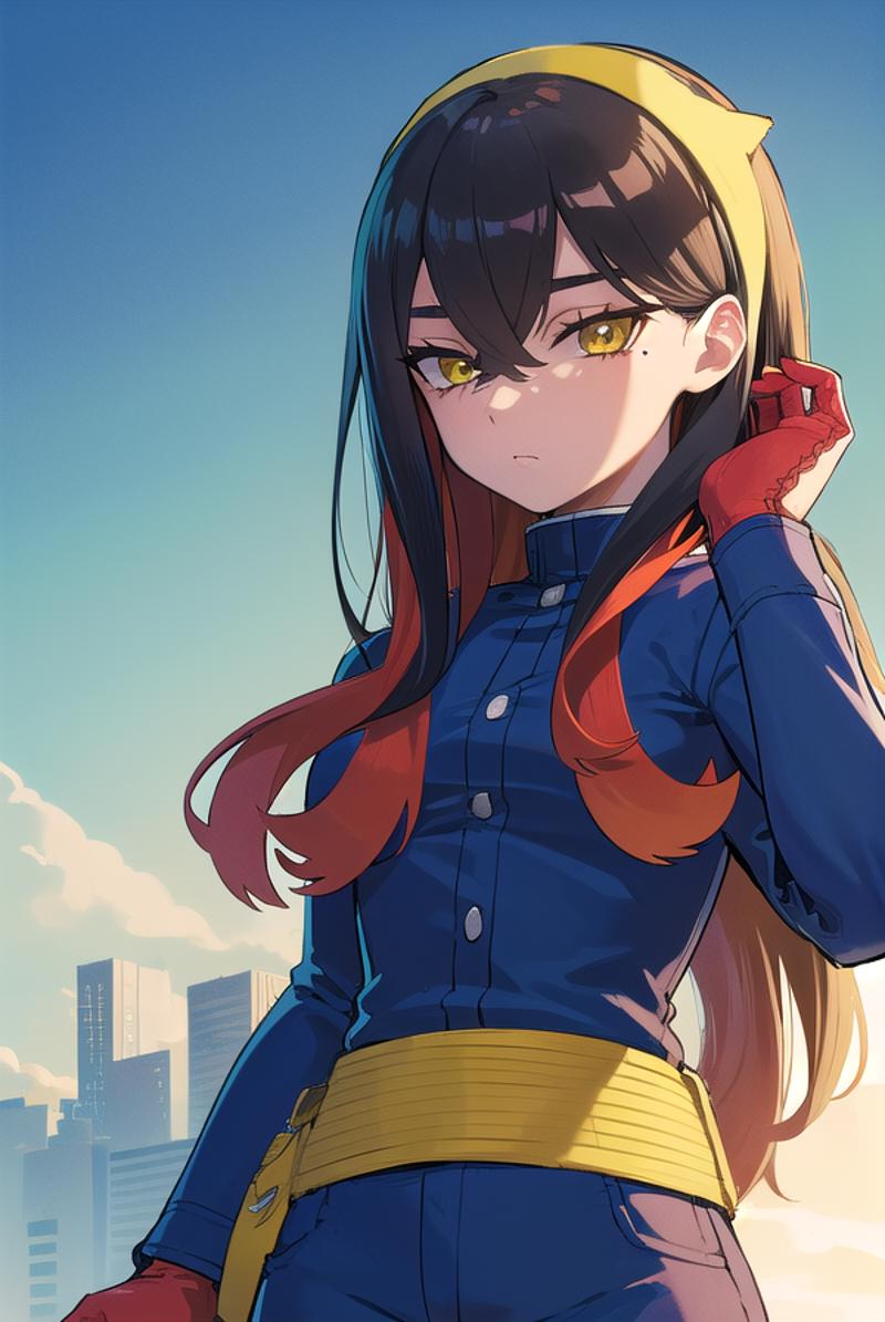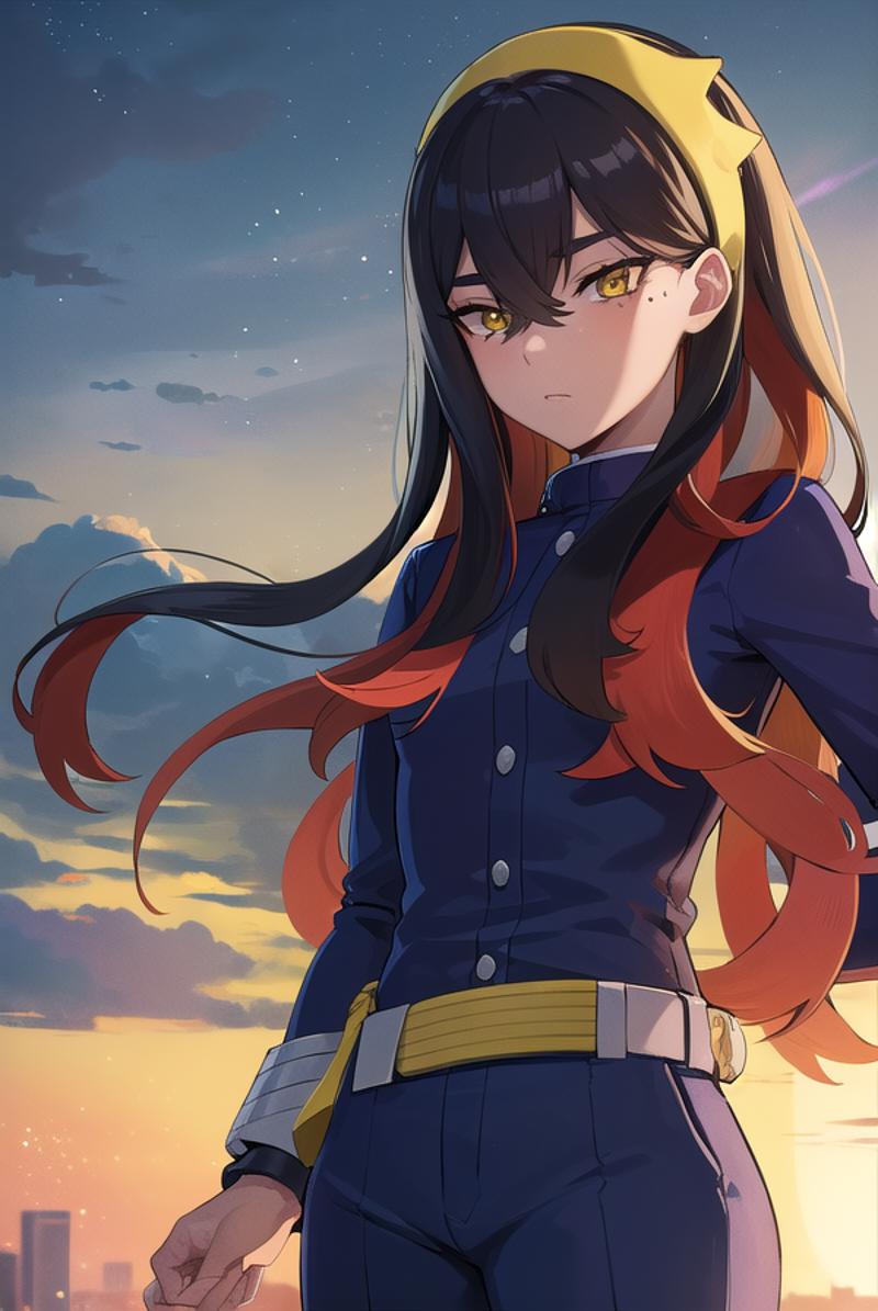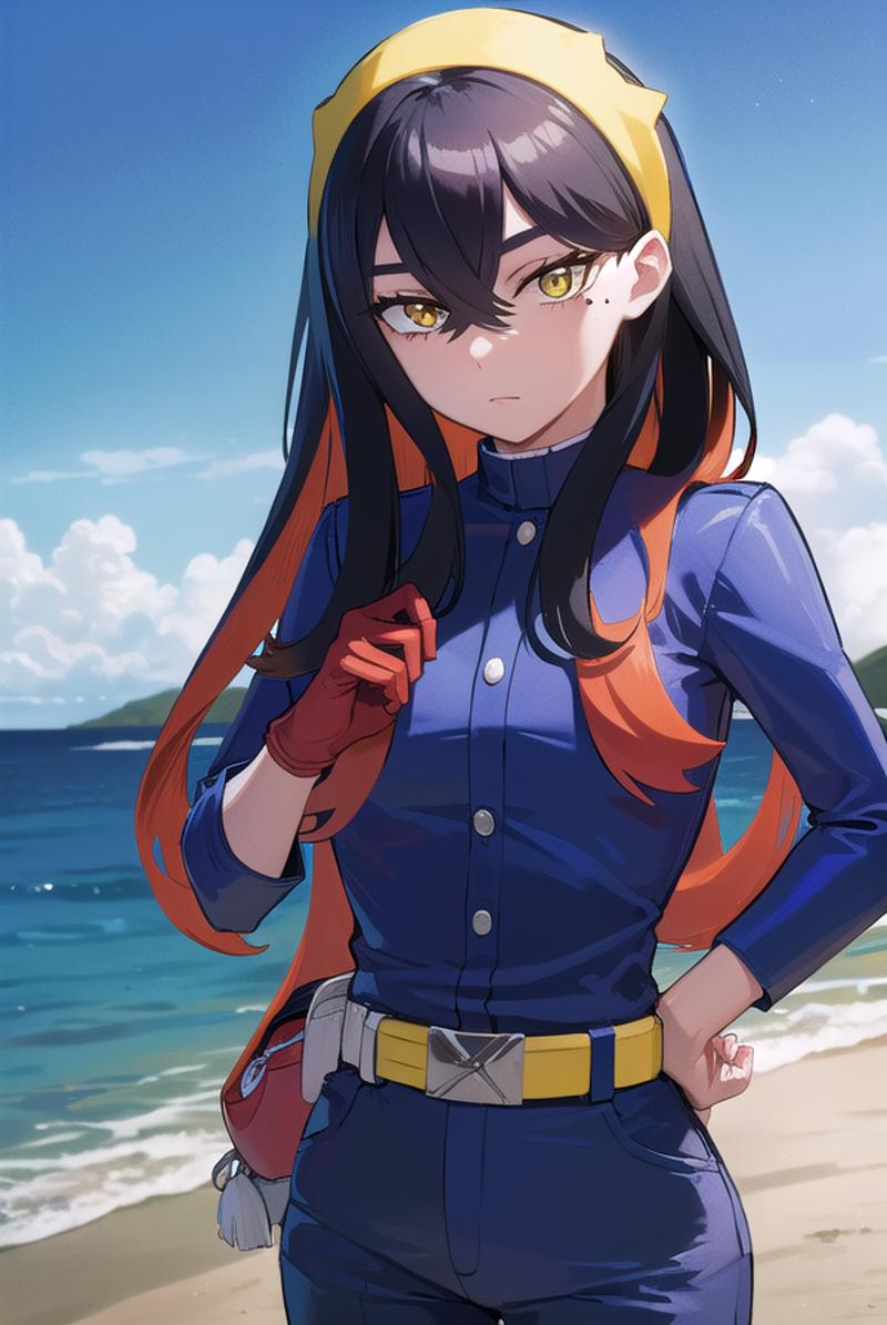 pokemoncarmine, black hair, colored inner hair, crossed bangs, hair between eyes, hairband, long hair, mole, mole under eye, multicolored hair, red hair, sidelocks, two-tone hair, (yellow eyes:1.5), yellow hairband,