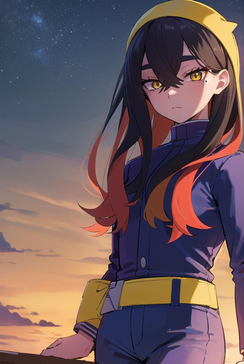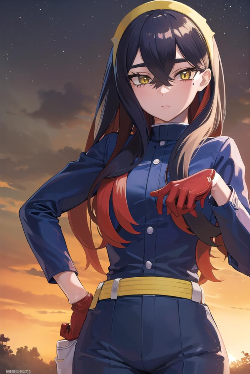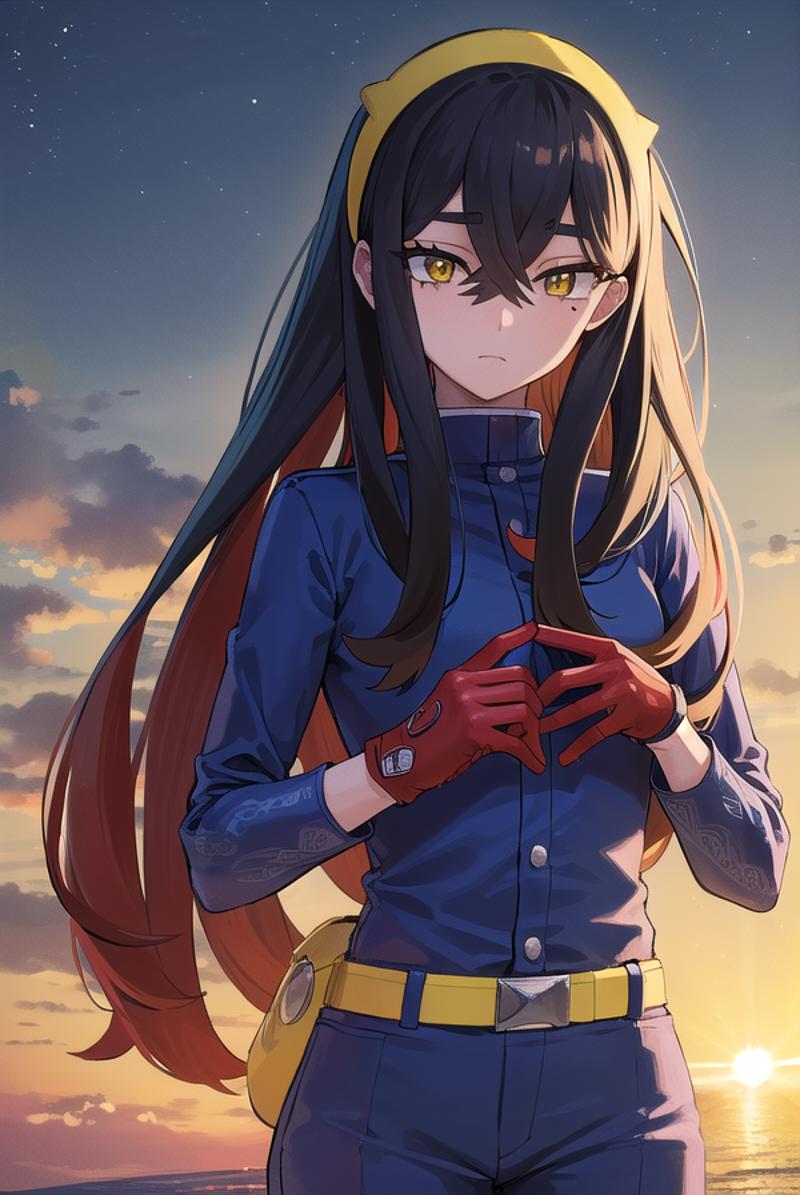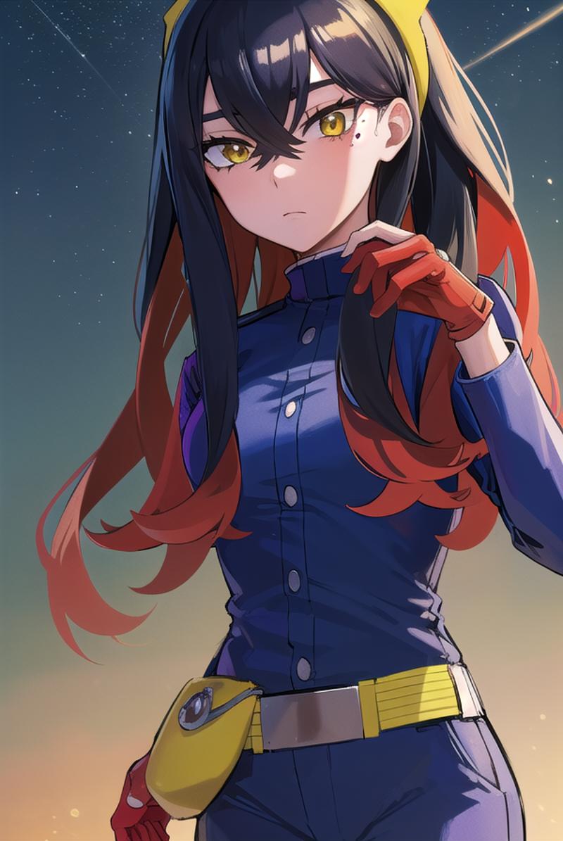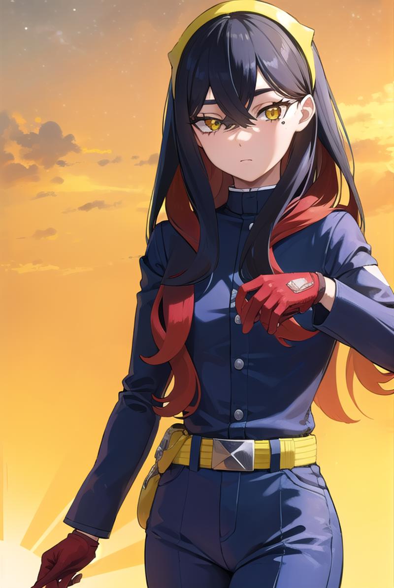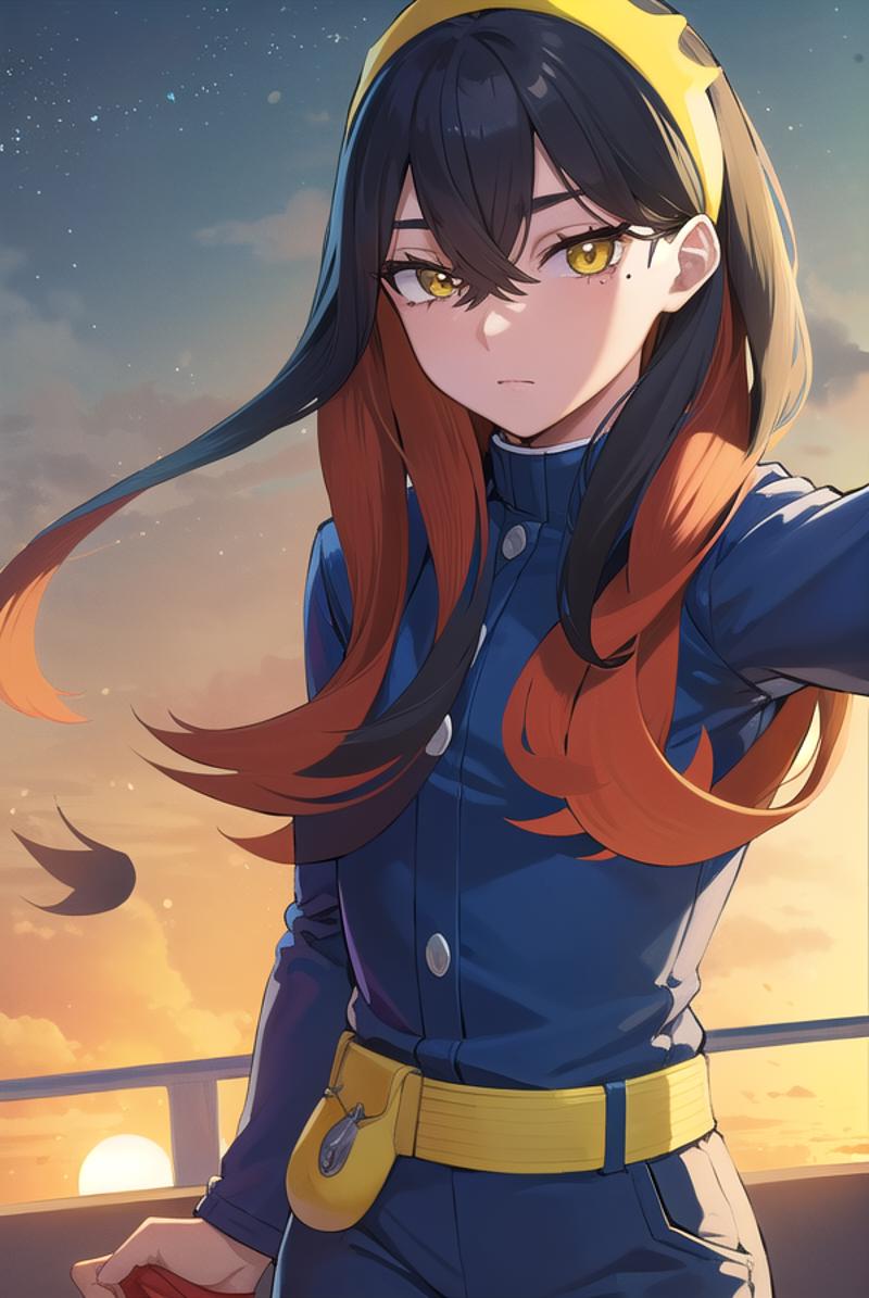 pokemoncarmine, black hair, colored inner hair, crossed bangs, hair between eyes, hairband, long hair, mole, mole under eye, multicolored hair, red hair, sidelocks, two-tone hair, (yellow eyes:1.5), yellow hairband,