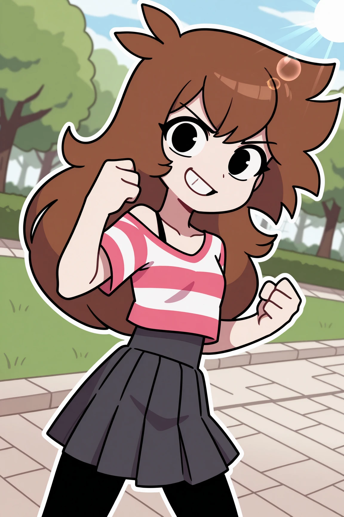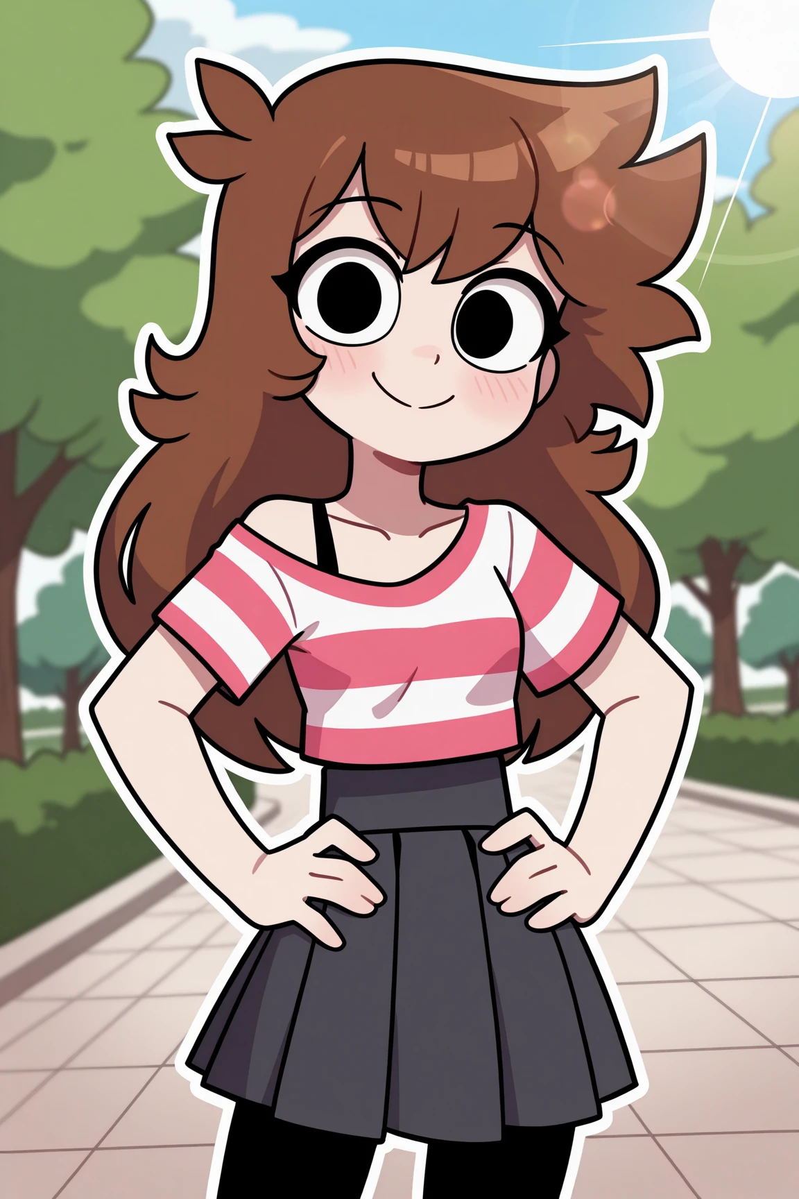 Default: omsshgurr, 1girl, cartoon, brown hair, black eyes, long hair, bangs, striped shirt, off shoulder shirt, bra strap, pleated skirt, black pantyhose,