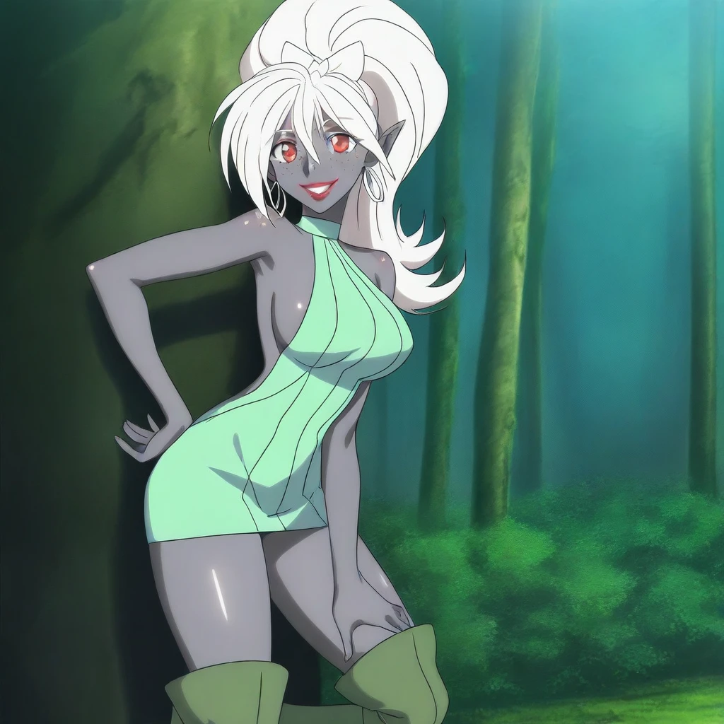 Appearance: white hair, long hair, ponytail, elf, grey skin, dark-skinned female, freckles, lipstick, red eyes, large breasts, hoop earrings