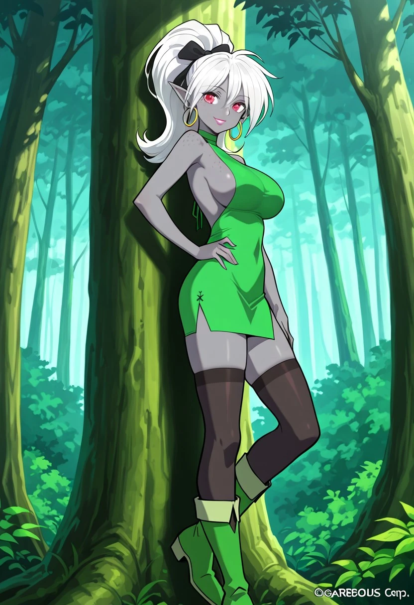white hair, long hair, ponytail, elf, grey skin, dark-skinned female, freckles, lipstick, red eyes, large breasts, hoop earrings, hair ribbon