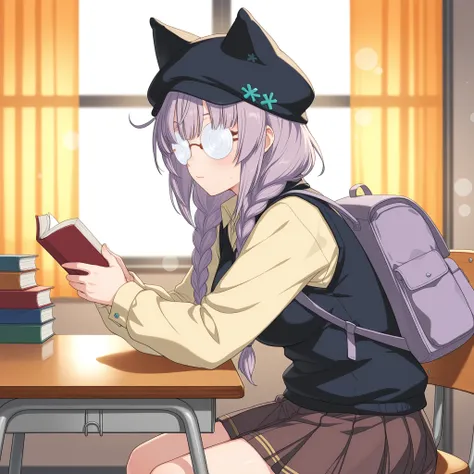 twin braids,coke-bottle glasses,opaque glasses,round eyewear,black headwear,beanie,animal hat,pleated skirt,brown skirt,sweater vest,black vest,yellow shirt,collared shirt,purple backpack,long sleeves,