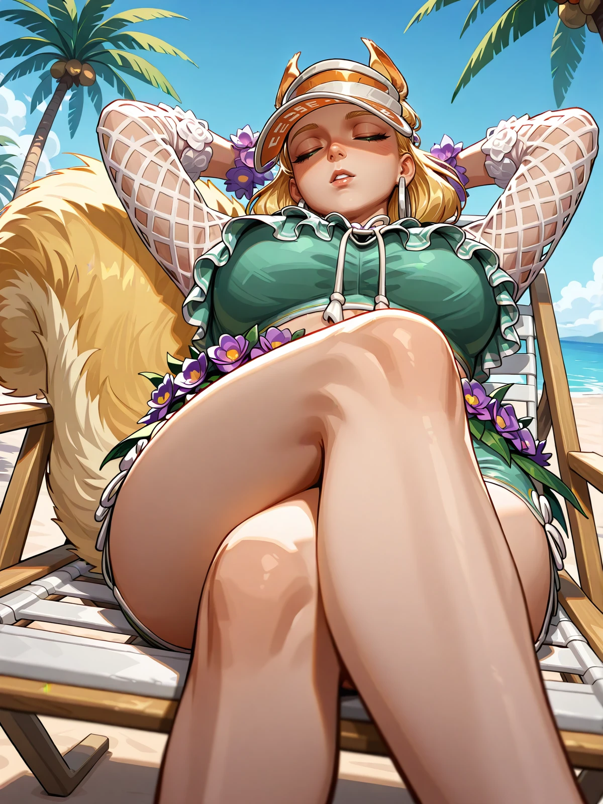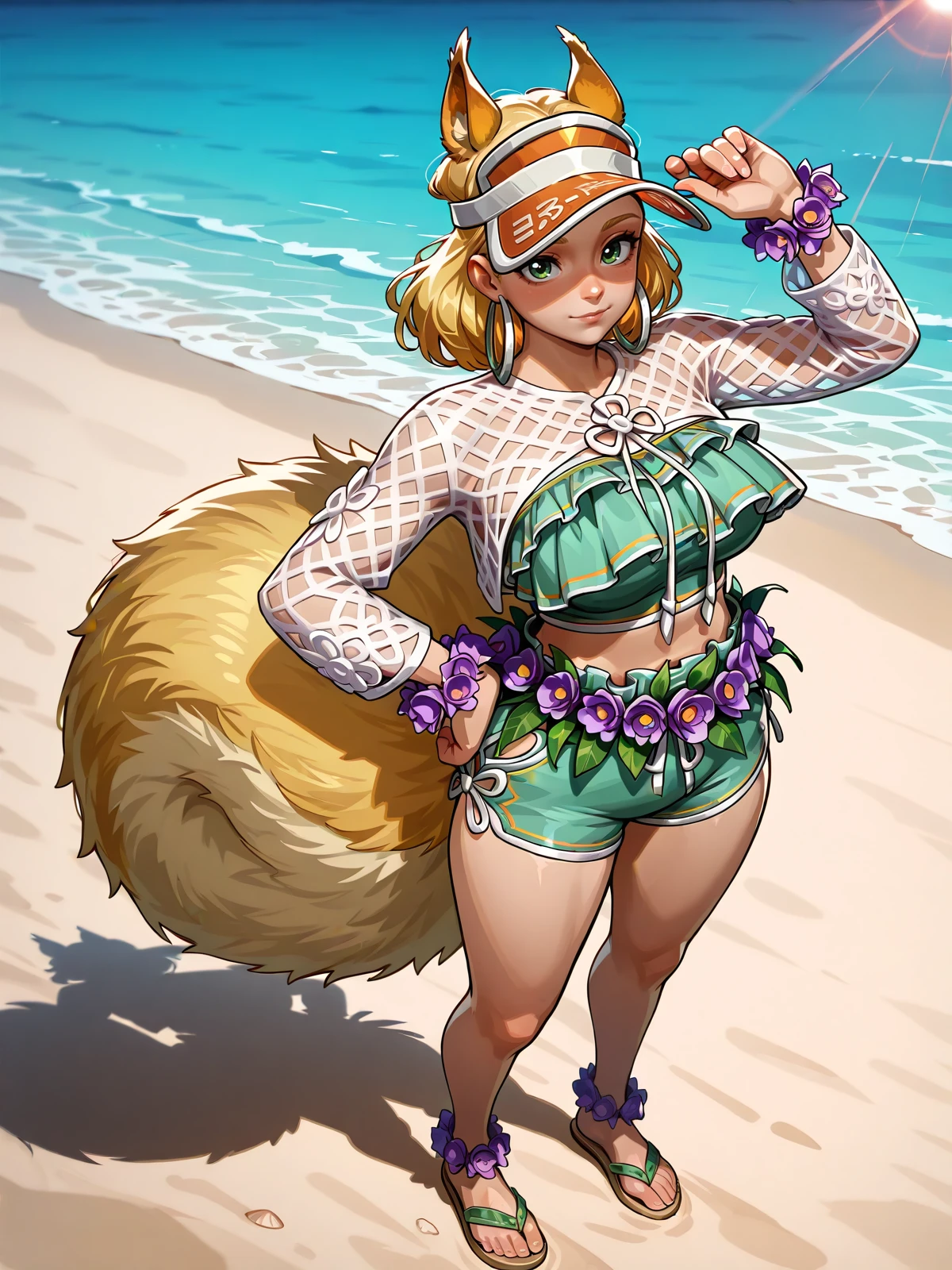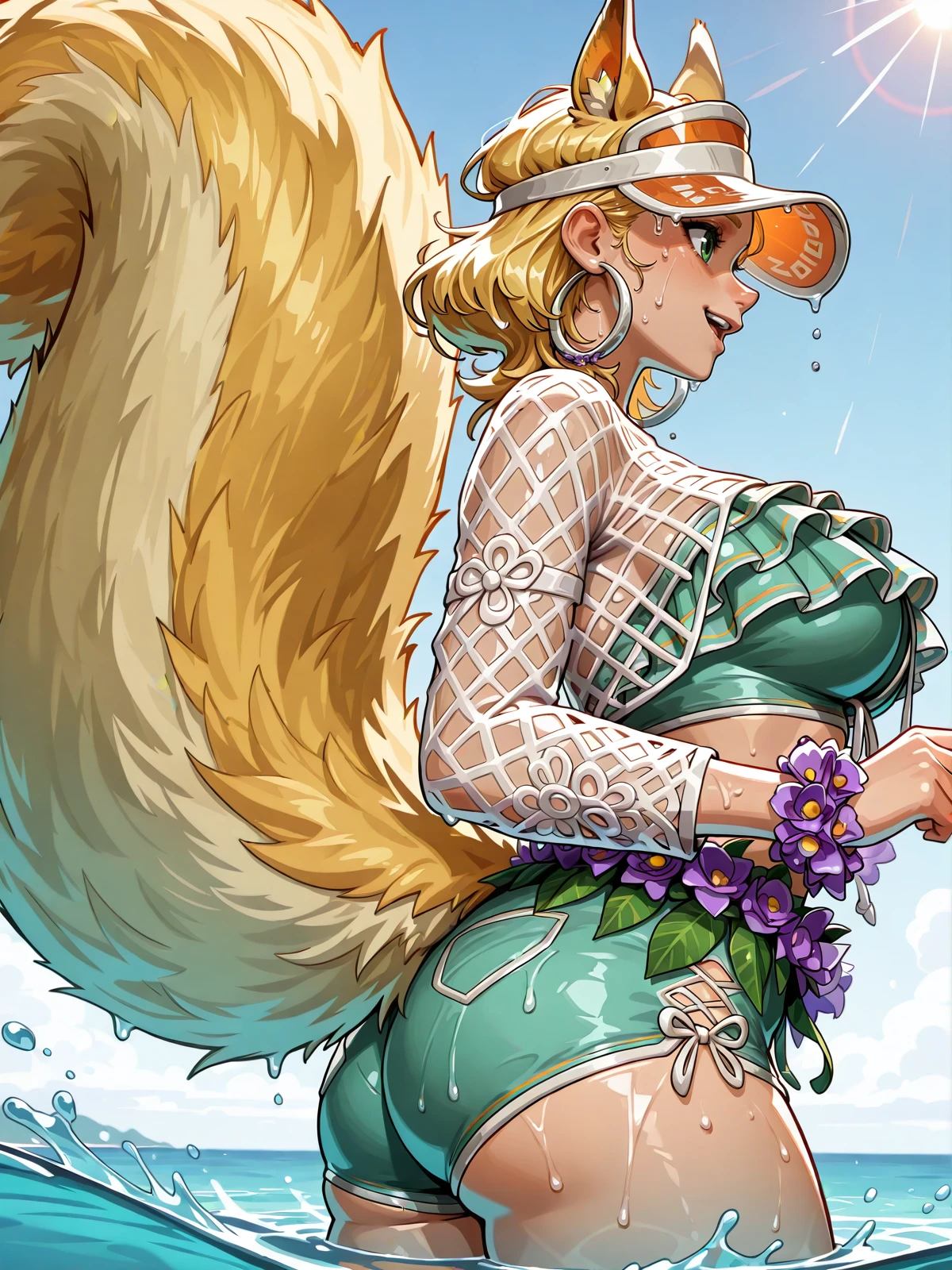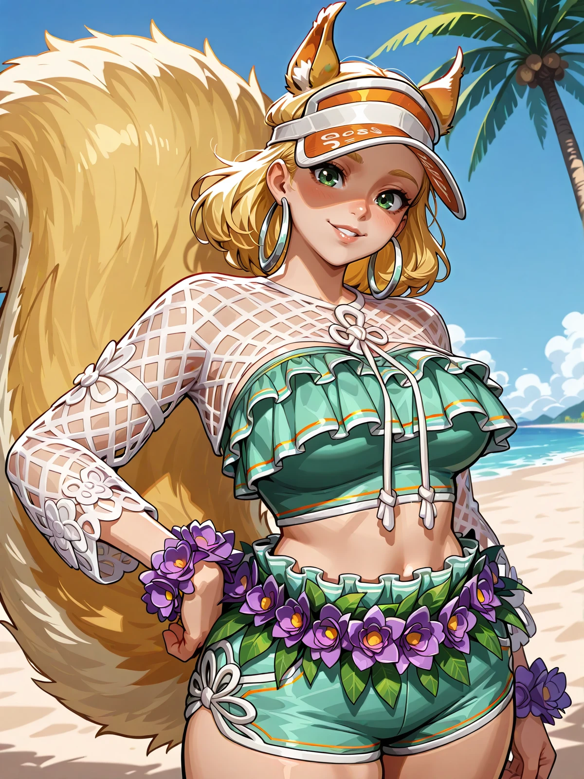 Head/body keywords: green eyes, squirrel ears, blonde hair, medium hair, orange large tail, large breasts, ears through headwear, hoop earrings