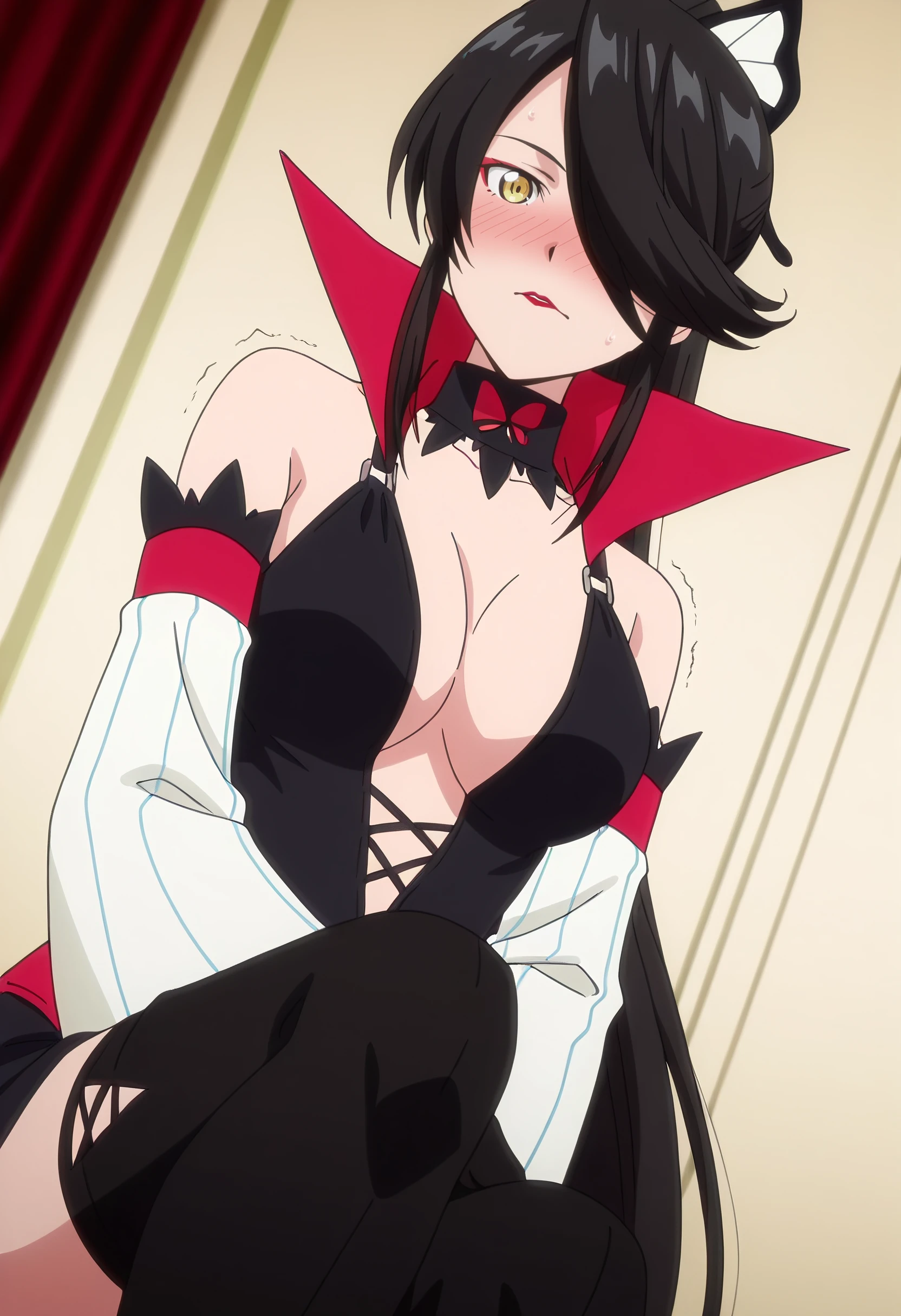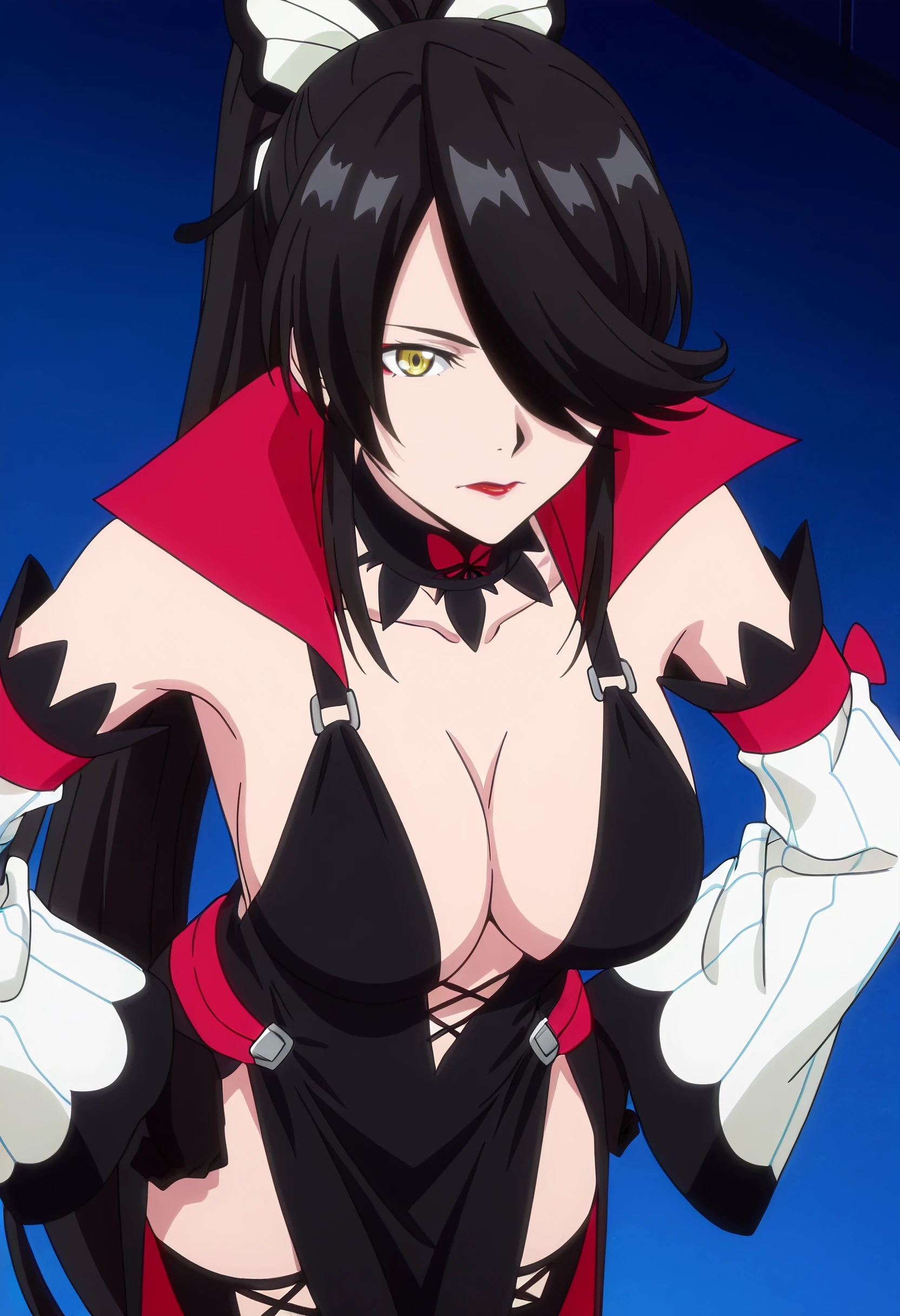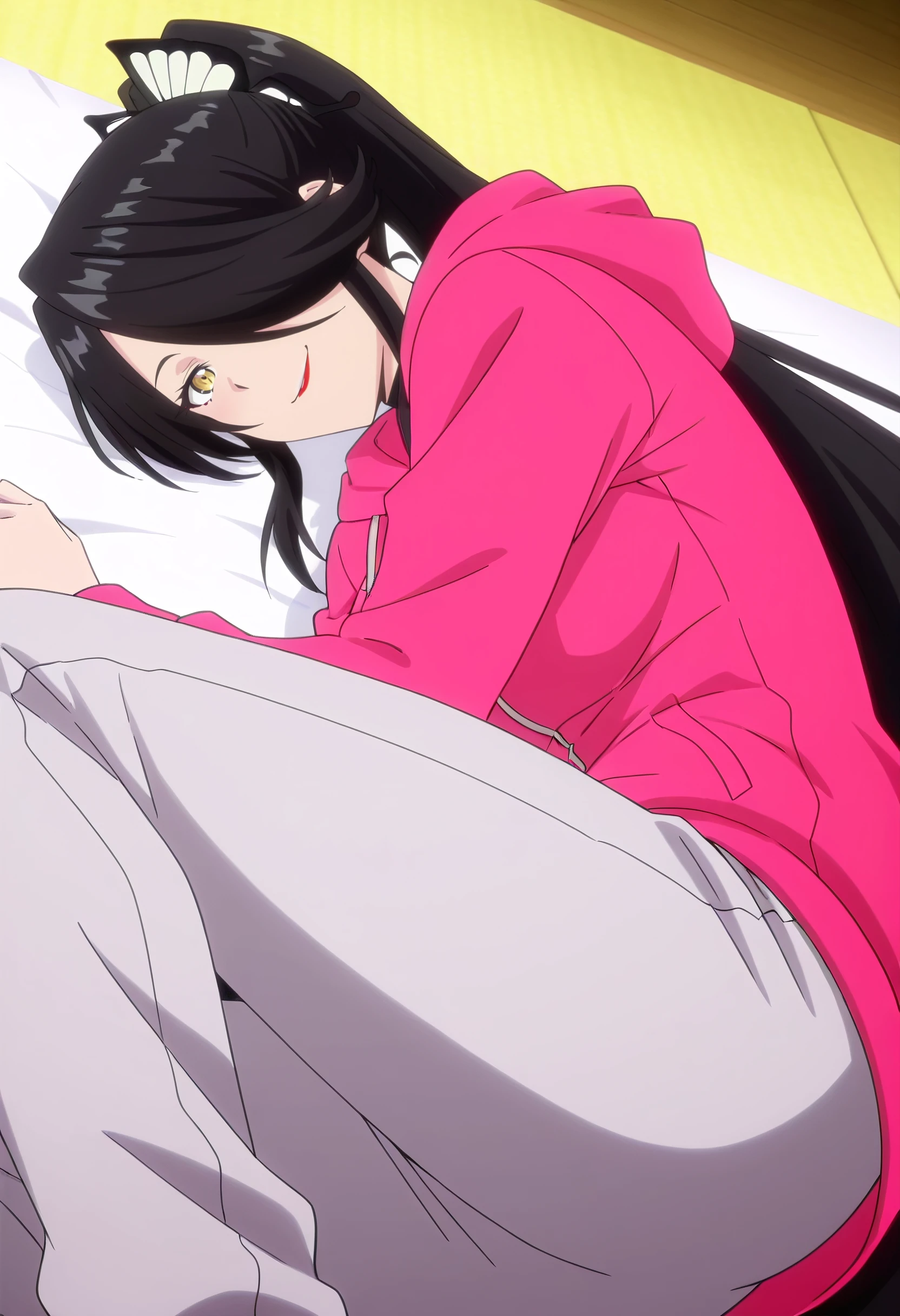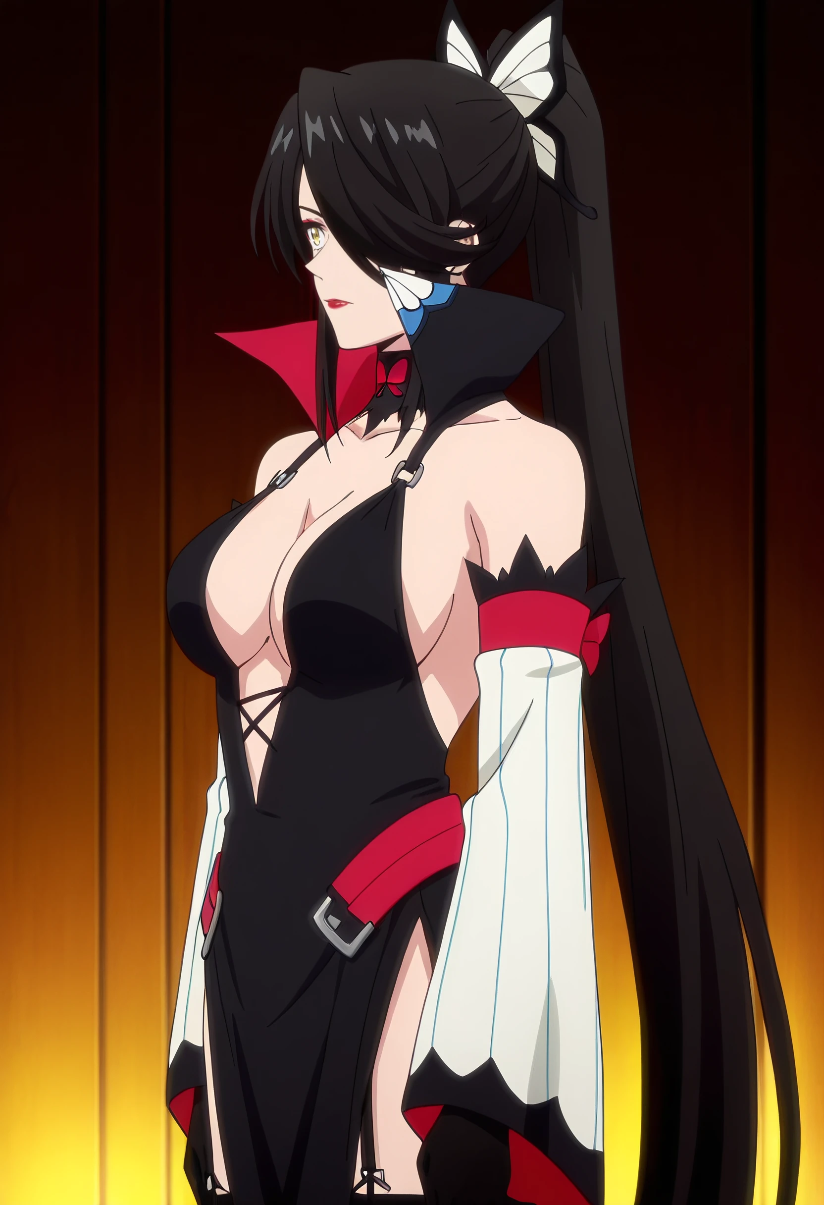ISNMulan, black hair, hair over one eye, long hair, yellow eyes, ponytail, butterfly hair ornament, lipstick, makeup, red lips,
