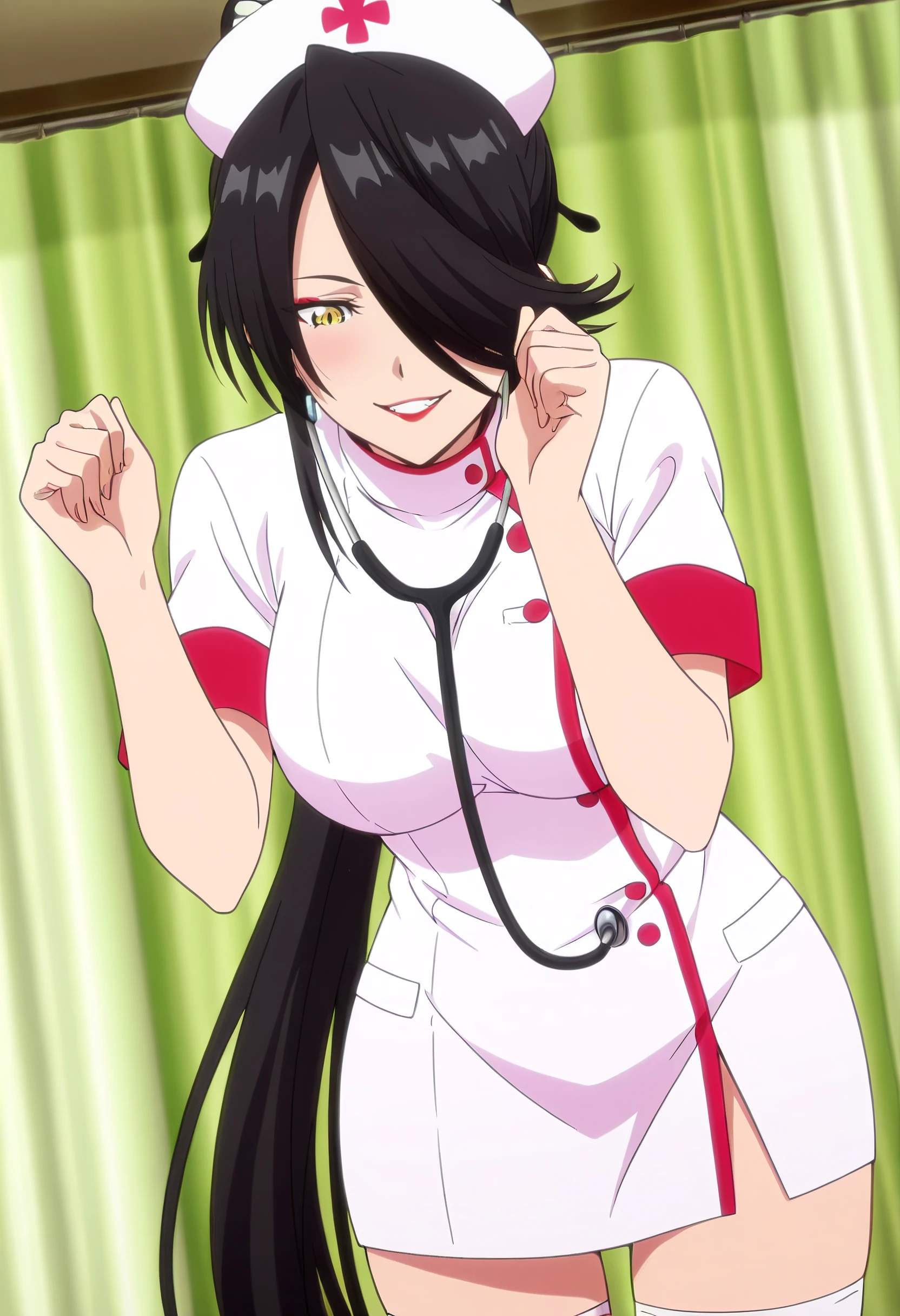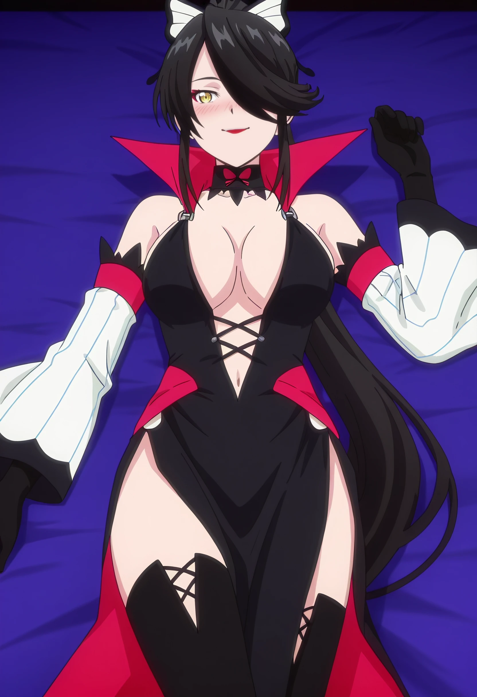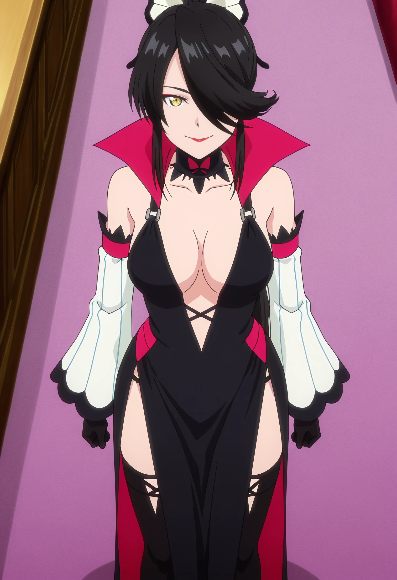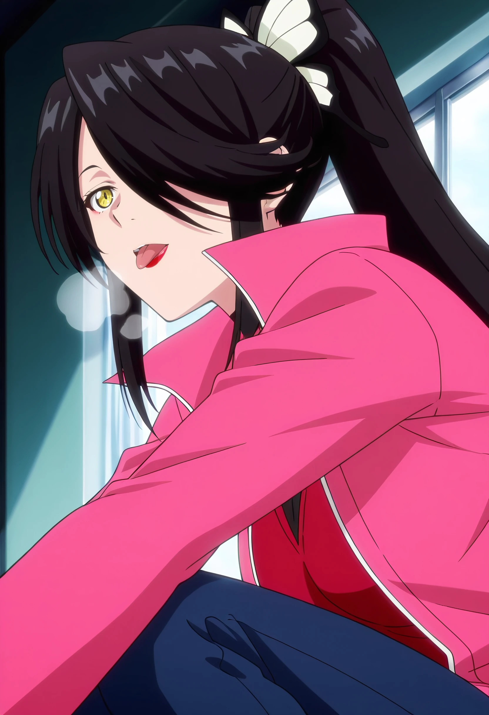 ISNMulan, black hair, hair over one eye, long hair, yellow eyes, ponytail, butterfly hair ornament, lipstick, makeup, red lips,