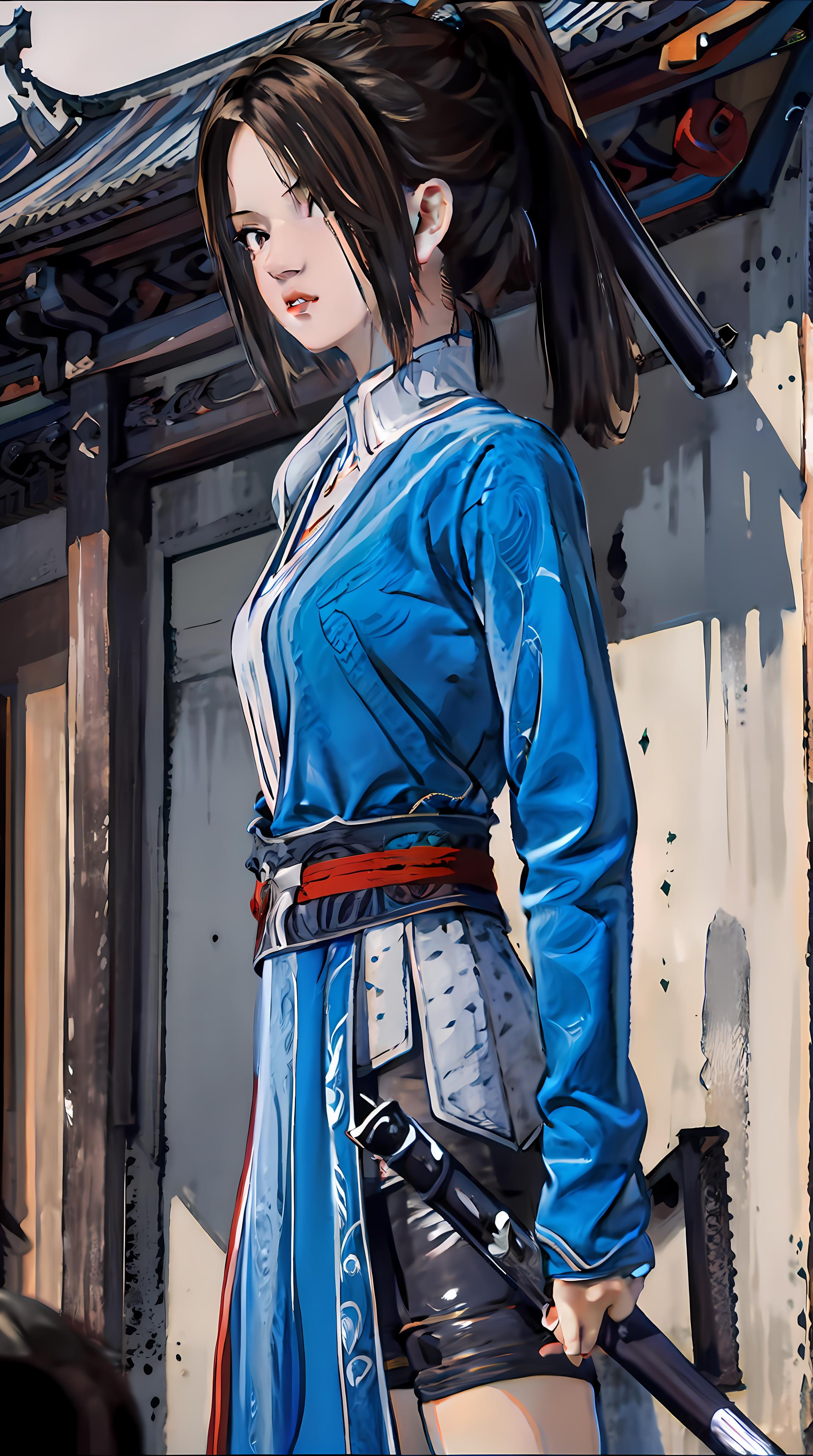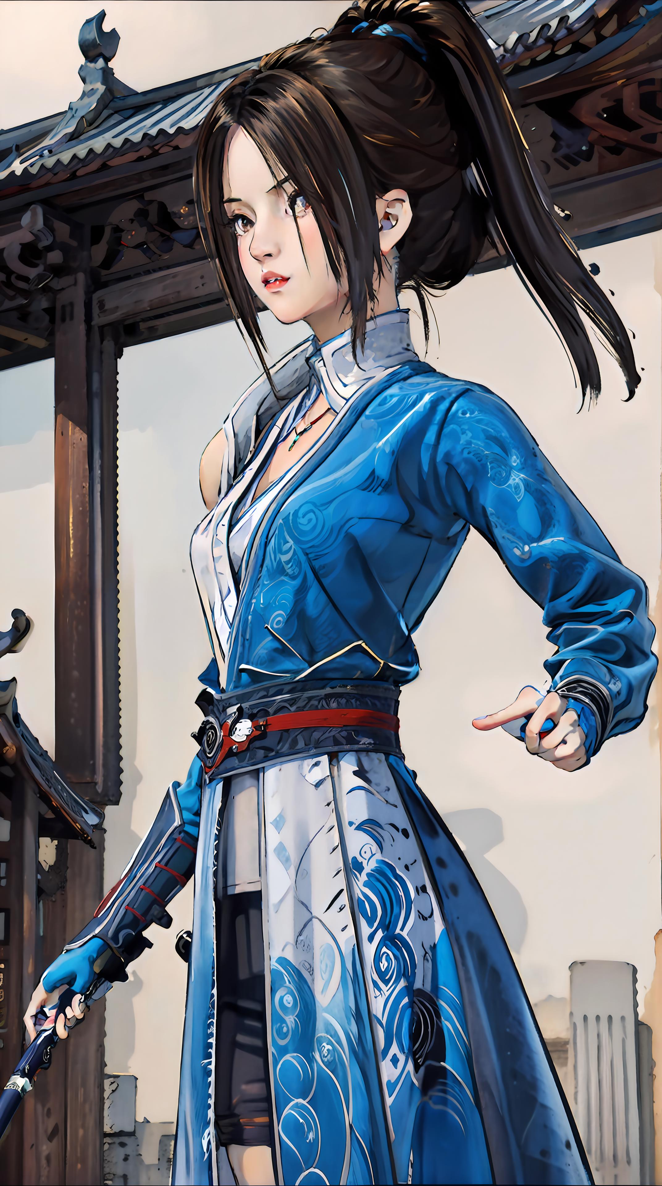 )模型做为底模,基于秋叶的lora整合包进行训练,权重在0.8左右效果比较稳定,配合EasyNegative等负面提示词模型效果更好。这个模型有两套服饰,两种发型,可以通过blue colothes或miao两组tag来切换两套服装,加headware可以画出苗族头饰。(剑和1.0一样依然不好控制,有的时候背后还会背上龙泉剑,因为素材中有,但是细节还原度不高)
