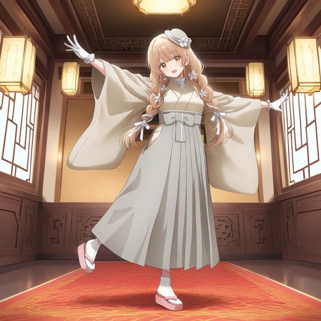ShiinaMahiru, Mhr_JP, light brown hair, braided twintails, white ribbon, hair ribbon, brown eyes, beige kimono, kimono, japanese clothes, light grey skirt, hakama skirt, light grey sash, waist sash, waist bow, light grey bow, beige sleeves, sleeves past wrists, white gloves, frilled gloves, light grey hat, white flower, flower hair ornament, tilted headwear, mini hat, frilled collar, shirt under kimono, white frilled collar, v-neck, tabi, white socks, pink footwear, okobo,Part02 (9 Outfits)