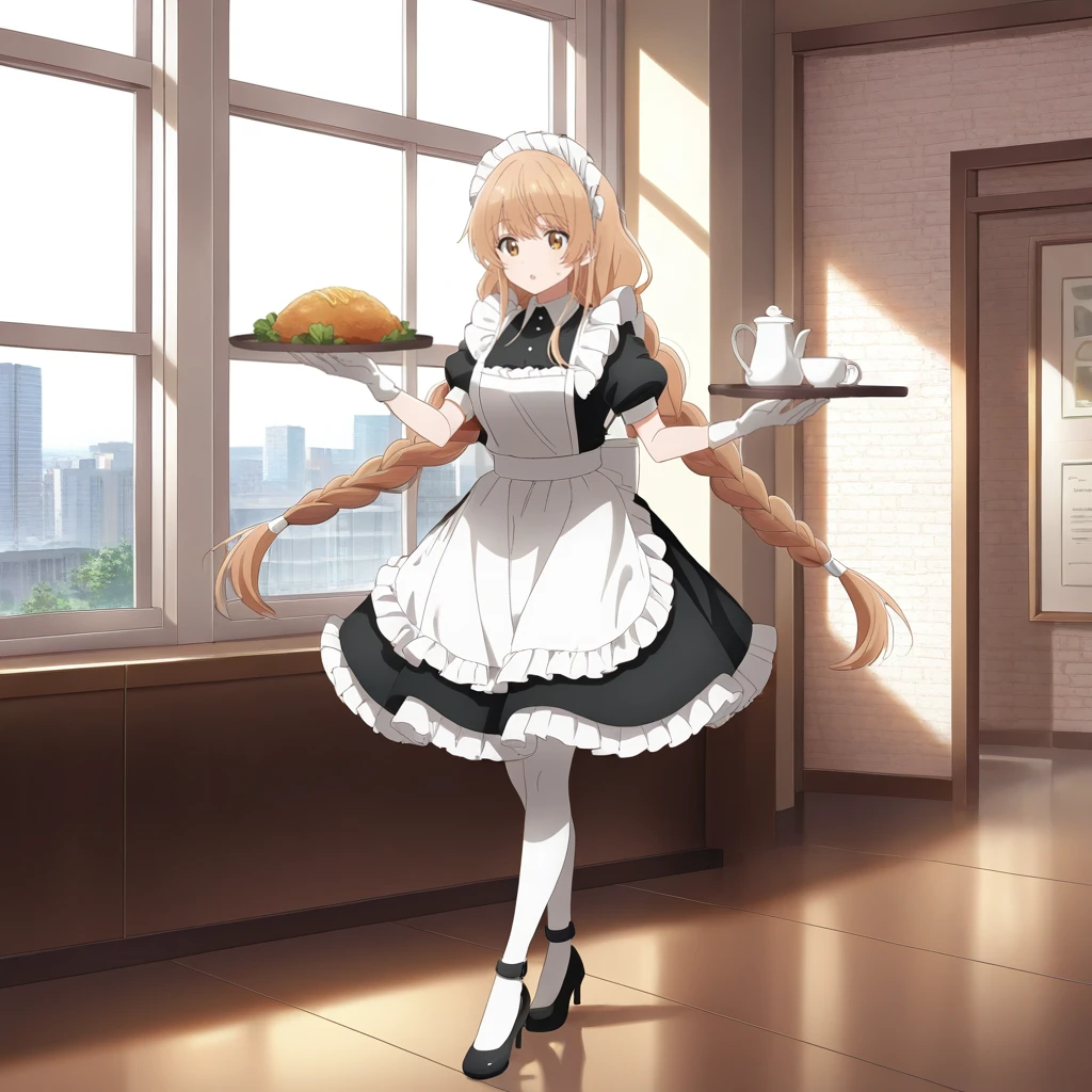 ShiinaMahiru, Mhr_Maid01, light brown hair, long hair, brown eyes, braided twintails, maid, enmaided, maid headdress, black blouse, blouse, collared collar, white collar, maid apron, white apron, puffy short sleeves, black sleeves, white gloves, gloves, black skirt, frilled skirt, back bow, collared dress, black pumps, pumps, black ankle strap,Nurse Outfit: