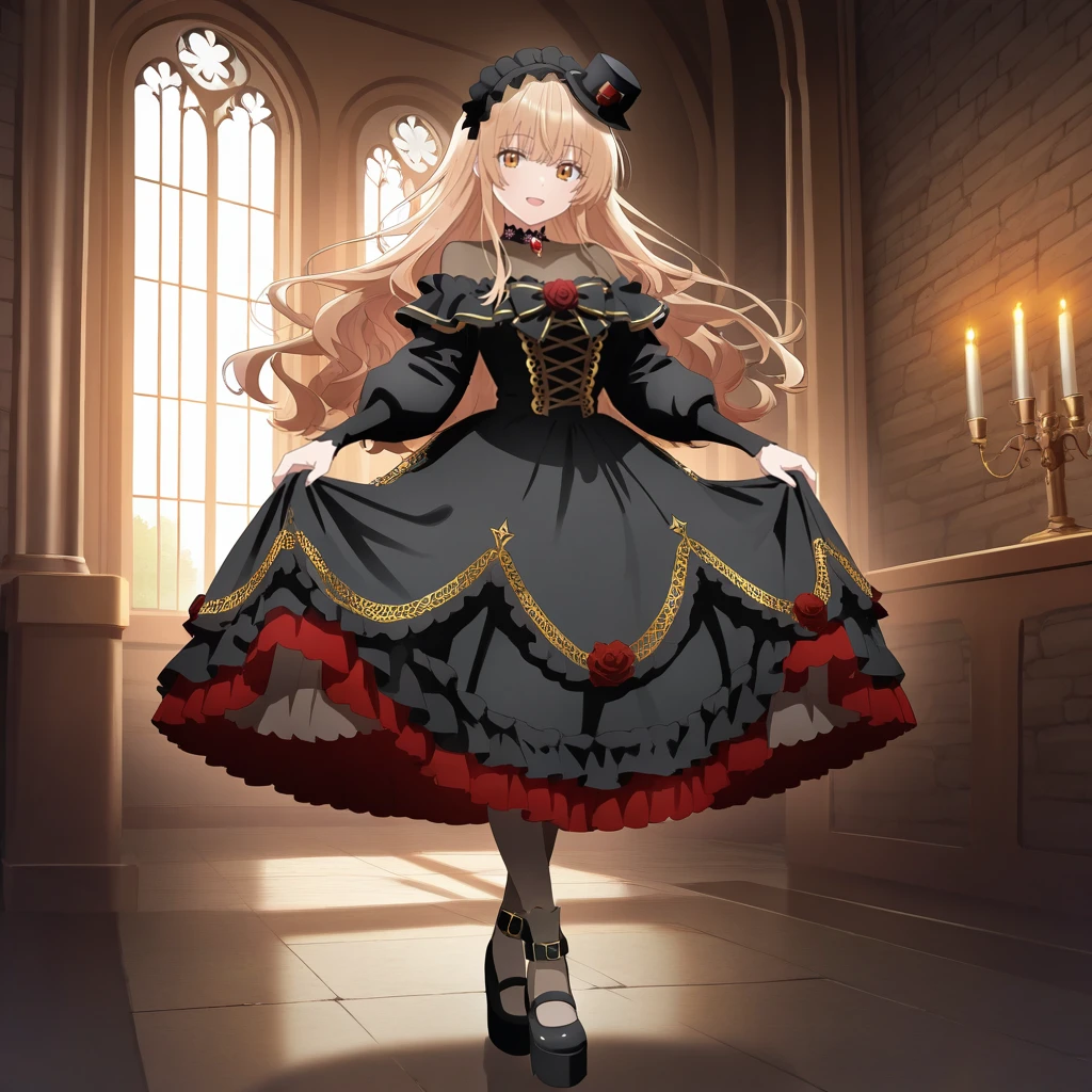 ShiinaMahiru, Mhr_Gth, light brown hair, wavy hair, long hair, brown eyes, see-through shrug, black shrug, shrug (clothing), off-shoulder dress, black dress, see-through collarbone, black choker, lace choker, red rose, dress flower, gold trim, hoop skirt, black skirt, layered skirt, frills, puffy long sleeves, black sleeves, frilled headdress, black headdress, mini top hat, top hat, black headwear, collar jewel, red gemstone, cross-laced clothes, grey socks, ankle belt, platform footwear, shoes, black shoesNun Outfit: