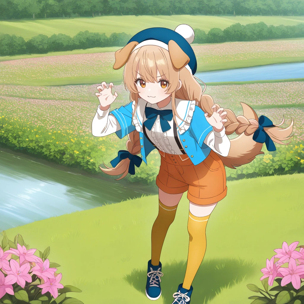 ShiinaMahiru, Mhr_Rbt02, light brown hair, brown eyes, long hair, rabbit ears, animal ear hairband, yellow undershirt, white suspenders, buttons, shirt, aqua shirt, crop top, layered shirt, puffy sleeves, short sleeves, aqua sleeves, pink belt, pink bow, chest bow, large bow, waist bow, aqua skirt, frilled skirt, hair bow, white thighhighs, yellow ankle cuffs, aqua footwear, ankle boots,The results of your generations are dependent on the additional LoRAs, weights, and models you use, so it may not work or come out as consistent as my sample images.
