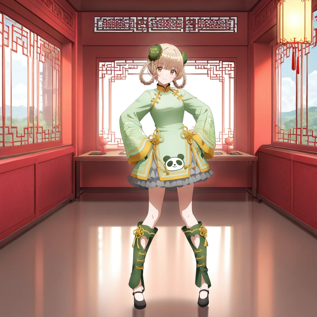 ShiinaMahiru, Mhr_CN, bun cover, green headwear, hair bun, medium hair, light brown hair, brown eyes, double buns, braided hair rings, hair rings, light green dress, china dress, light green sleeves, sleeves past fingers, wide sleeves, yellow trim, clouds print, mandarin collar, yellow collar, panda print, chinese knot, yellow ribbon, bear print, grey skirt, skirt under dress, grey frilled skirt, green legwear, green leg warmers, leg warmers, legwear cutout, black flats, flats, shoe strap, heart cutout,Japanese Outfit:
