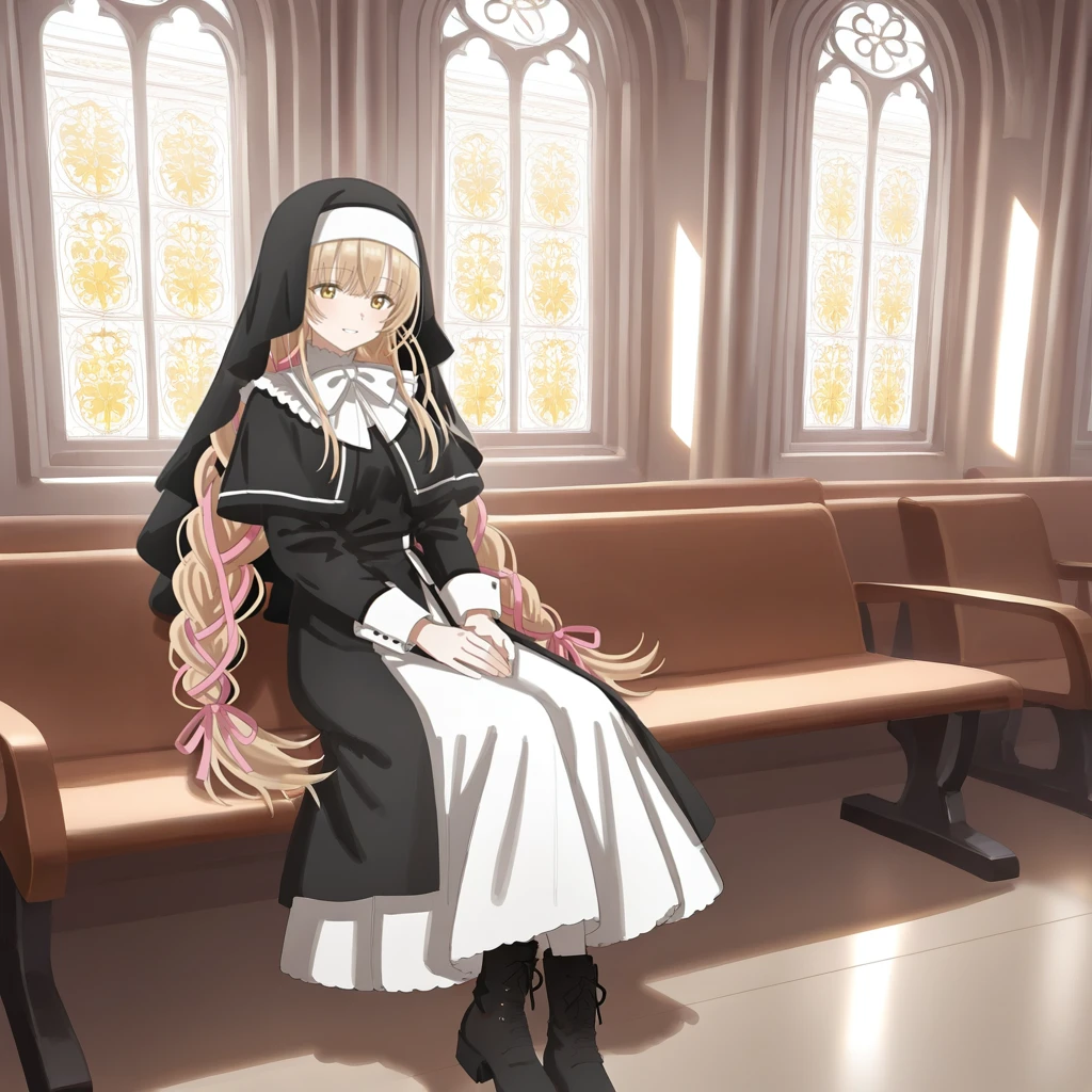 ShiinaMahiru, Mhr_Nun, light brown hair, long hair, twin braids, brown eyes, pink ribbon, hair ribbon, nun, traditional nun, black veil, veil, nun headband, black capelet, capelet, frilled gorget, white gorget, white bowtie, bow ribbon, black sleeves, long sleeves, white sleeve cuffs, black dress, dress, skirt under dress, long skirt, white skirt, block heels, lace-up boots, black boots,Maid Outfit: