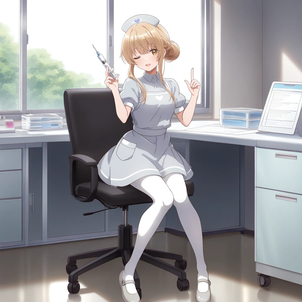 ShiinaMahiru, Mhr_Nrs, light brown hair, short hair with long locks, single hair bun, brown eyes, hair bun, pinafore dress, light grey dress, light cyan shirt, polo shirt, puffy sleeves, short sleeves, pockets, light cyan sleeves, light cyan skirt, skirt under dress, white trim, nurse, white pantyhose, nurse cap, light grey headwear, light grey footwear, mary janes,Chinese Outfit: