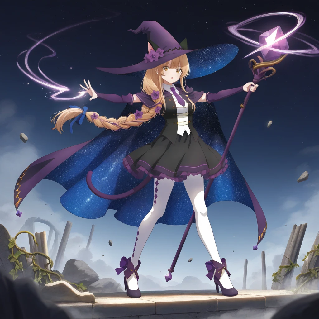 ShiinaMahiru, Mhr_Hlw01, light brown hair, brown eyes, long hair, braided ponytail, starry sky print, low-side ponytail, aiguillettes, hair flower, purple flower, witch, halloween costume, collared shirt, white shirt, black vest, vest, purple cape, purple trim, cat tail, two-sided cape, black skirt, two-sided skirt, purple necktie, blue ribbon, hair ribbon, purple gloves, elbow gloves, bridal gauntlets, purple headwear, witch hat, cat ears, hat with ears, hat flower, two-sided hat, white pantyhose, argyle pantyhose, purple ankle cuffs, ankle bow, purple bow, purple footwear, high heels,Magician with Dog Ears Outfit: