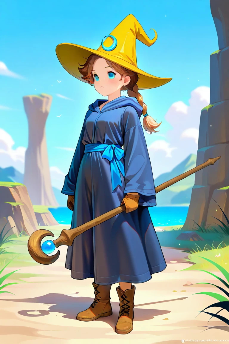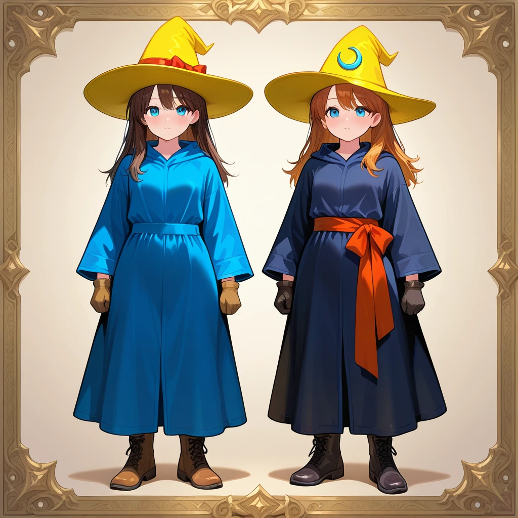 Blackmage_cos,robe,hat,witch hat,wizard hat,yellow_headwear,dress,blue_dress,robe,long sleeves,wicth,gloves,ribbon,red bowOther Prompts: