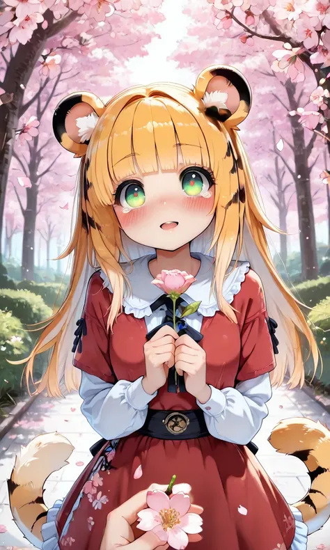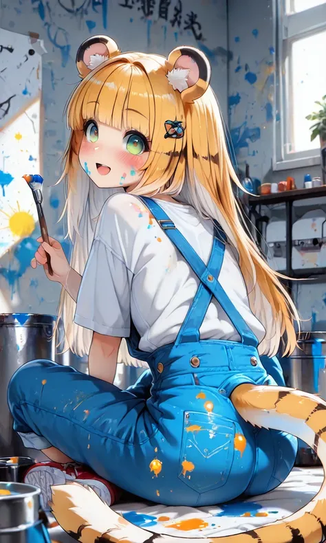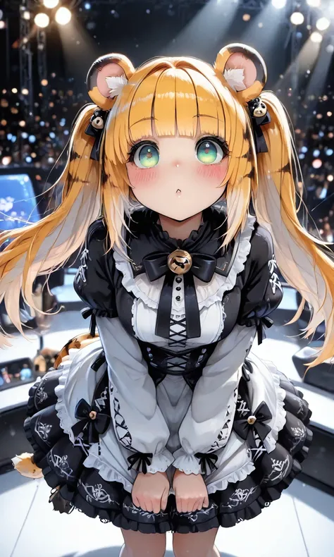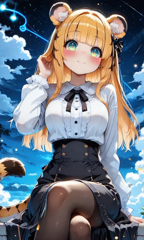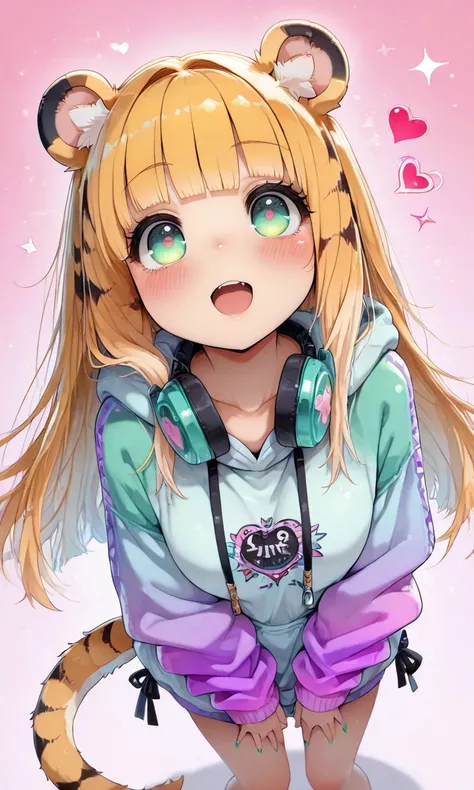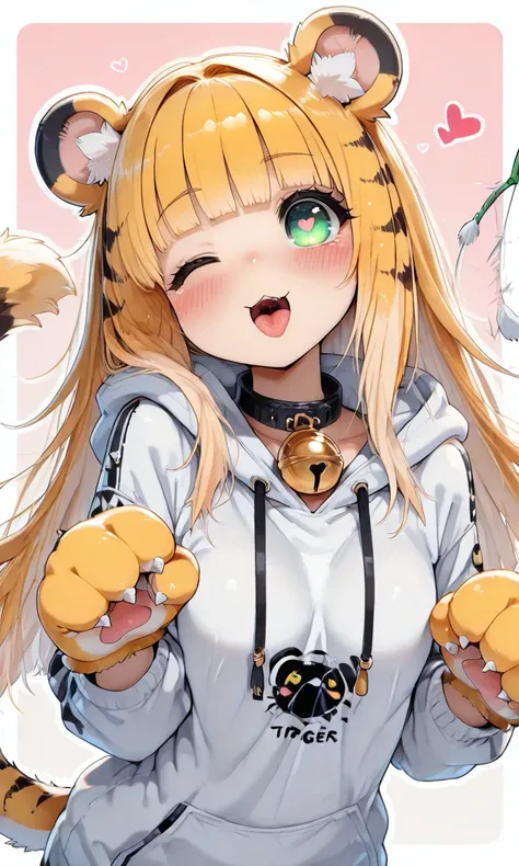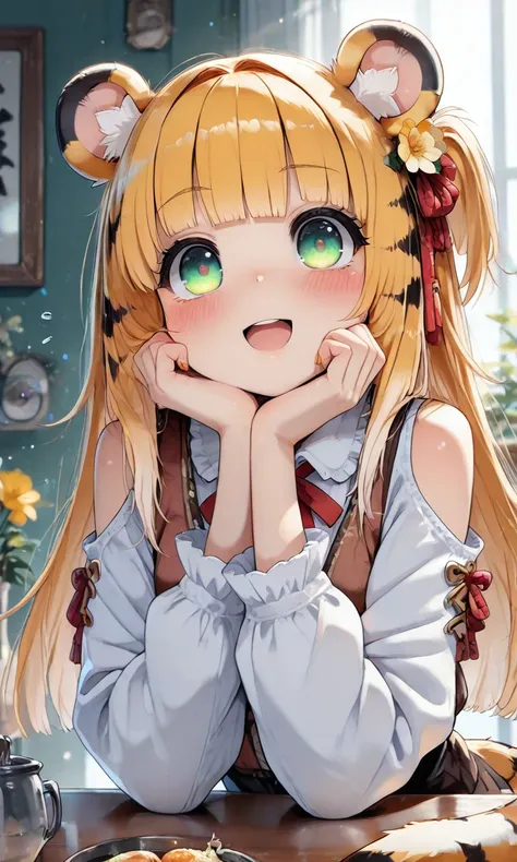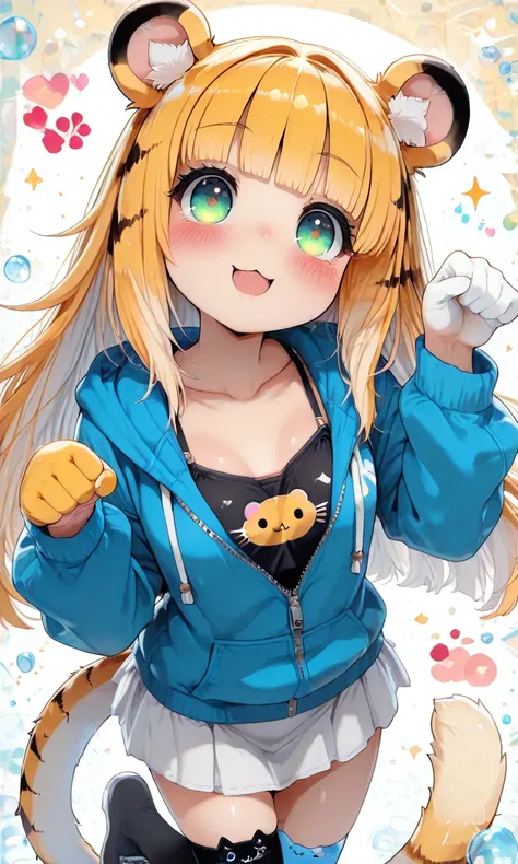 ju_fufu,yellow hair,multicolored hair,long hair,animal ears,tiger ears,tiger tail,green eyes,blunt bangs,tiger girl,tail ornament,yellow_cropped_jacket,high-waist black shorts,one_leg_thigh_strap,black gloves,long sleeves,black collared shirt