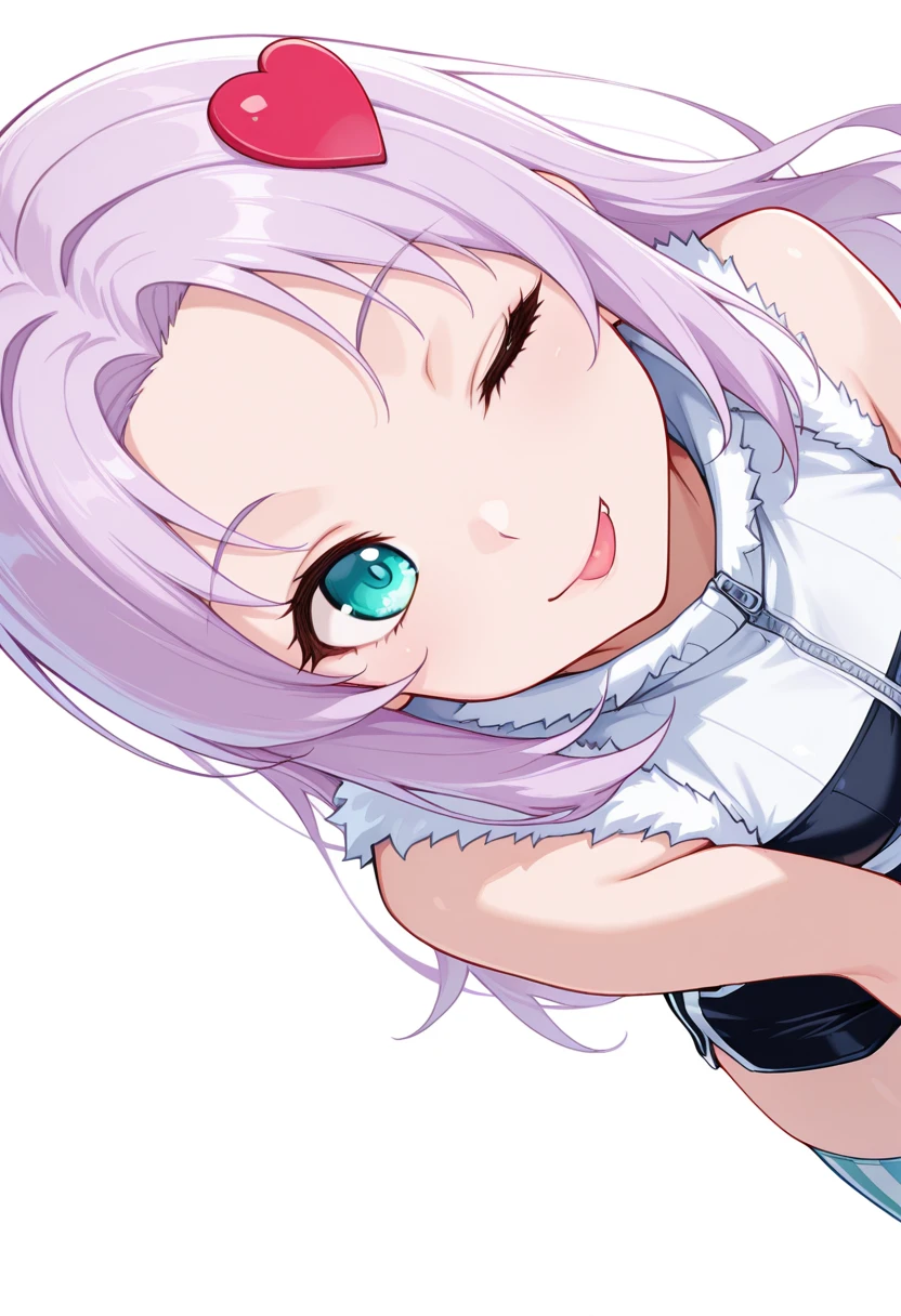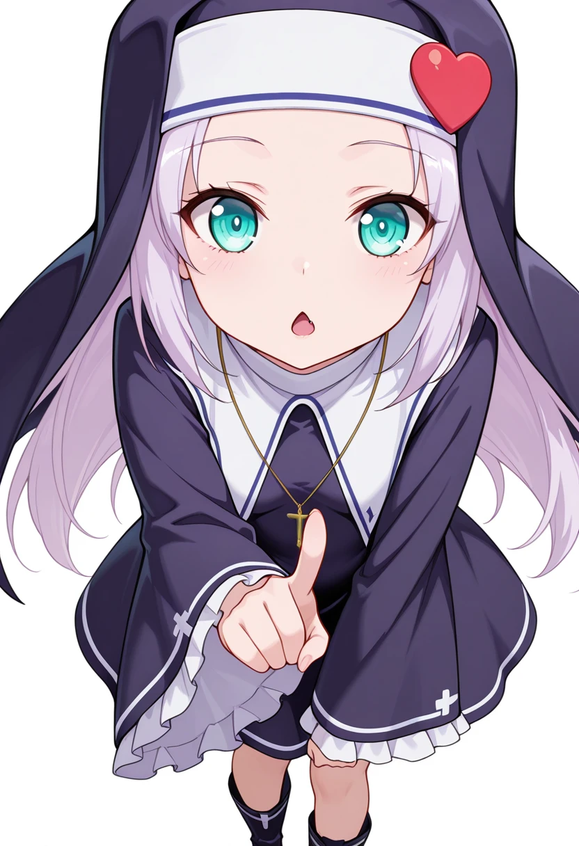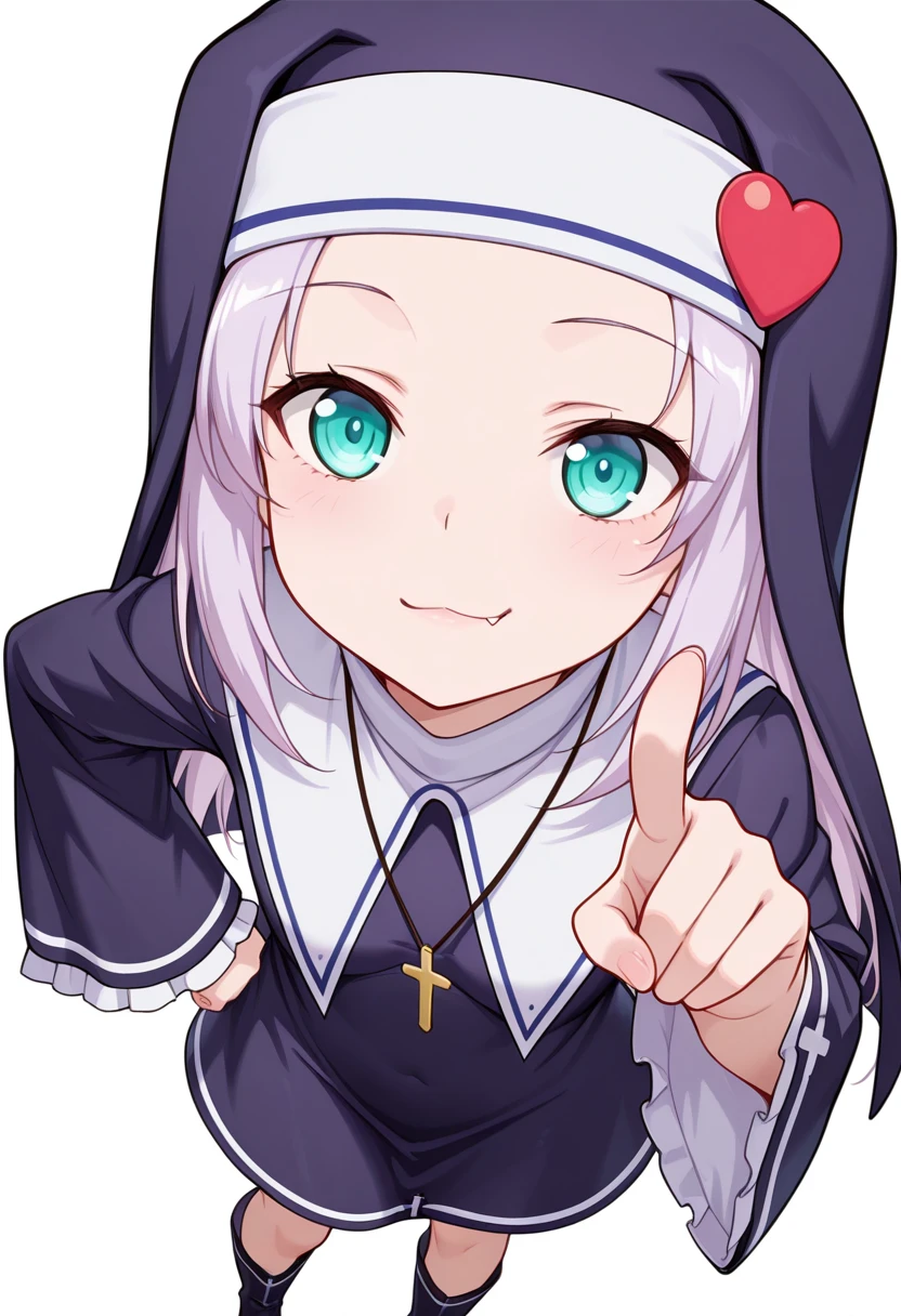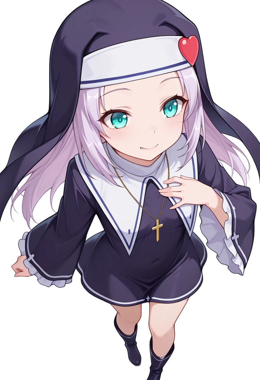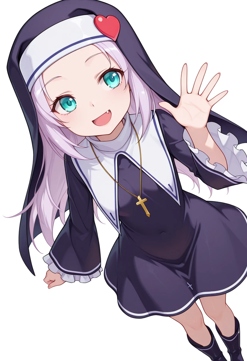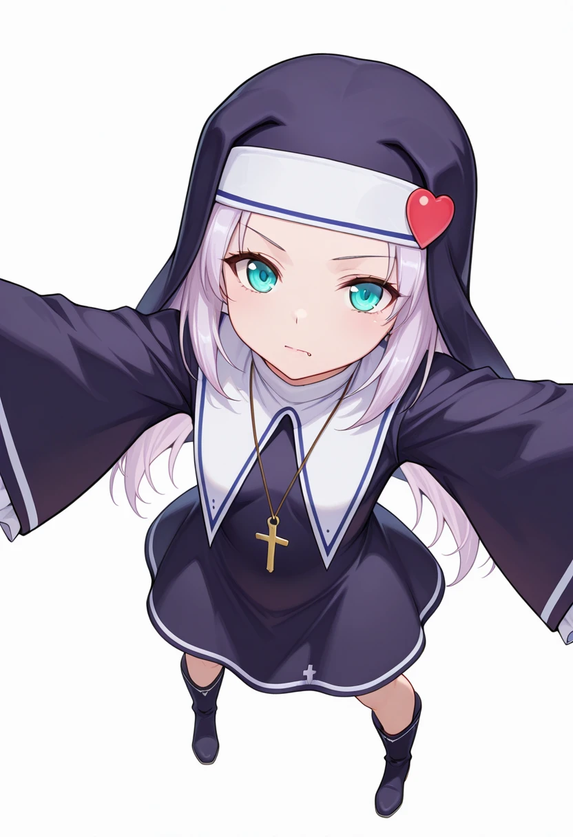 maria_cnr, 1girl,light purple hair, long hair, aqua eyes, fang, heart hair ornament,nun, habit,cross necklace,boots, wide sleeves,👗Default Outfit