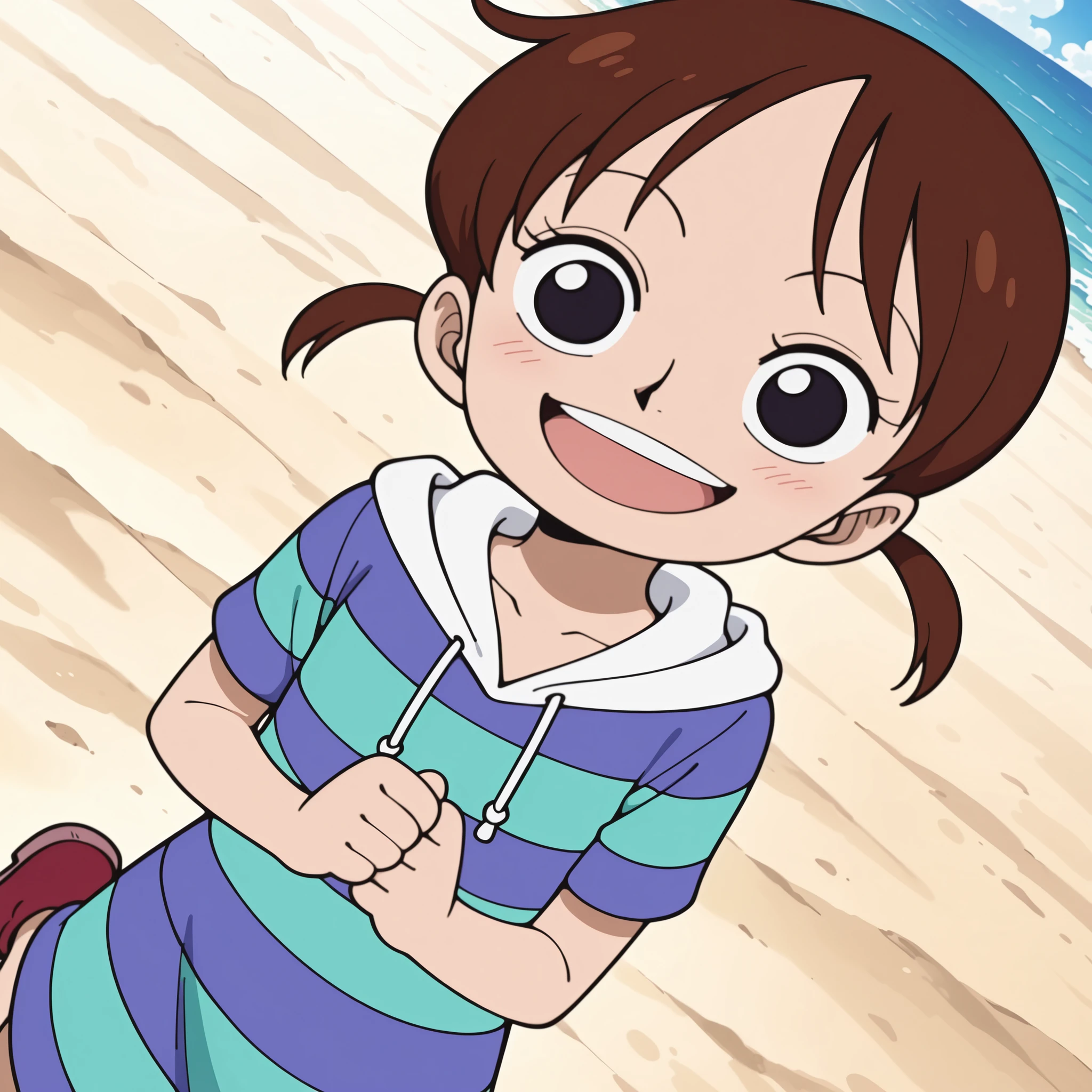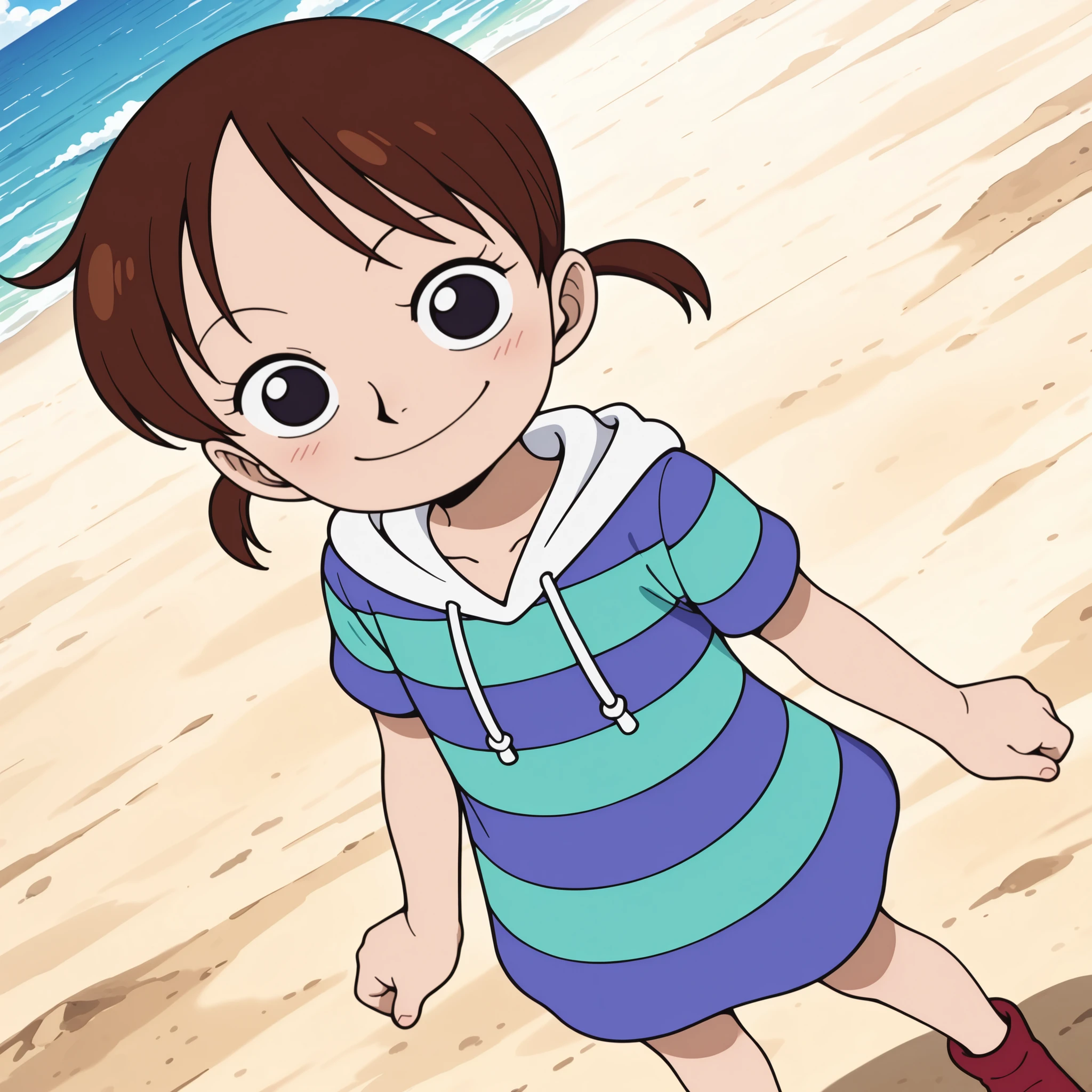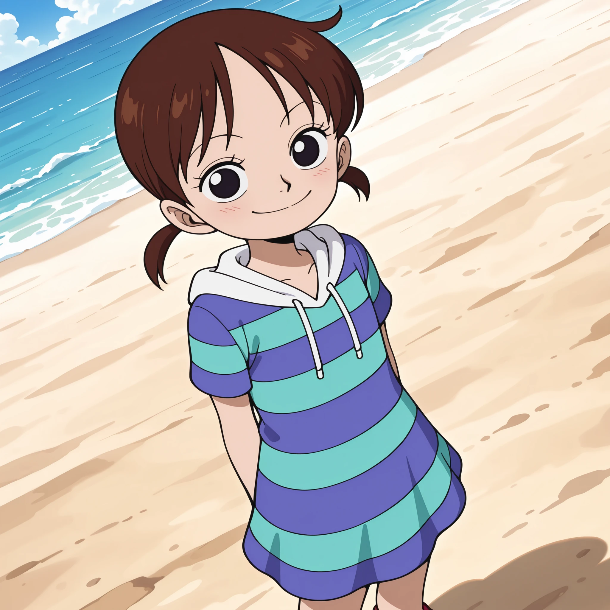 rika (one piece), black eyes, brown hair, twintails, striped dress, hood down, short sleeves, drawstring, red footwear
