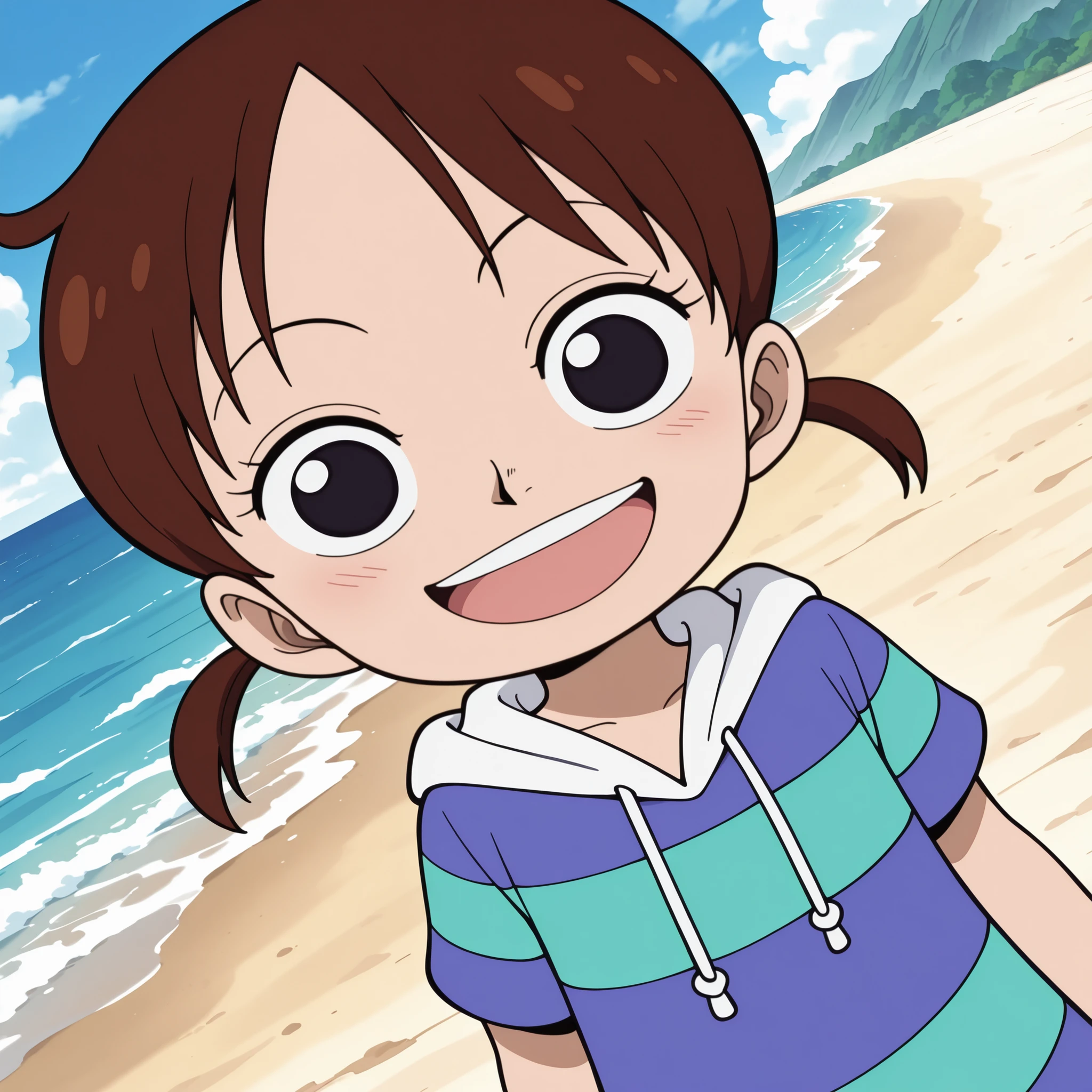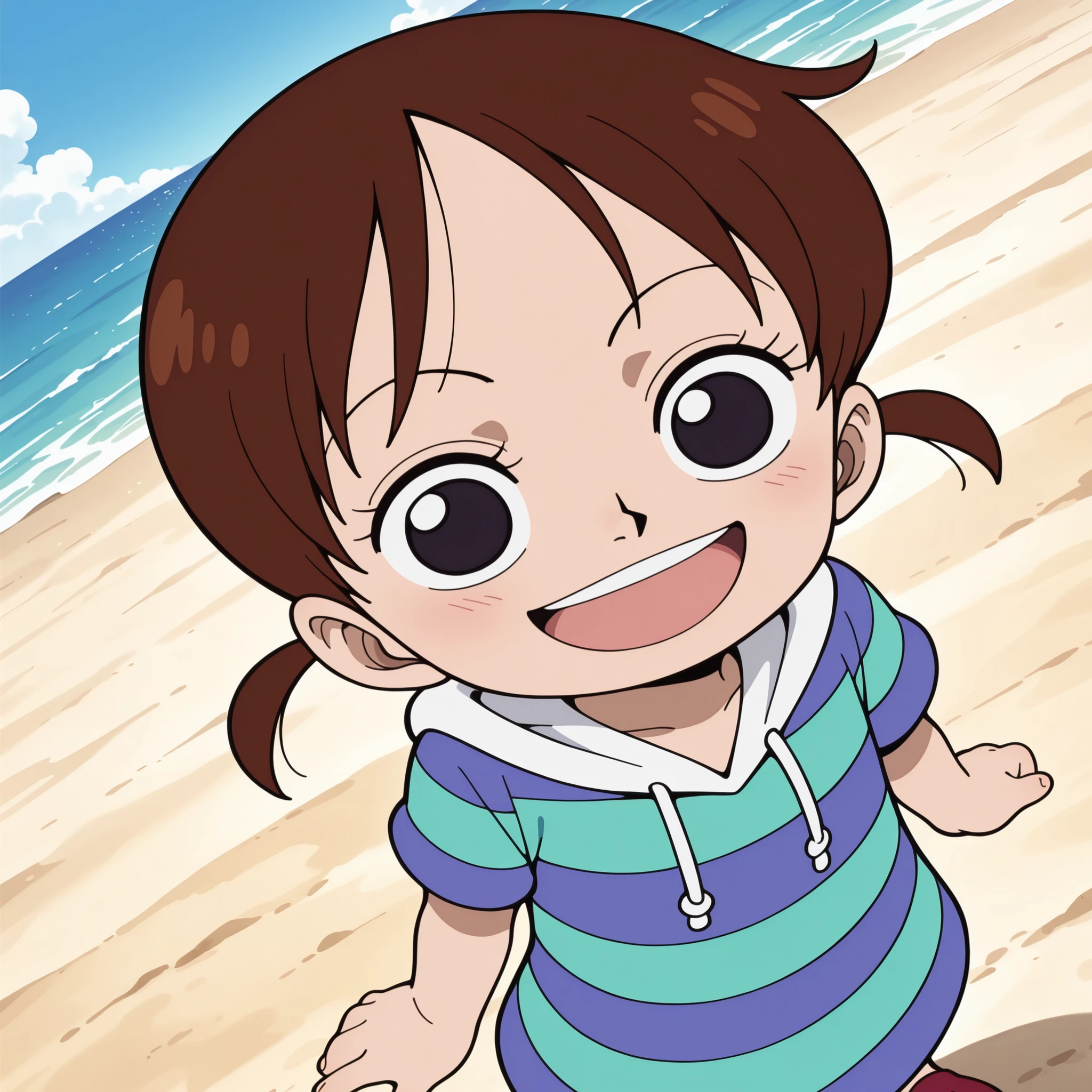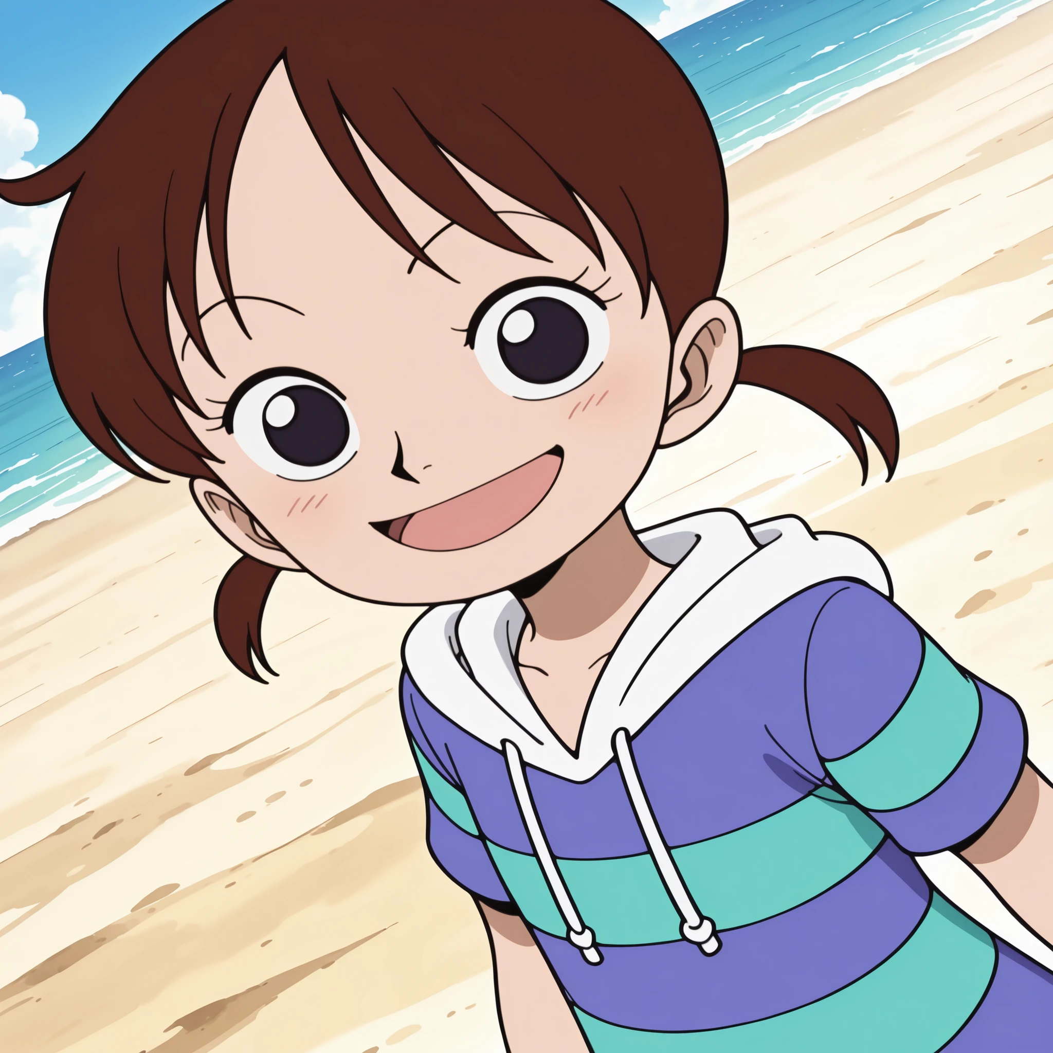 rika (one piece), black eyes, brown hair, twintails, striped dress, hood down, short sleeves, drawstring, red footwear