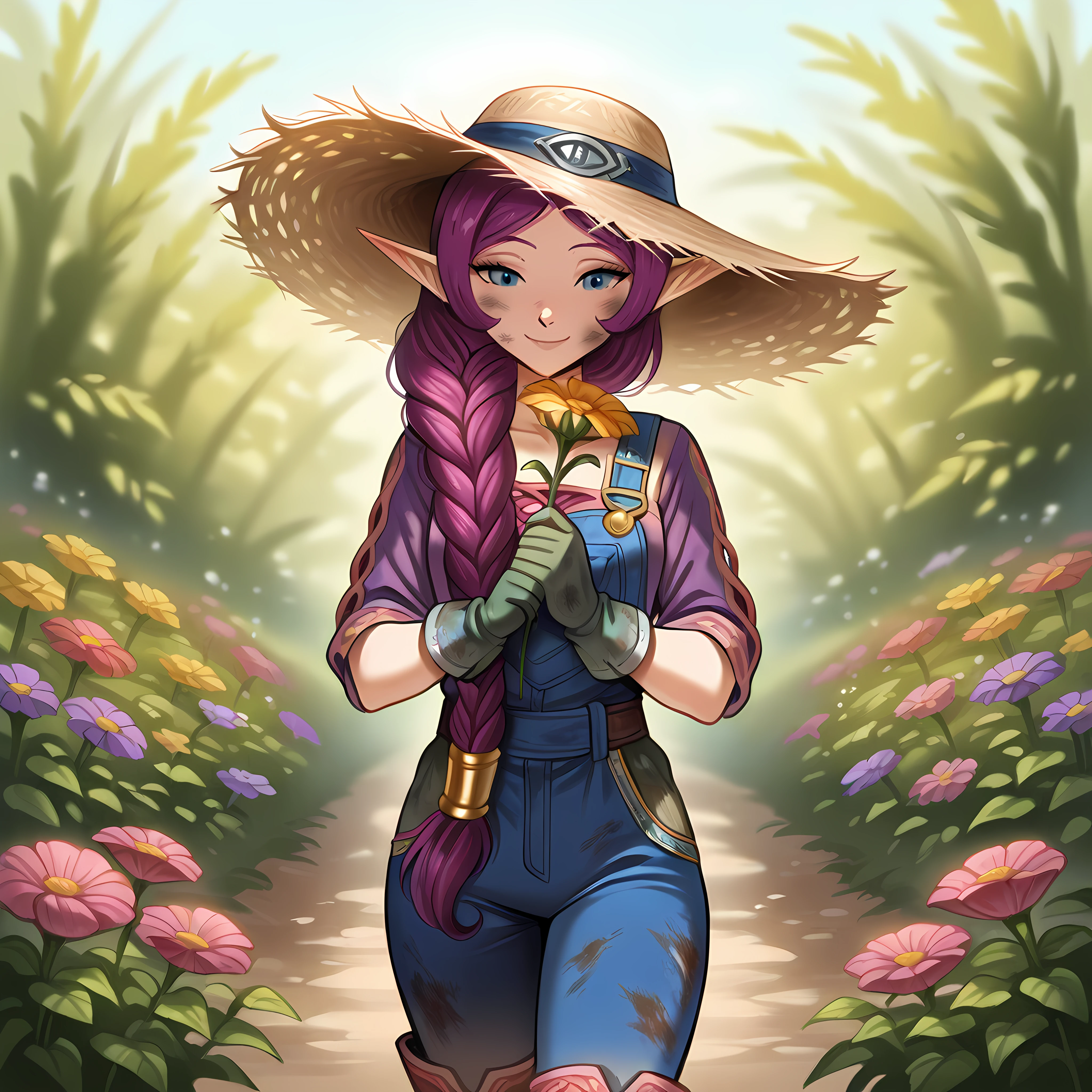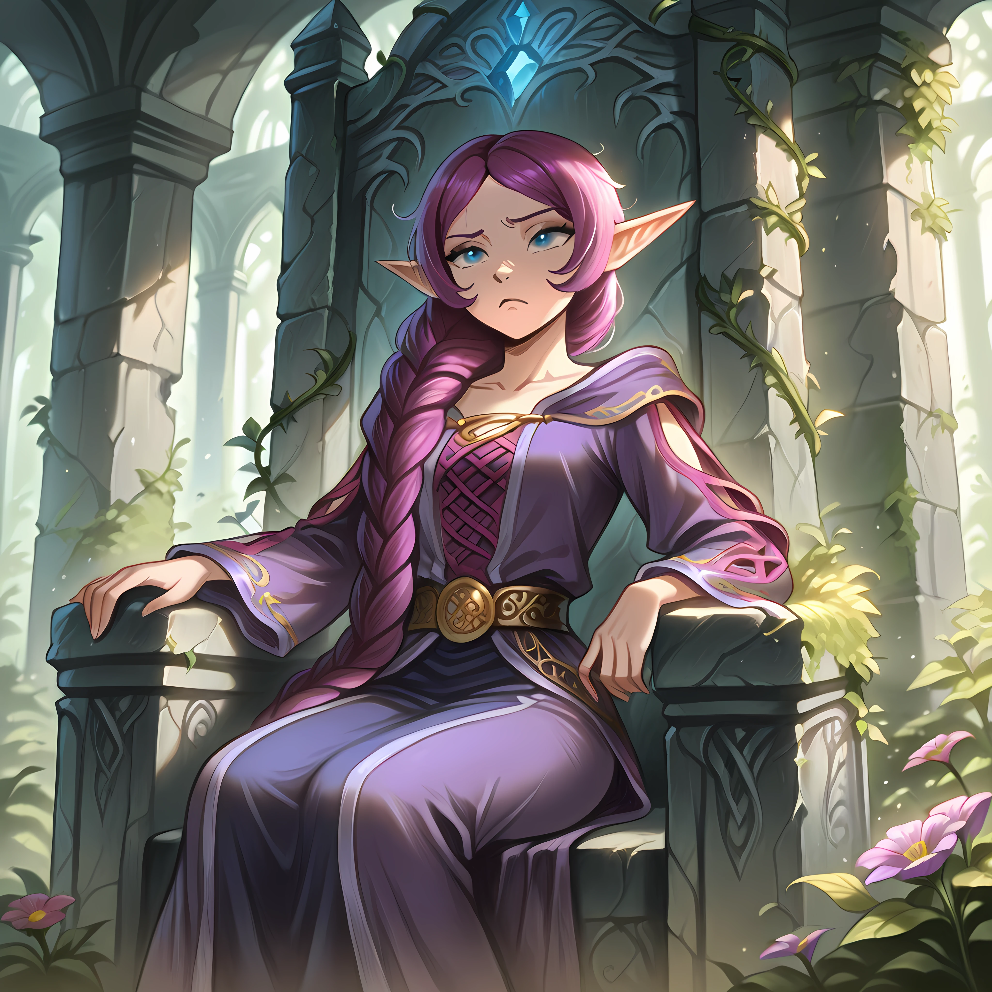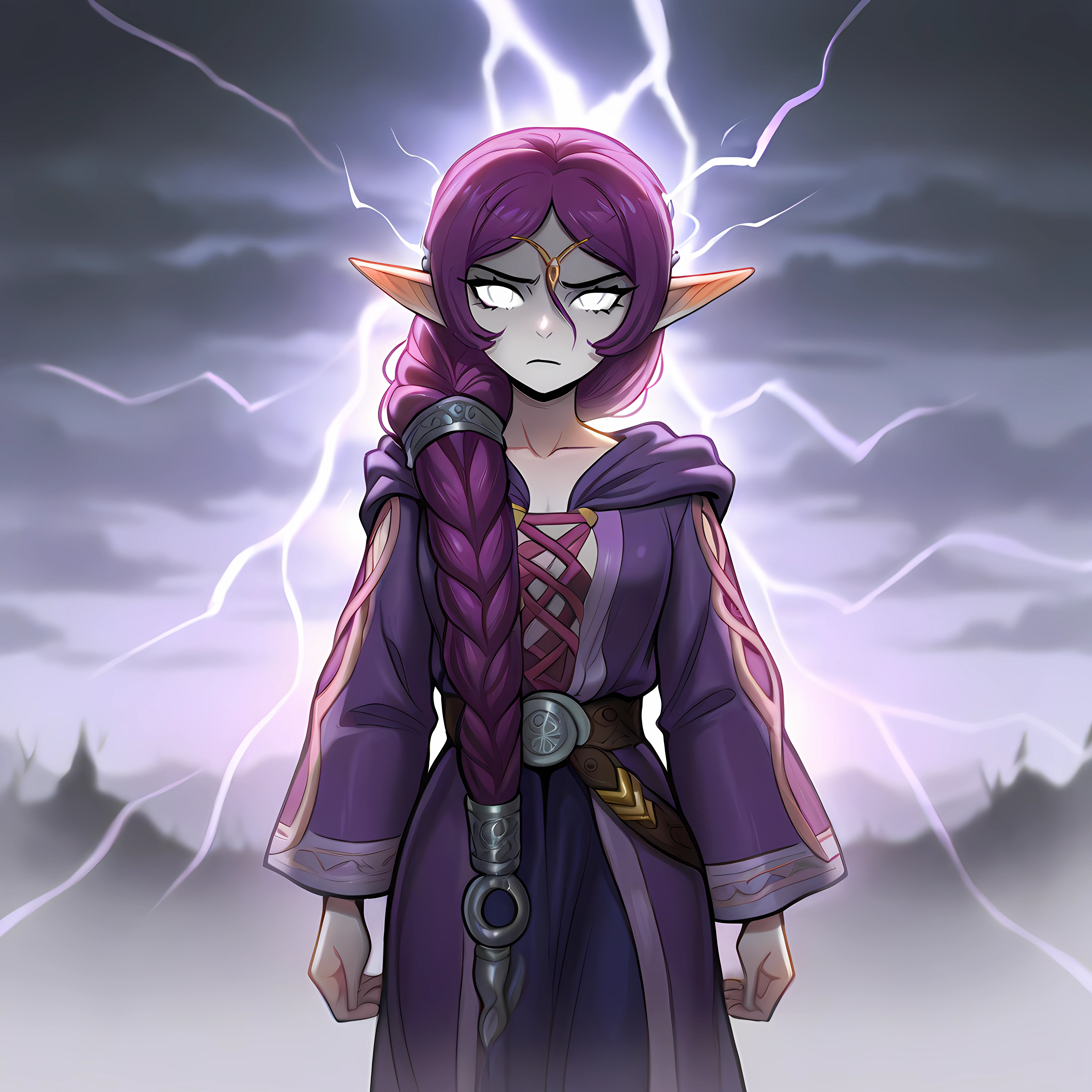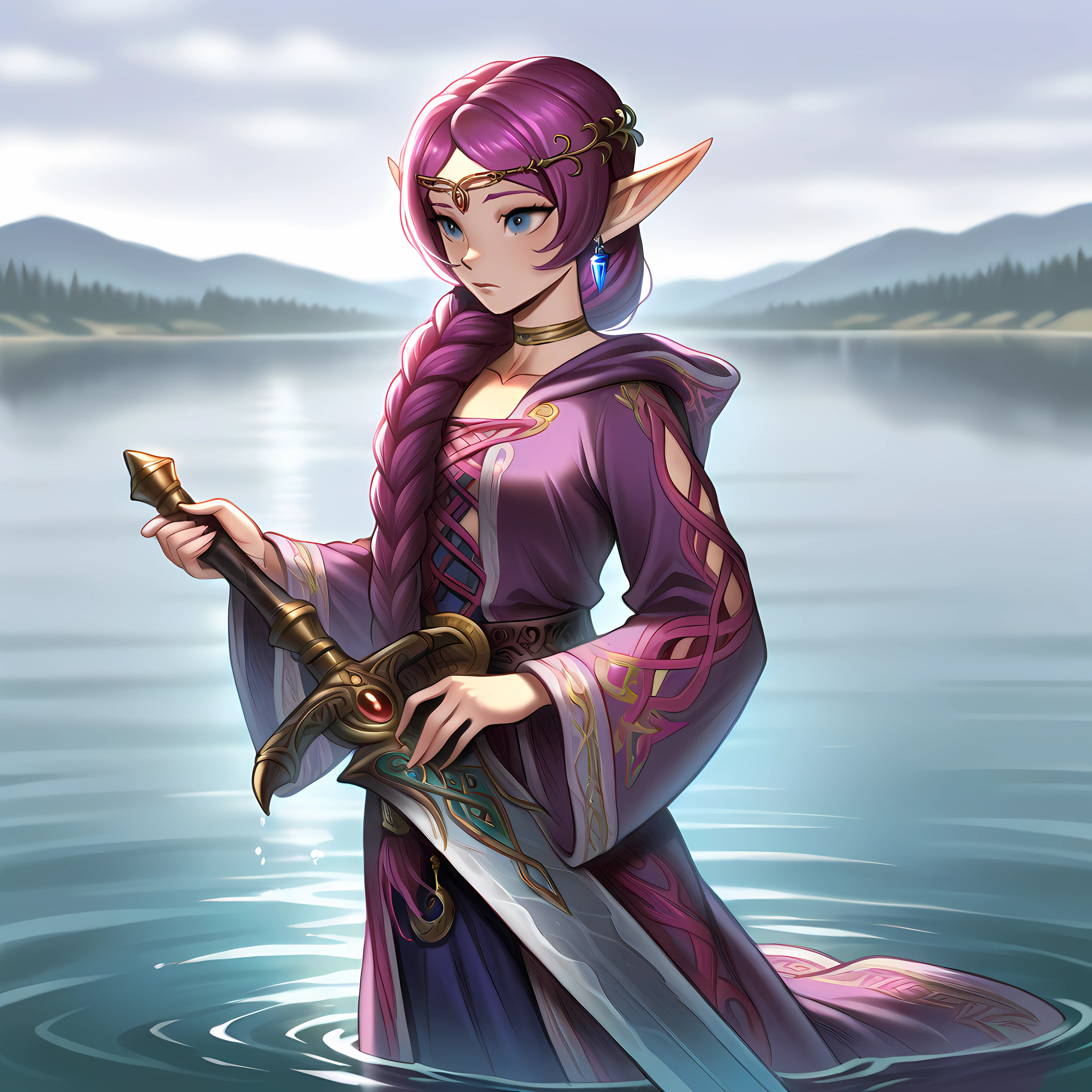 elf, blue eyes, pointy ears, purple hair, long hair, single braid, hair over shoulder, robe, hooded coat, long sleeves, smile, wide sleeves, jewelry, earrings, circlet, holding staff