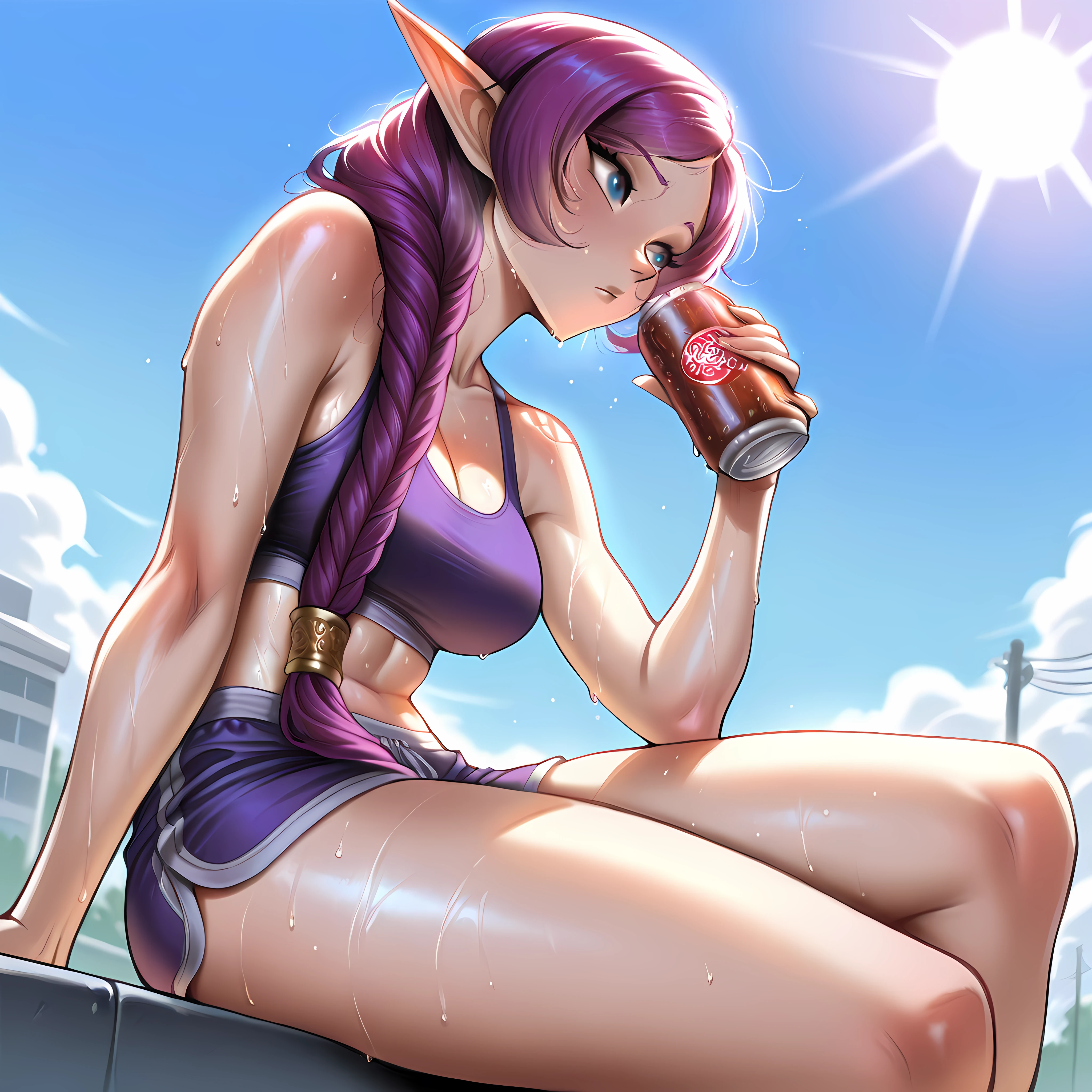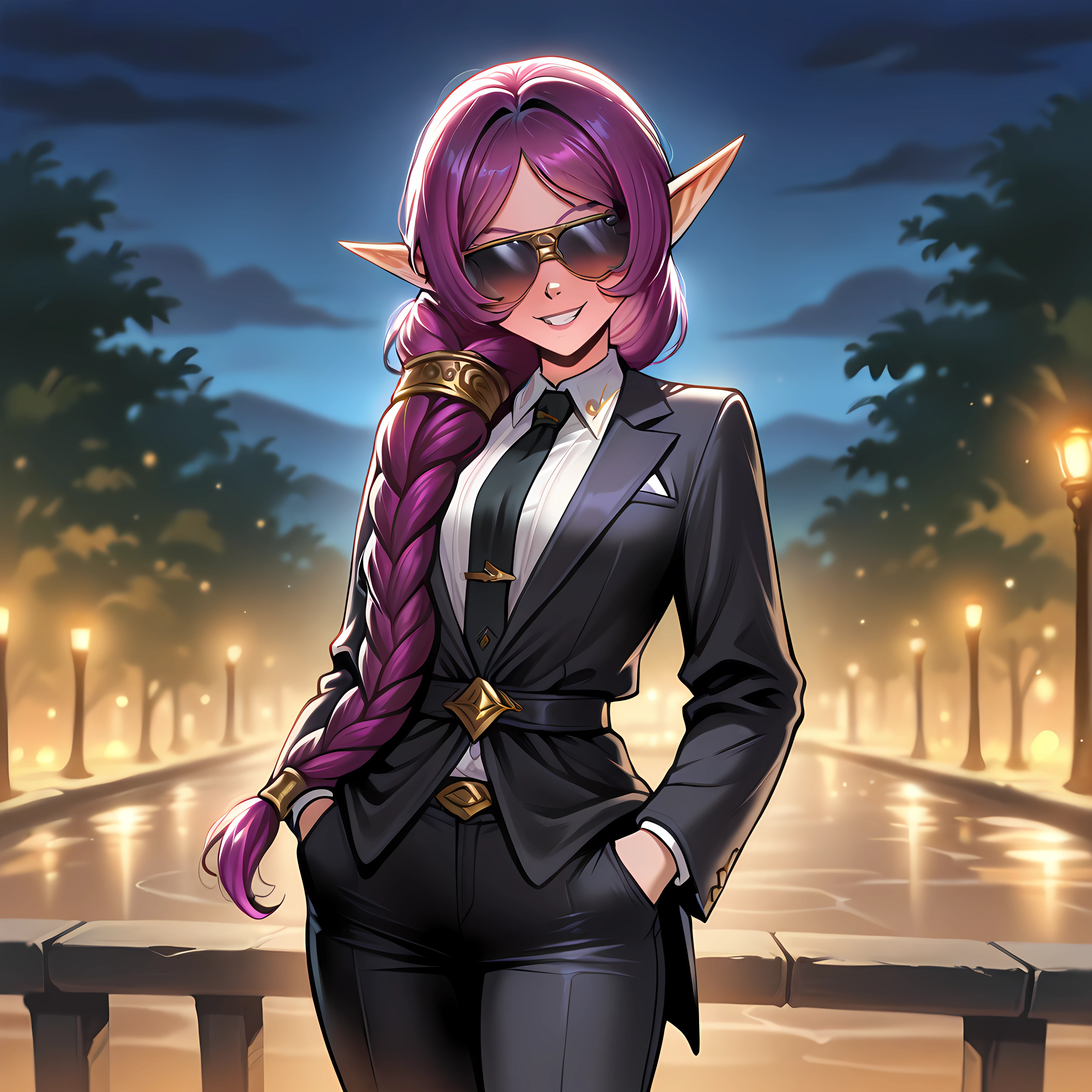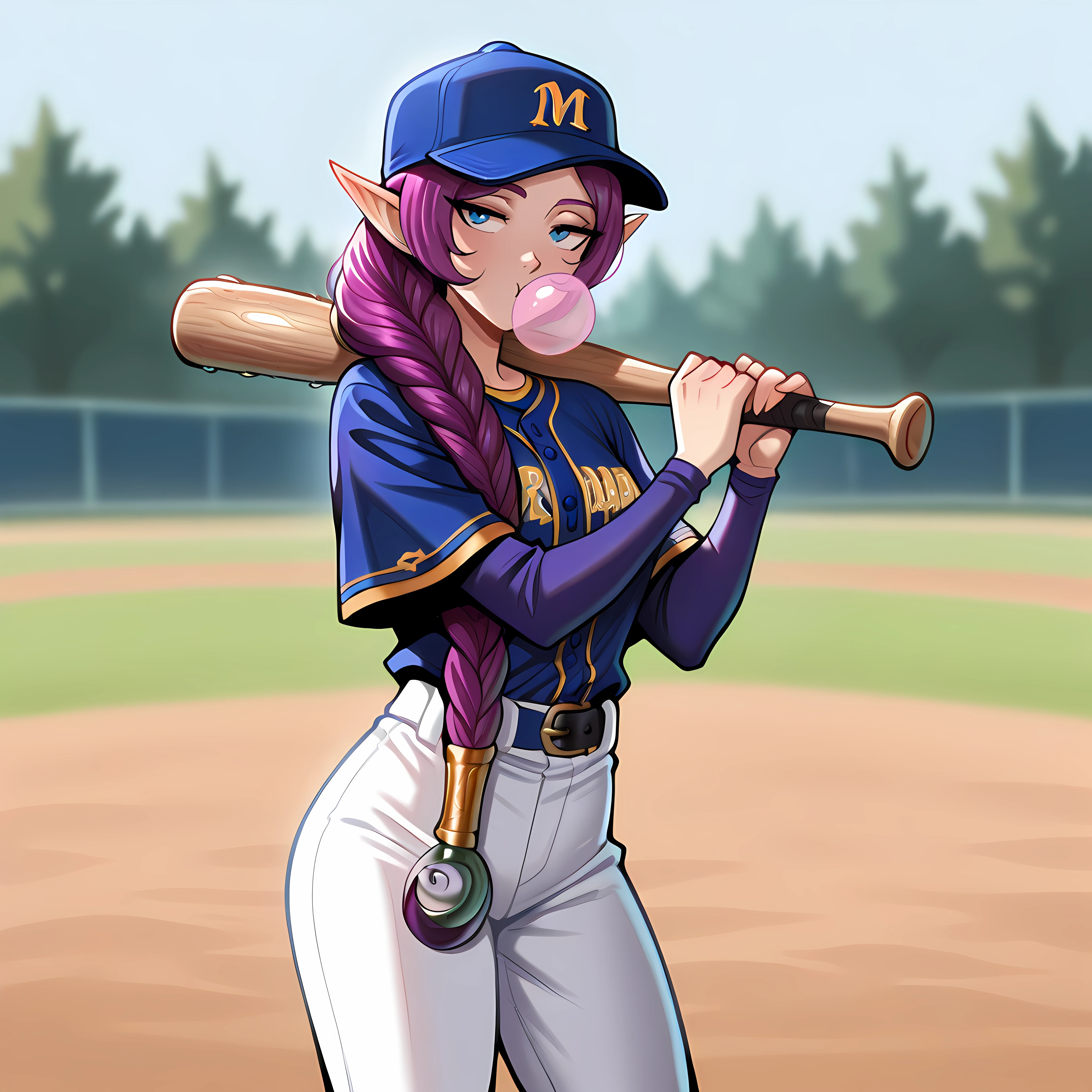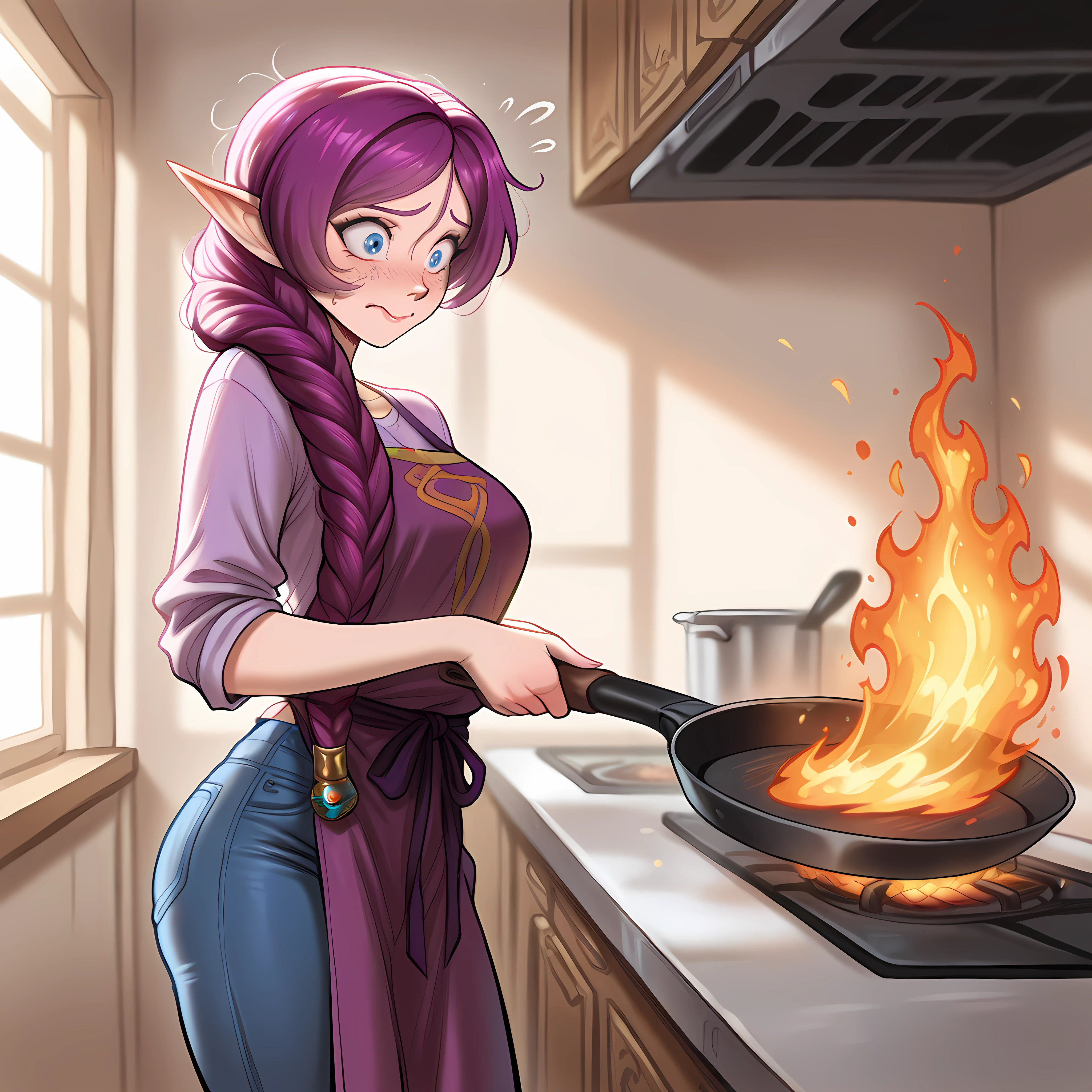 elf, blue eyes, pointy ears, purple hair, long hair, single braid, hair over shoulder, robe, hooded coat, long sleeves, smile, wide sleeves, jewelry, earrings, circlet, holding staff