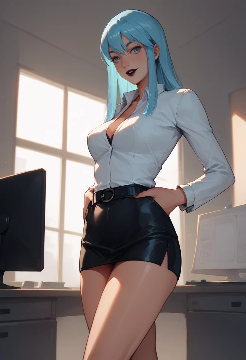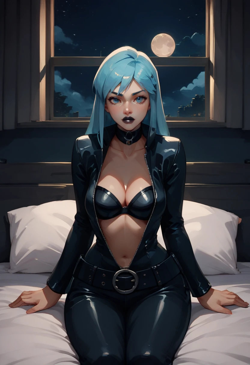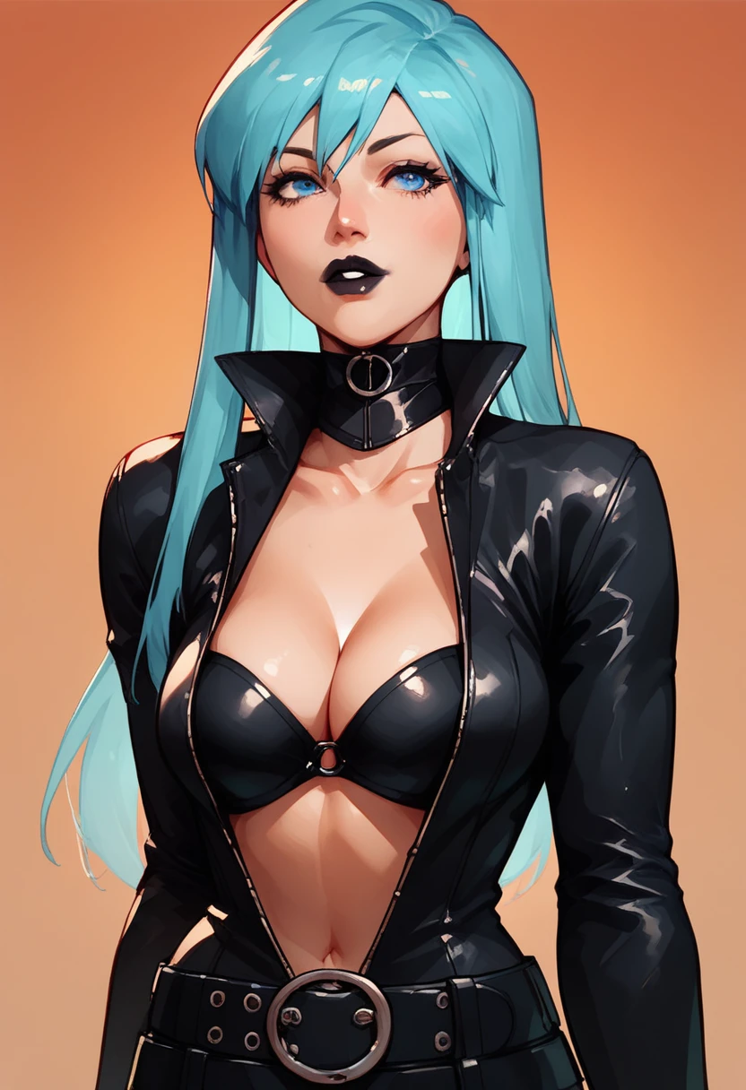 Nemissa, blue hair, blue eyes, black lipstick, choker, body suit, bra, partially unzipped, plunging neckline, belt, accessories, navel
