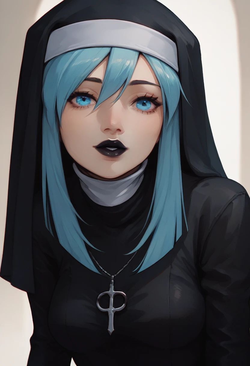 Nemissa, blue hair, blue eyes, black lipstick, choker, body suit, bra, partially unzipped, plunging neckline, belt, accessories, navel, black nails