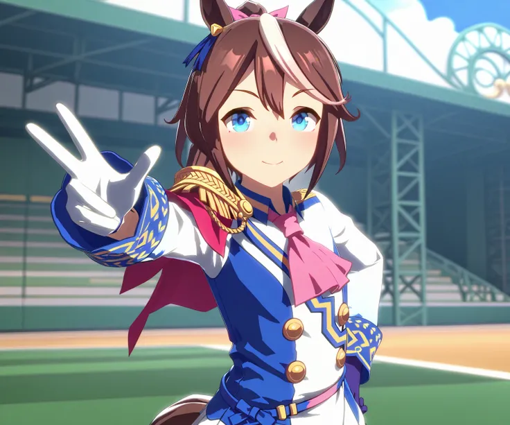 Default outfit is race uniform, but you can try different outfits too!