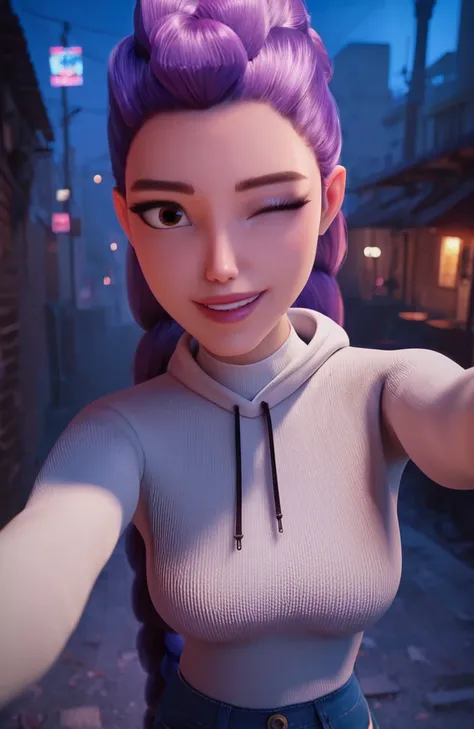 kpdh_rum1, purple hair,very long hair, brown eyes, braid, hair pulled back,