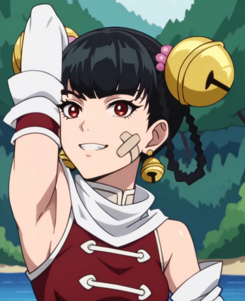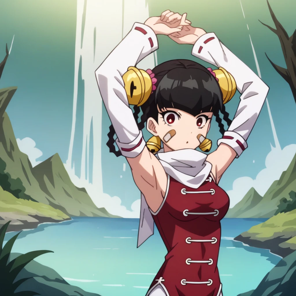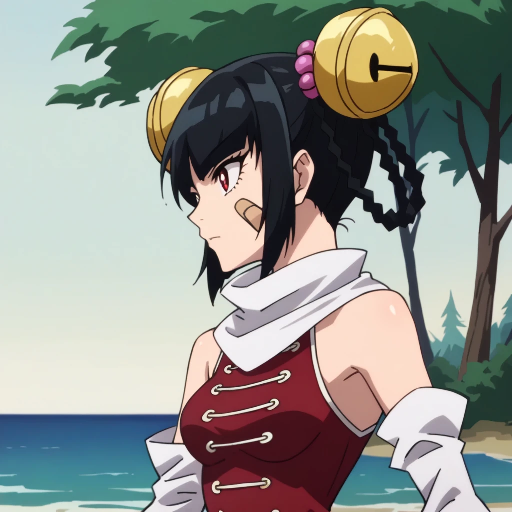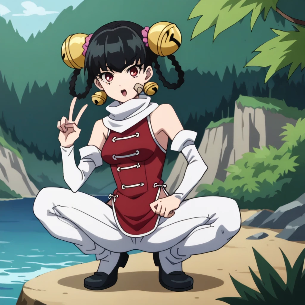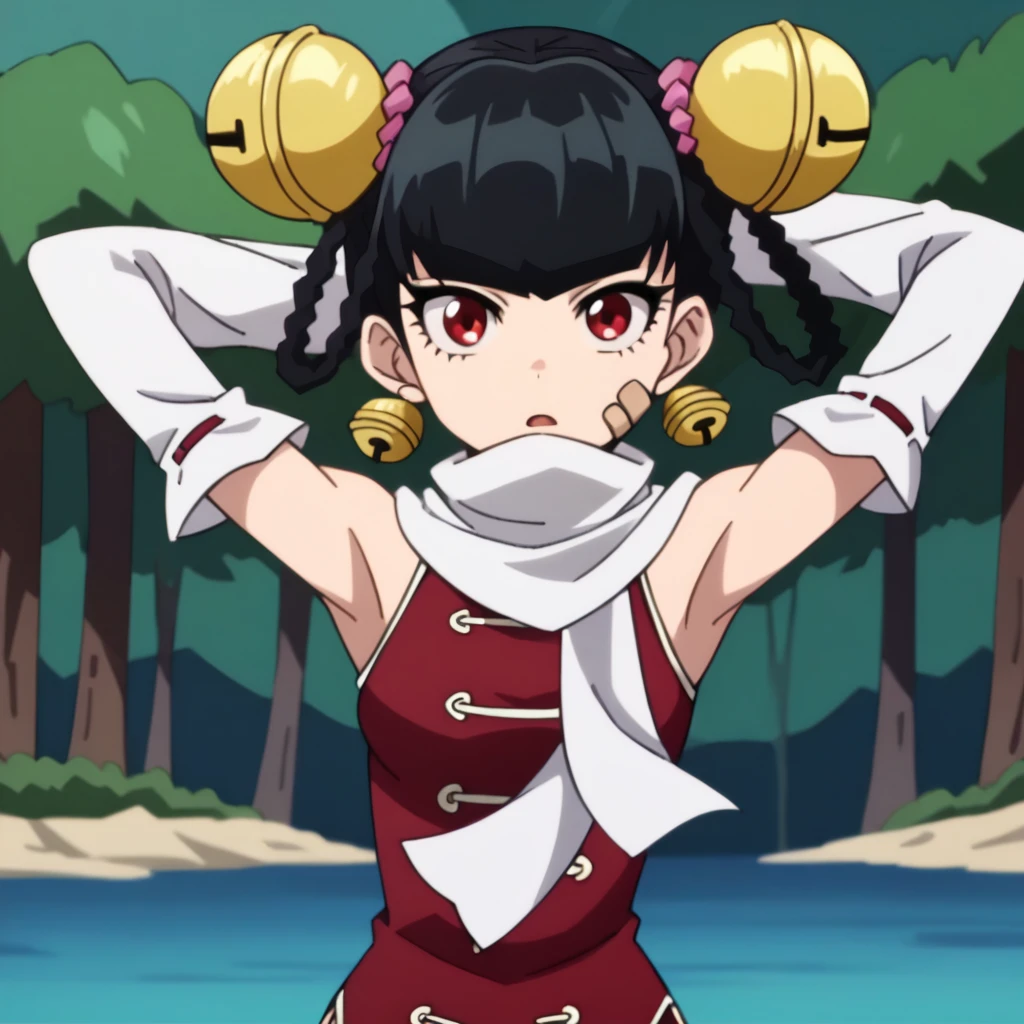 linlinopm, white scarf, china dress, detached sleeves, bare shoulders, hair bell, bandaid on face, red dress, white pants, white sleeves, black hair, red eyes