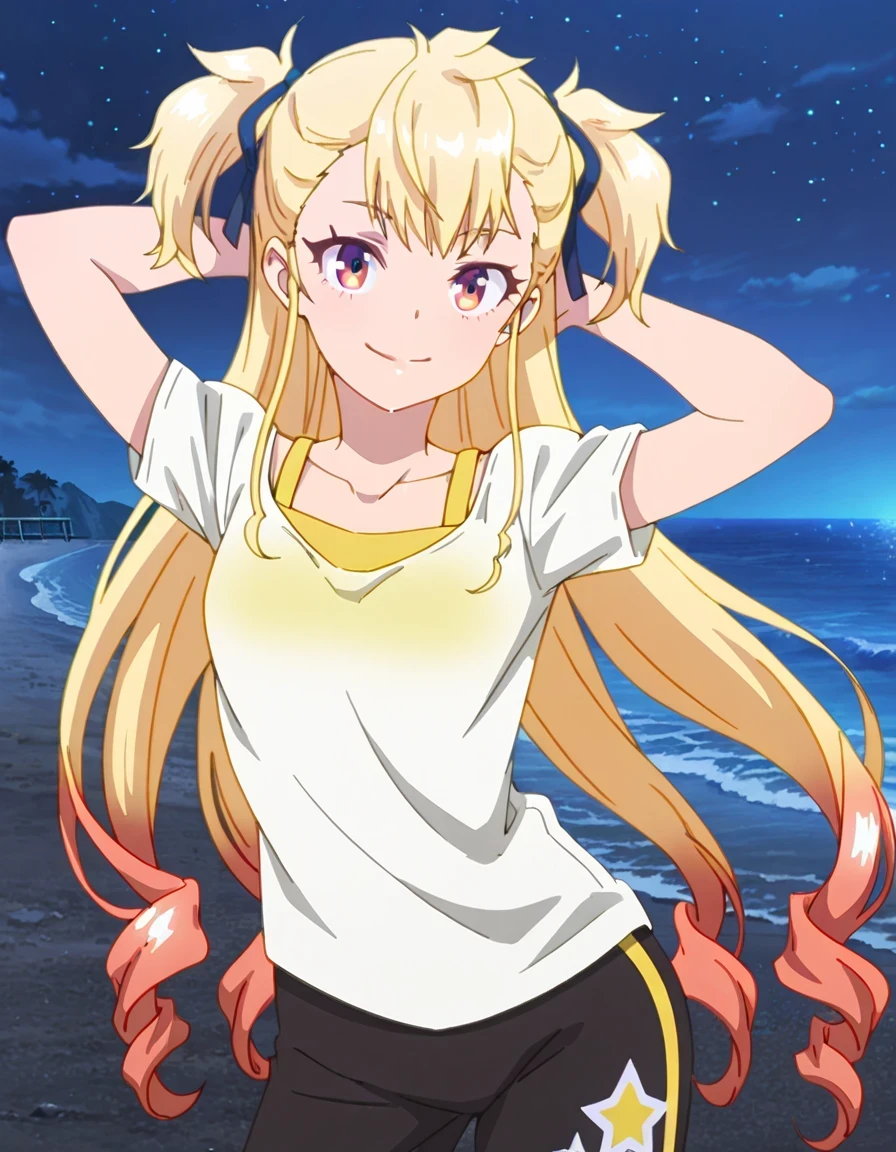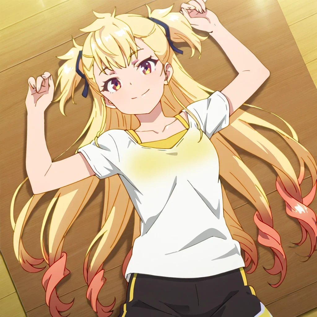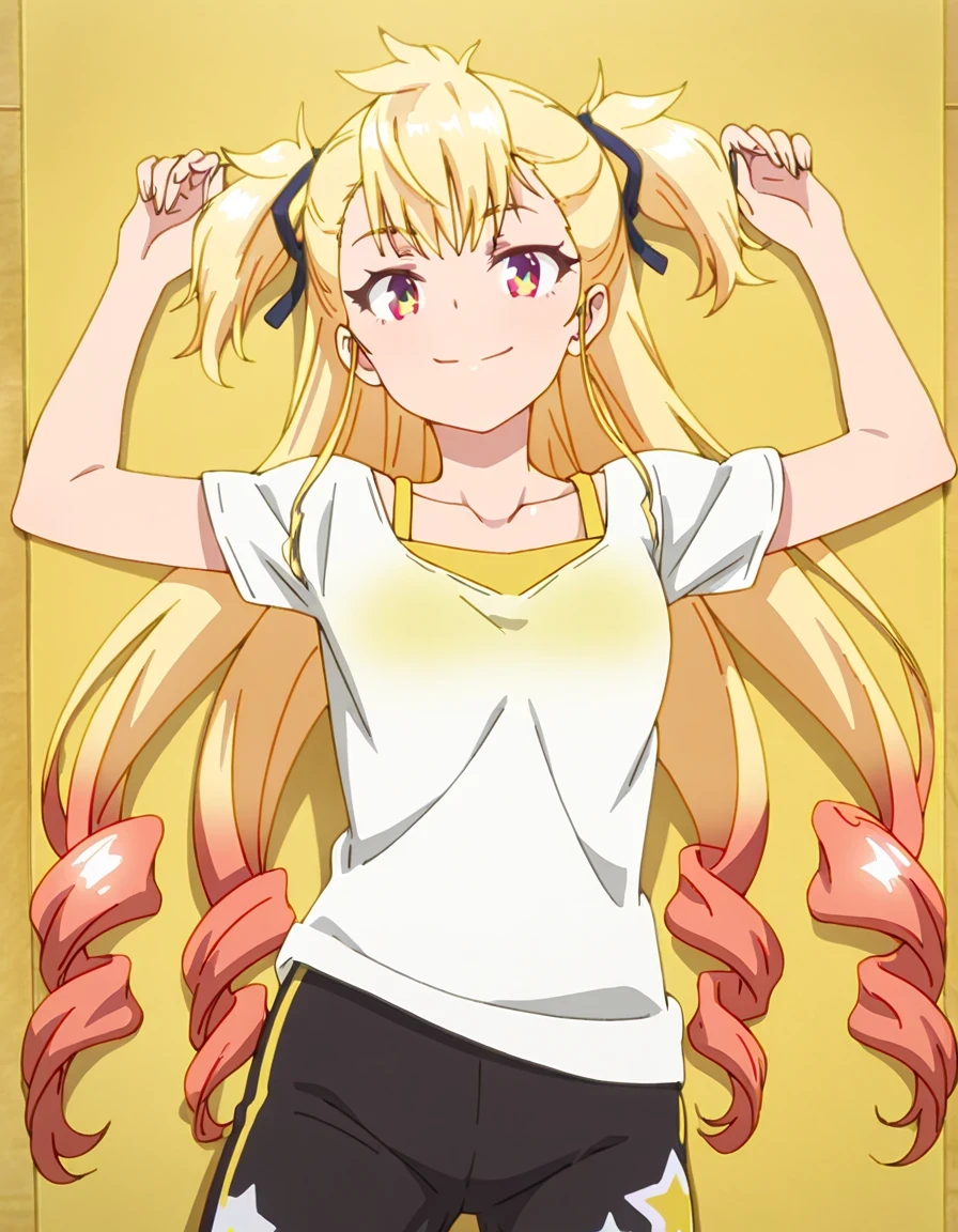 very long hair, two side up, twintails, sidelocks, two-tone hair, multicolored hair, gradient hair, blonde hair, red hair, hair ribbon, dark blue ribbon, red eyes, anime coloring