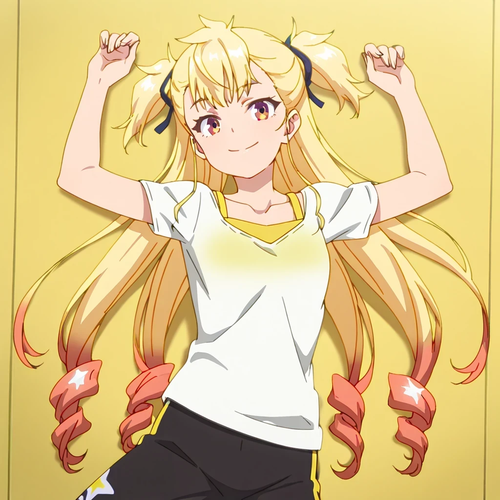 white shirt, bra visible through clothes, sports bra, bra strap, yellow bra, collarbone, single vertical stripe, star print, sweatpants, black pants, yellow footwear