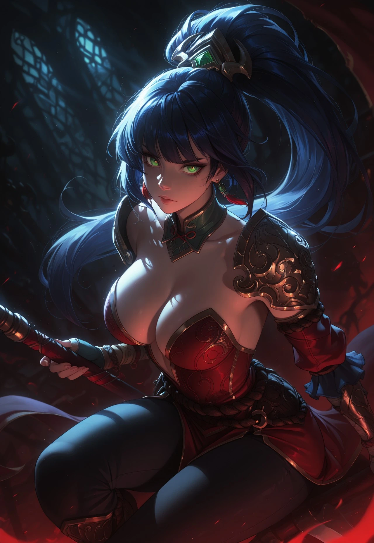 WKnidalee,dark blue hair,long hair,bangs,ponytail,hair ornament,green eyes,earrings,shoulder pads,multicolored dress,detached sleeves,