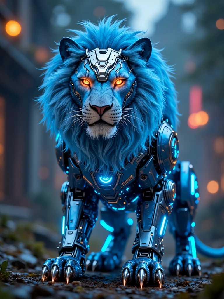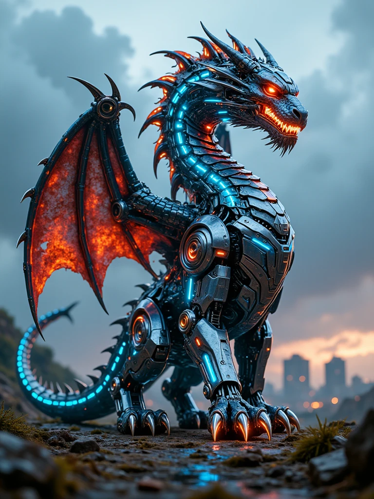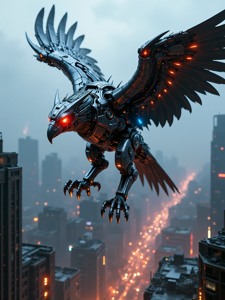 A towering cybernetic eagle, its metallic feathers forged from polished obsidian and iridescent chrome, glides silently through a neon-drenched sky above a sprawling dystopian metropolis. Its eyes pulse with crimson bioluminescence, scanning the cityscape with predatory precision, each flicker revealing intricate circuitry beneath synthetic avian skin. Wings span wide like hydraulic girders, their edges lined with razor-sharp energy blades that hum faintly with stored plasma power. Jagged servos click and whir as it maneuvers through storm-lit clouds, while glowing data streams flow across its spine like living code. The air crackles with static, carrying the scent of ozone and burnt circuitry, as the mechanical predator descends toward a crumbling skyscraper, its shadow stretching across rain-slicked streets below.