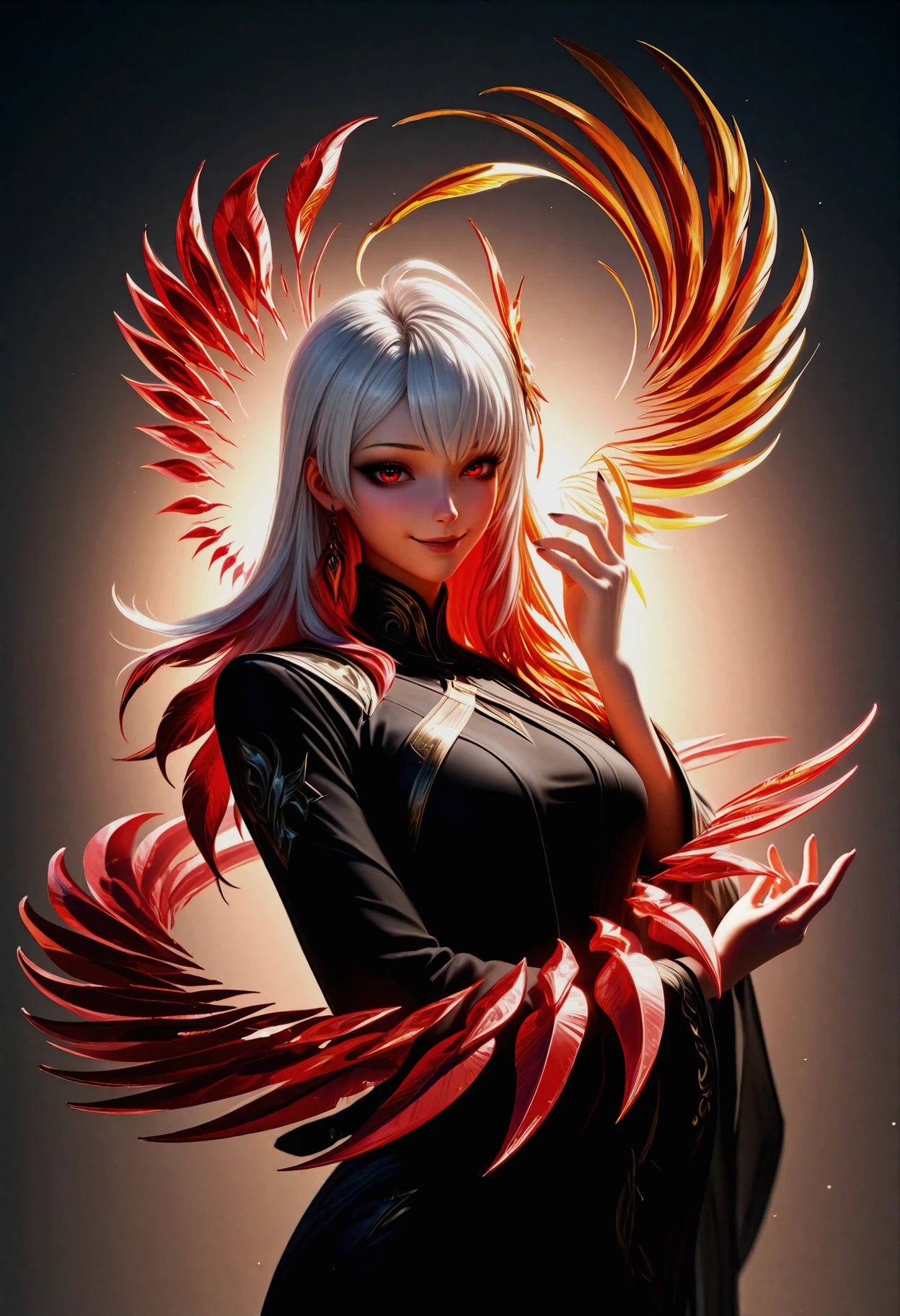 • 描述:左侧银白长发 + 右侧暗红挑染,佩戴凤凰羽发簪, 鎏金瞳孔。