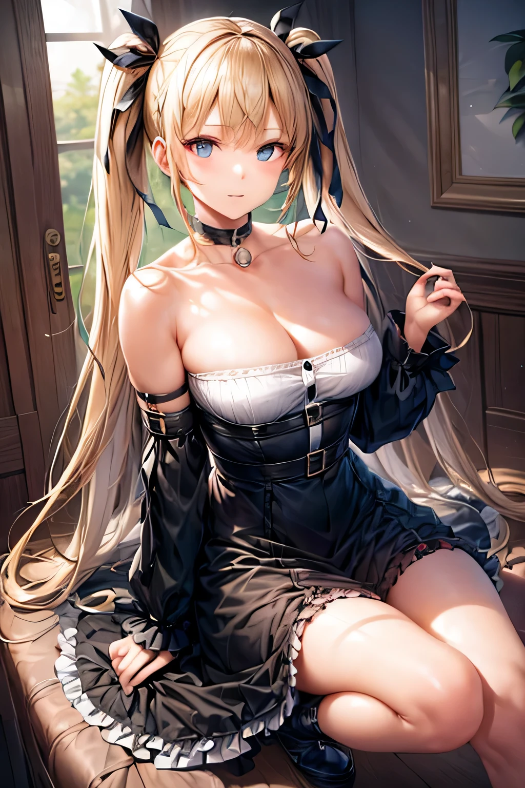marie_a, blonde hair, twintails, long hair, blue eyes, x hair ornament, hair ribbon,