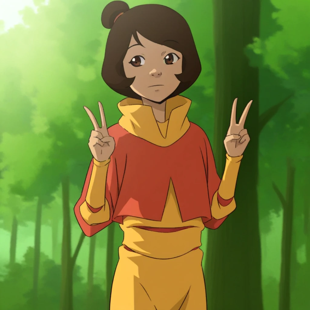 jinora_k, 1girl, short hair, brown hair, single hair bun, brown eyes, monk clothes