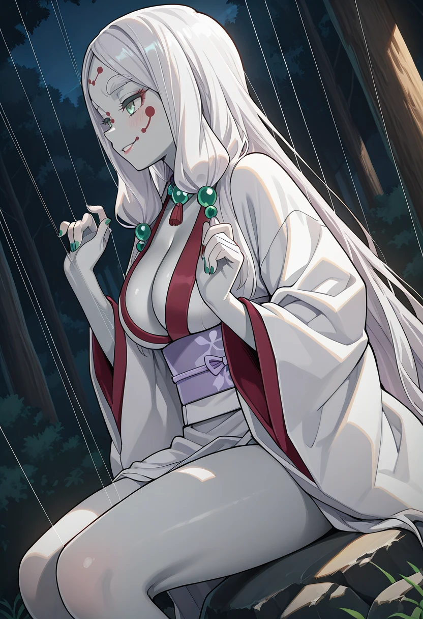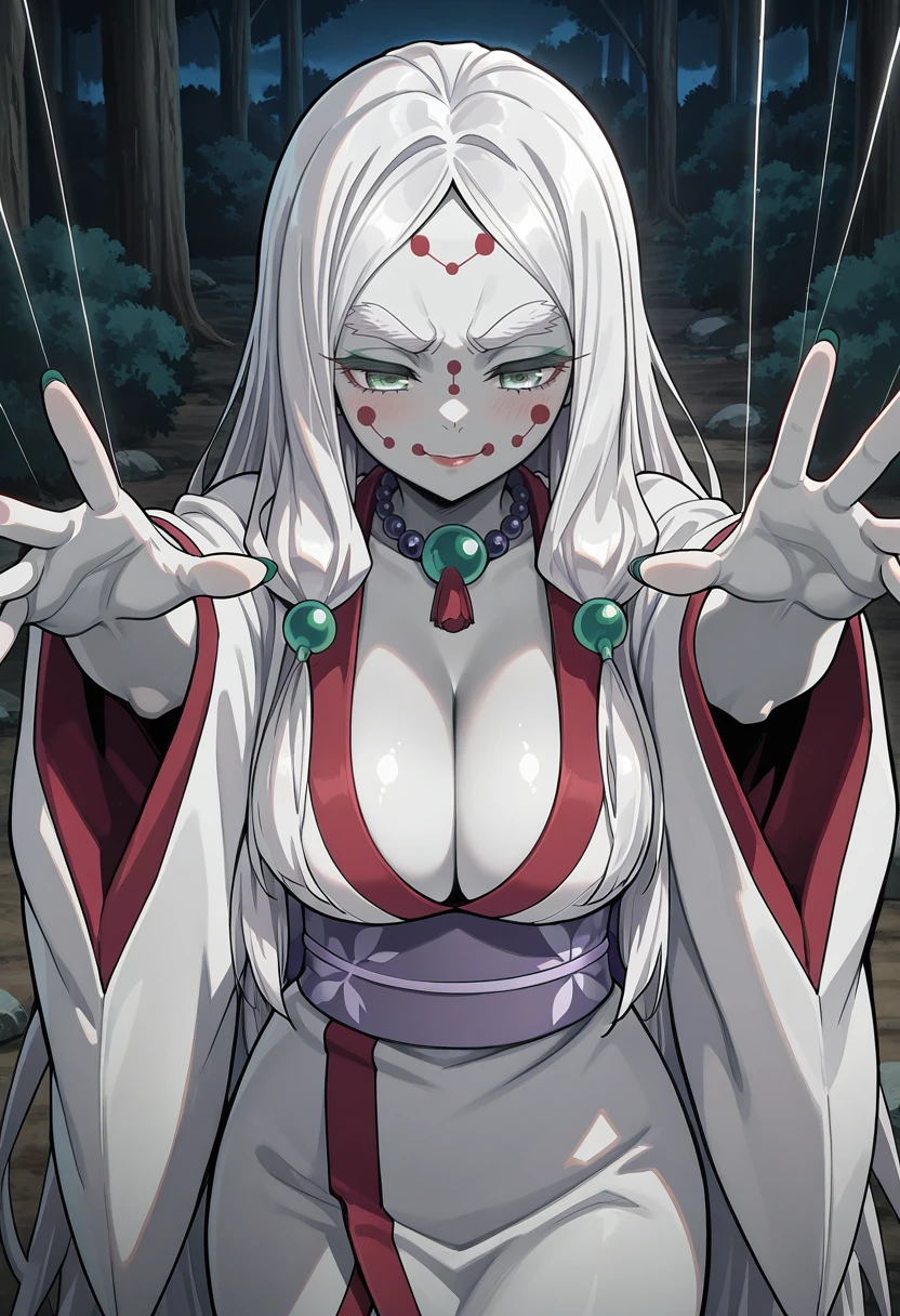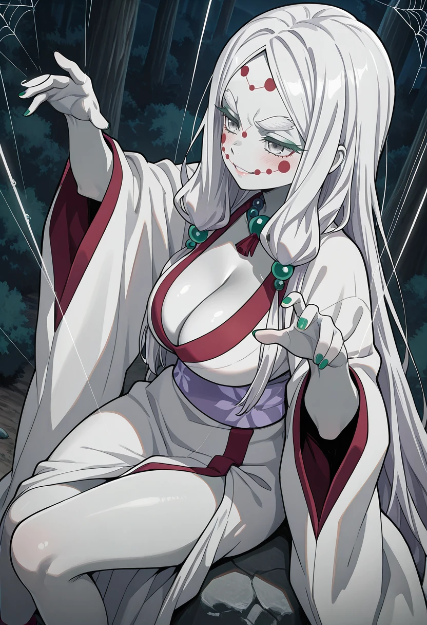 spiderdemon, 1girl, solo, very long hair, white hair, thick eyebrows, forehead mark, bluish gray eyes, facial mark, colored skin, white skin, hair ornament, hair beads, large breasts, curvy, large hips, jewelry, necklace, collarbone, cleavage, nail polish, green nails, japanese clothes, white kimono, pale purple sash, wide sleeves, long sleeves, red anklets, barefoot, green toenails, puppet strings, Spider Demon Mother (Human)
